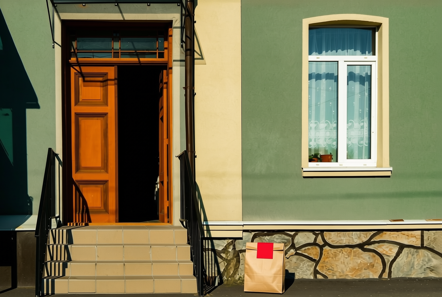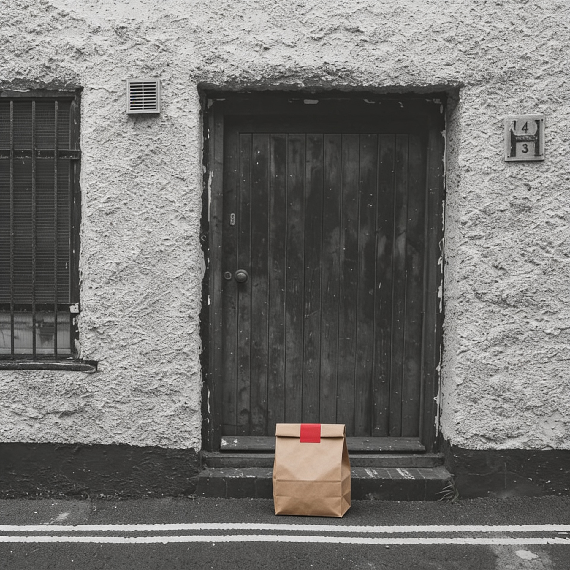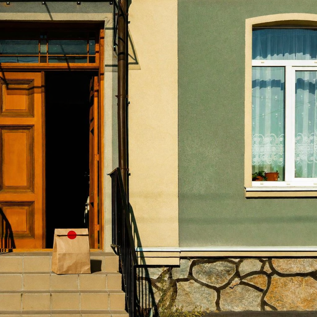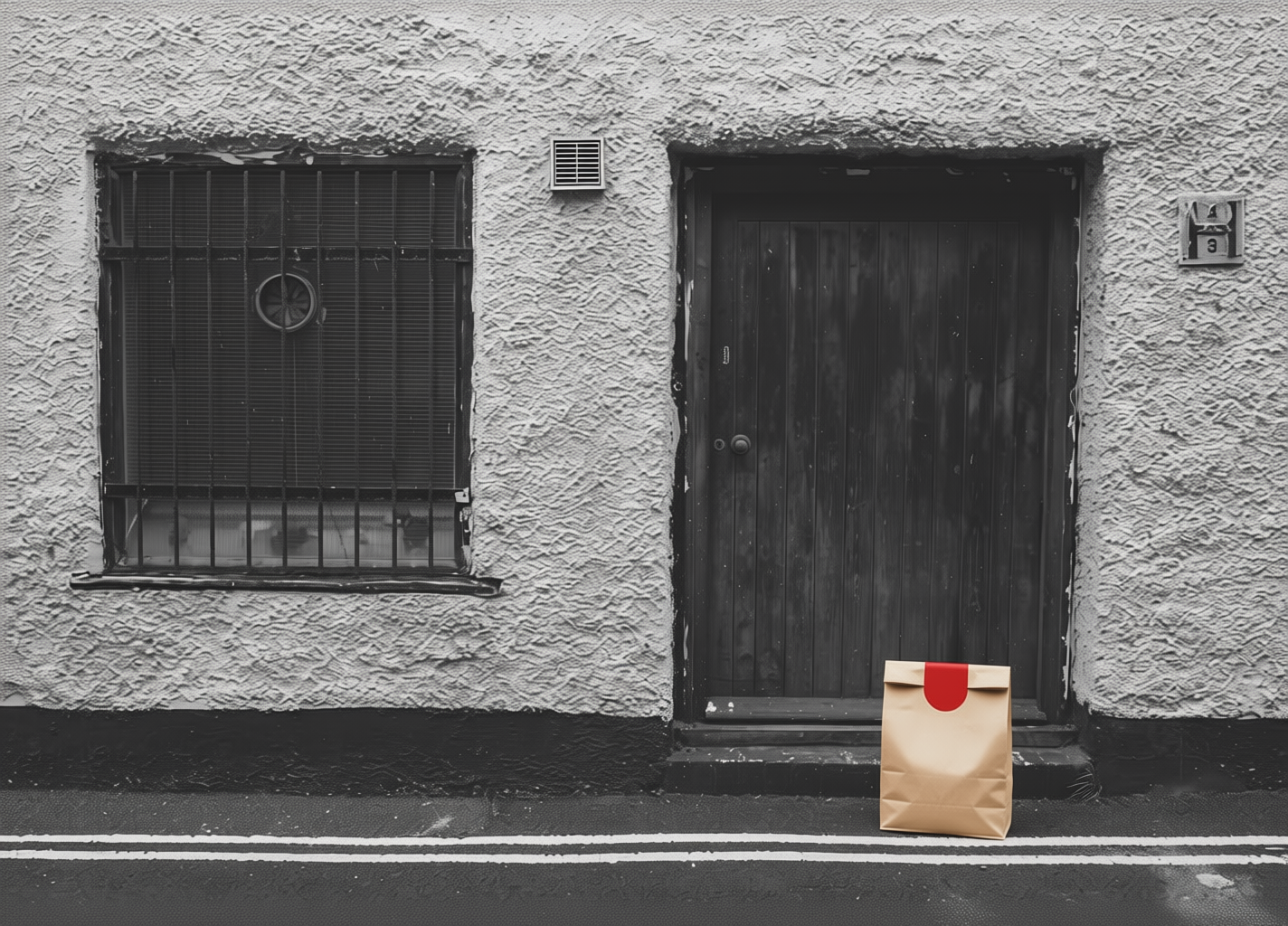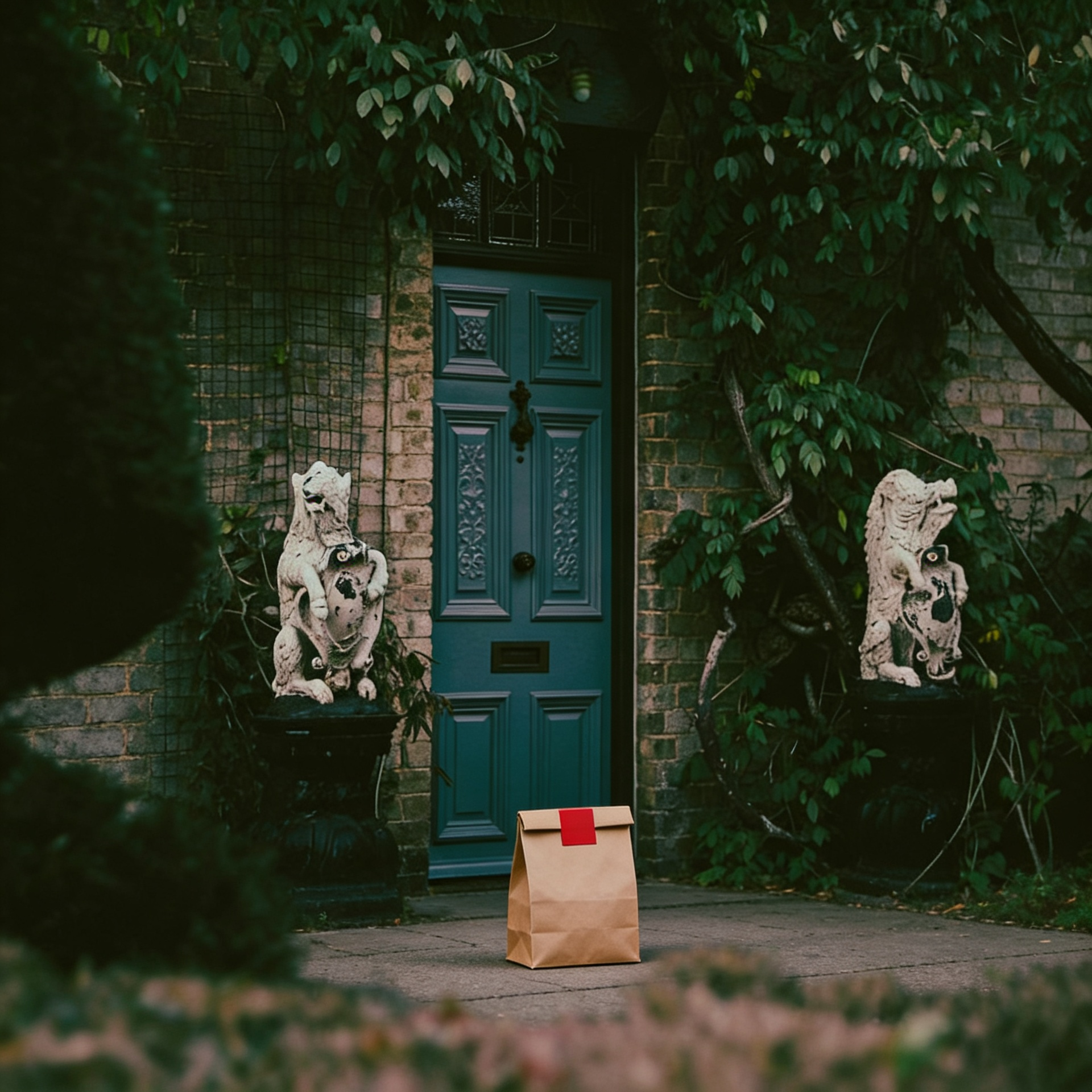 “In this existing photo, add a food delivery paper bag on the ground right in front of the door. The bag should be a small brown paper bag with a solid plain red sticker on the top keeping it closed. Preserve existing photo style and lighting as much as possible.”