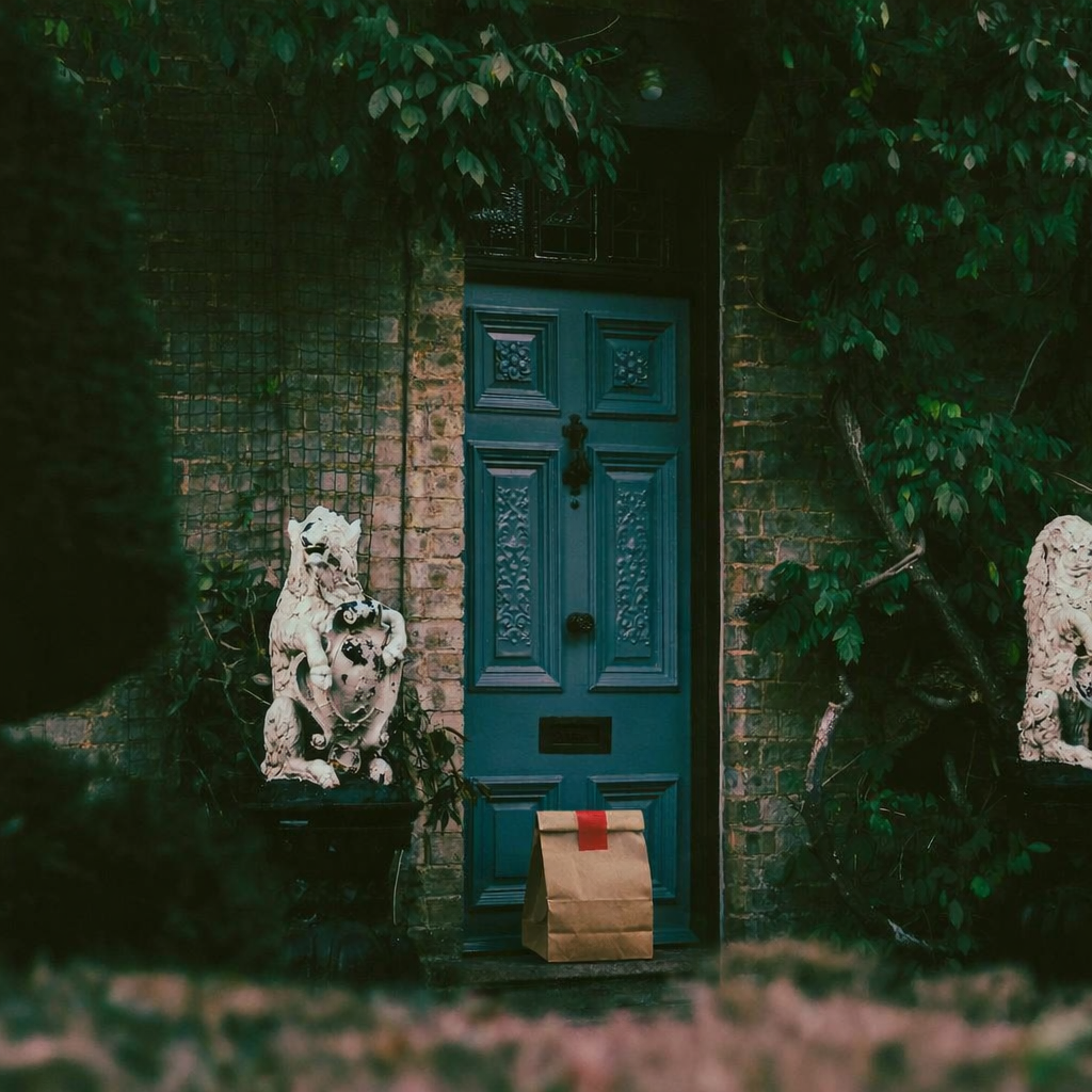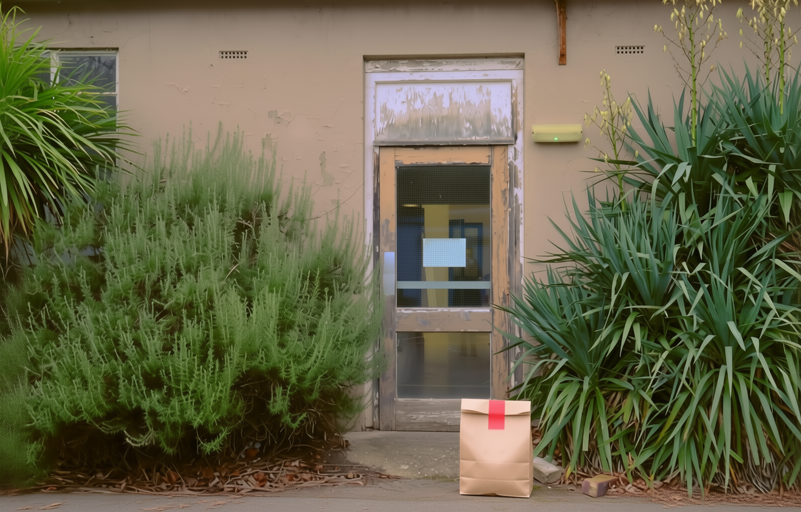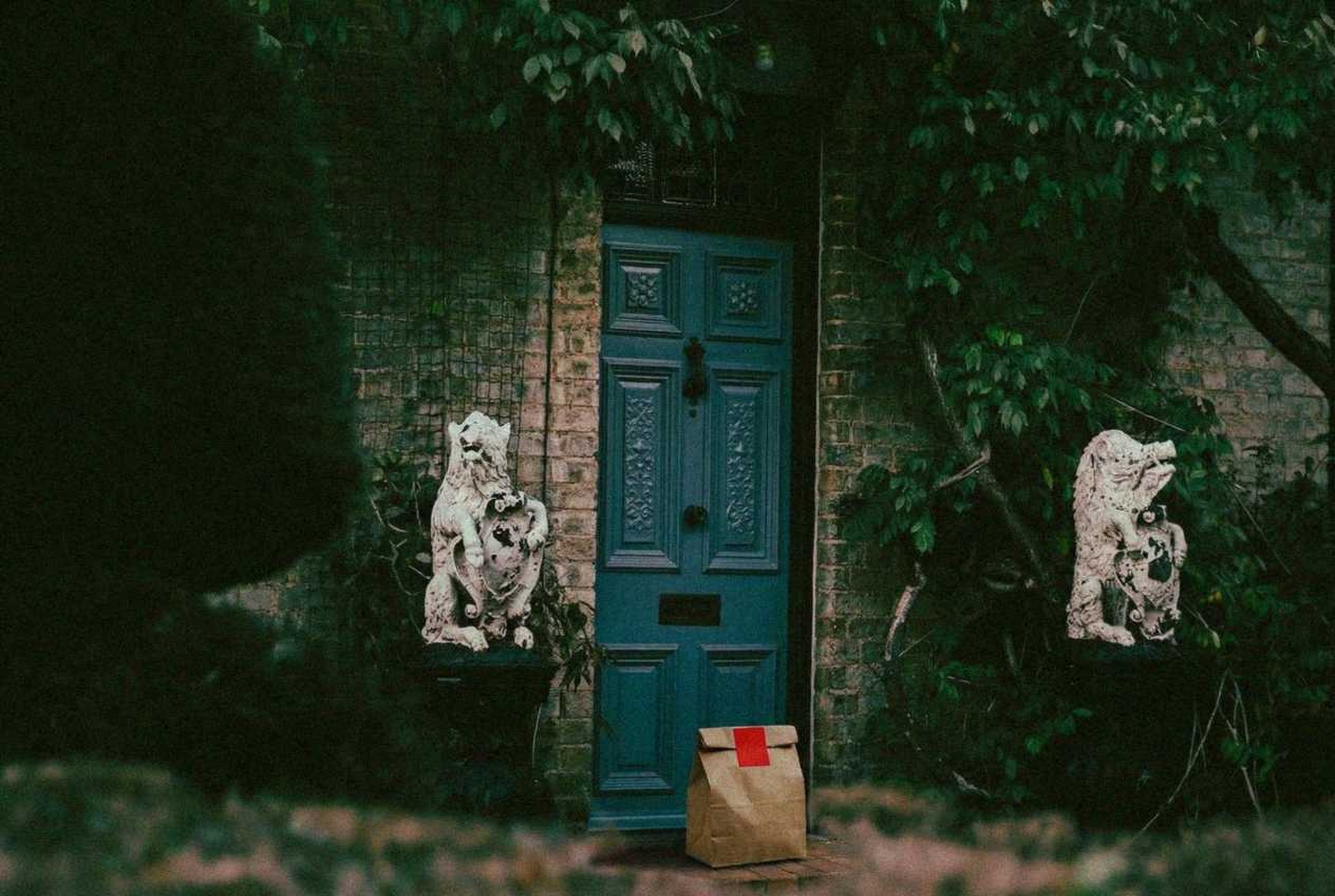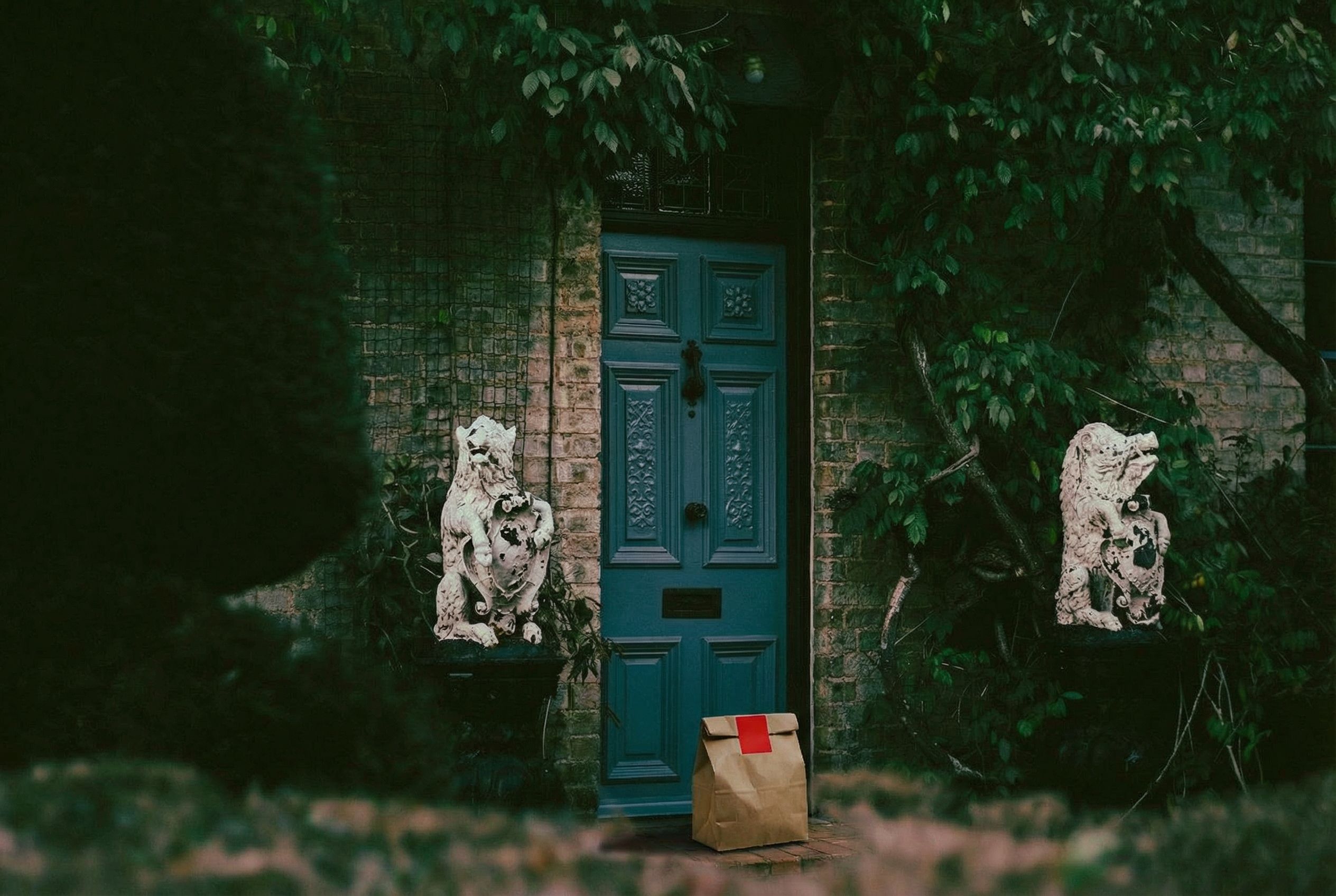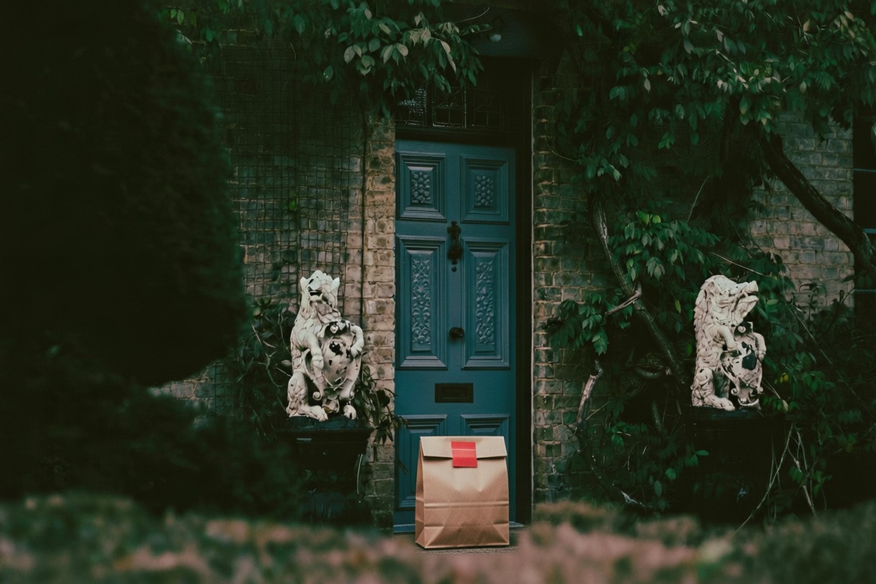 “In this existing photo, add a food delivery paper bag on the ground right in front of the door. The bag should be a small brown paper bag with a solid plain red sticker on the top keeping it closed. Preserve existing photo style and lighting as much as possible.”