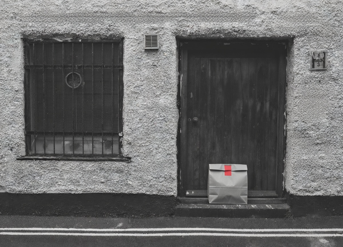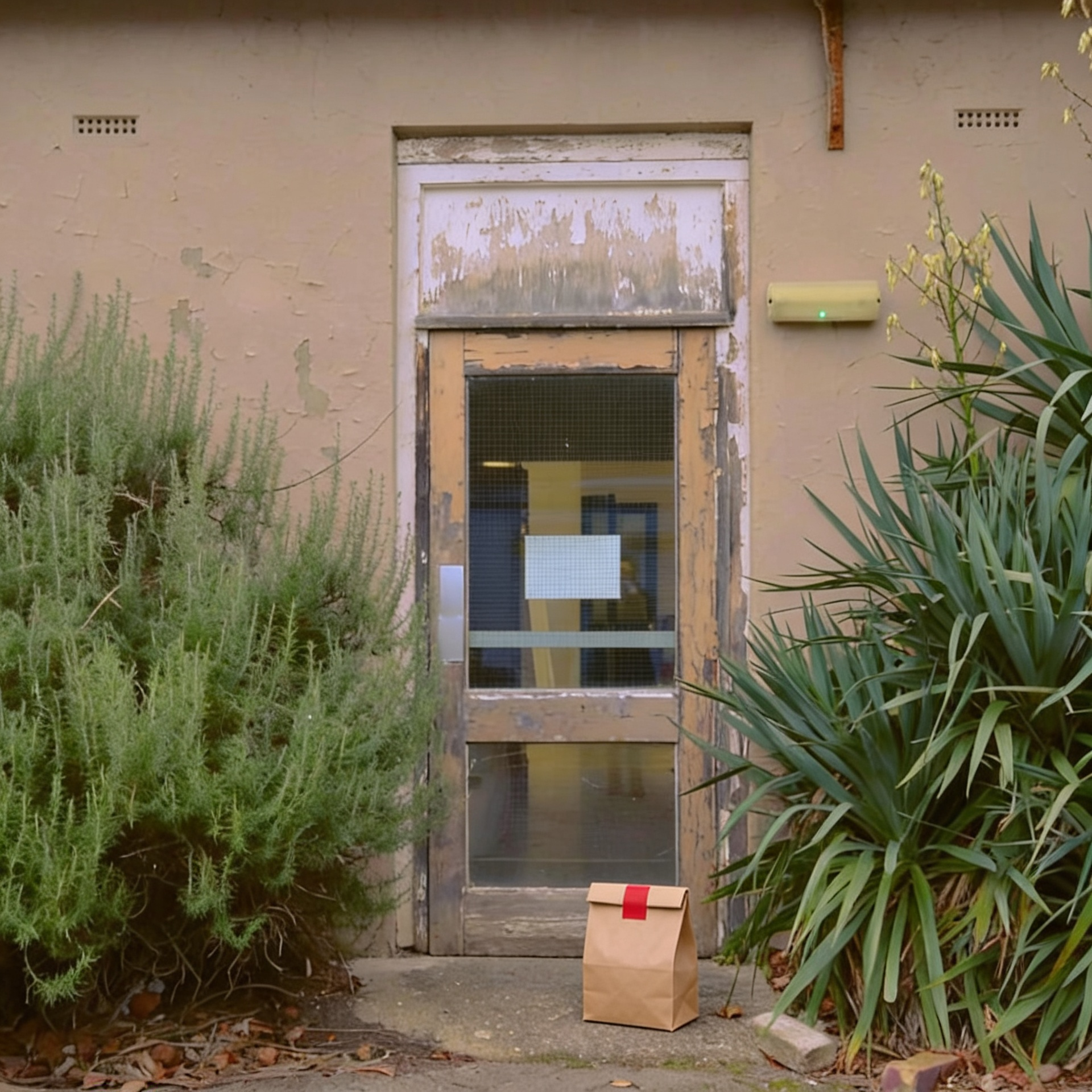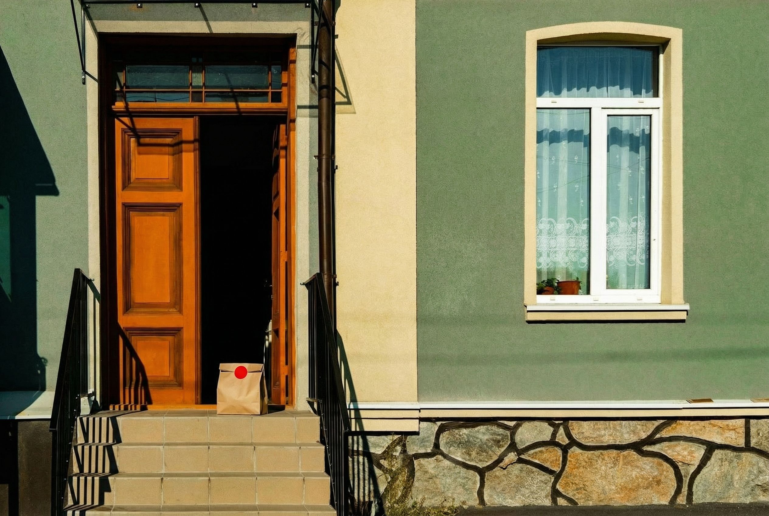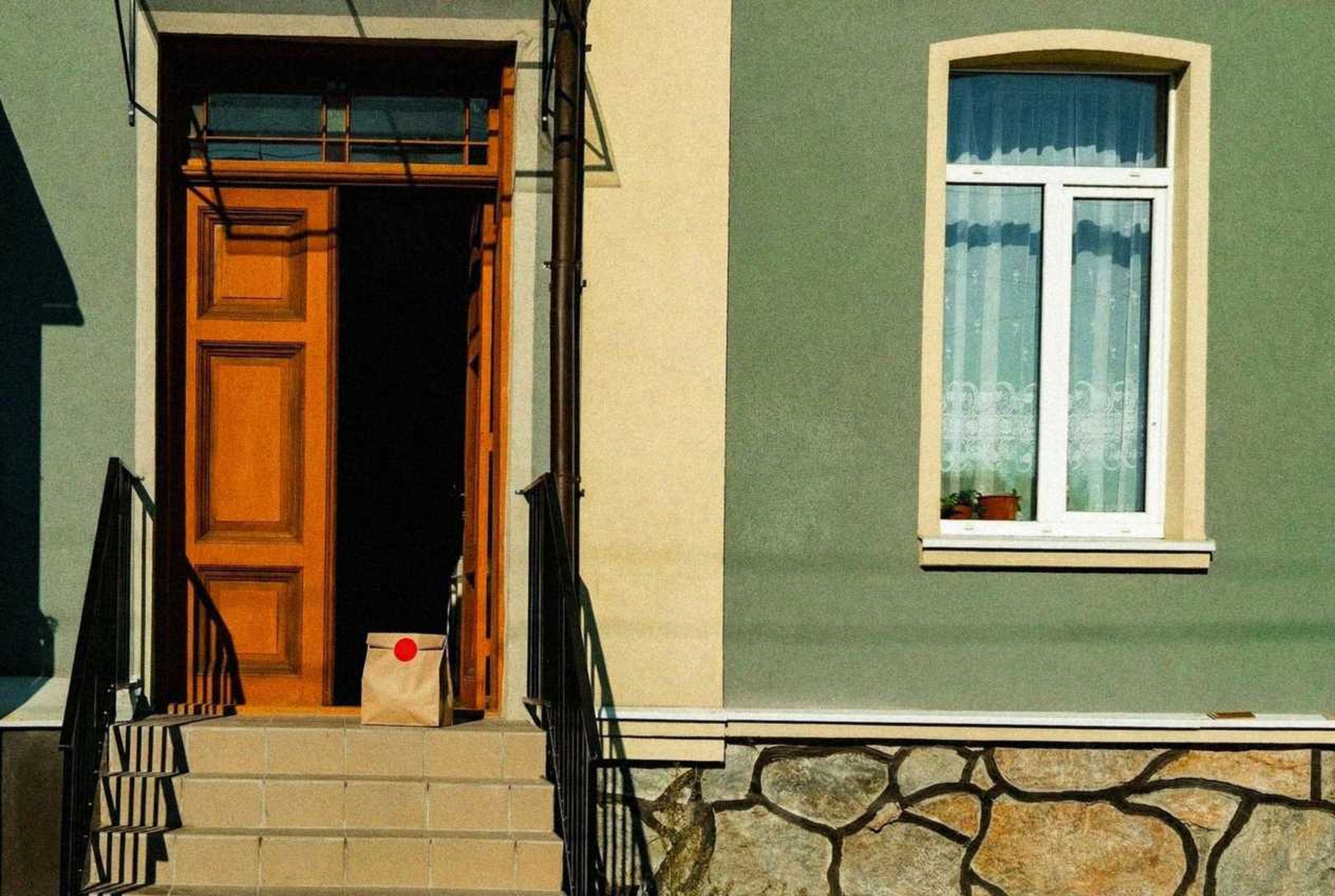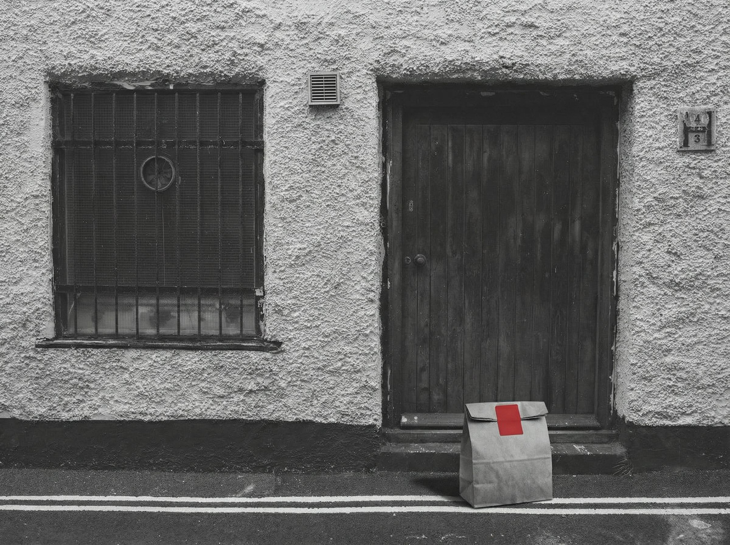 “In this existing photo, add a food delivery paper bag on the ground right in front of the door. The bag should be a small brown paper bag with a solid plain red sticker on the top keeping it closed. Preserve existing photo style and lighting as much as possible.”