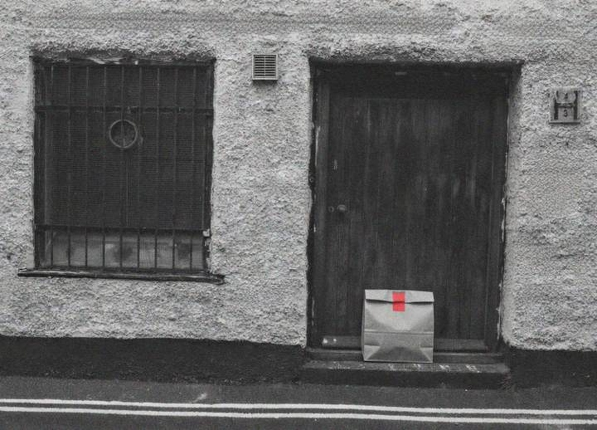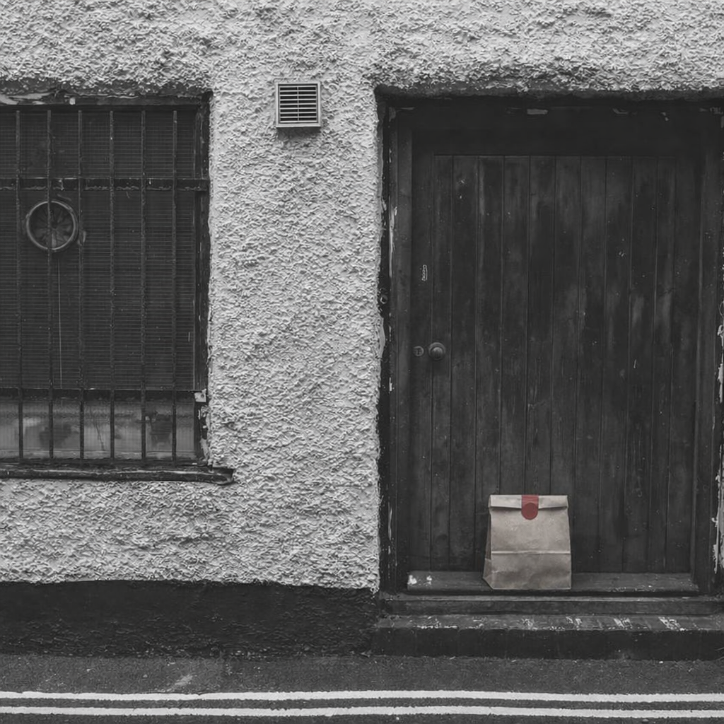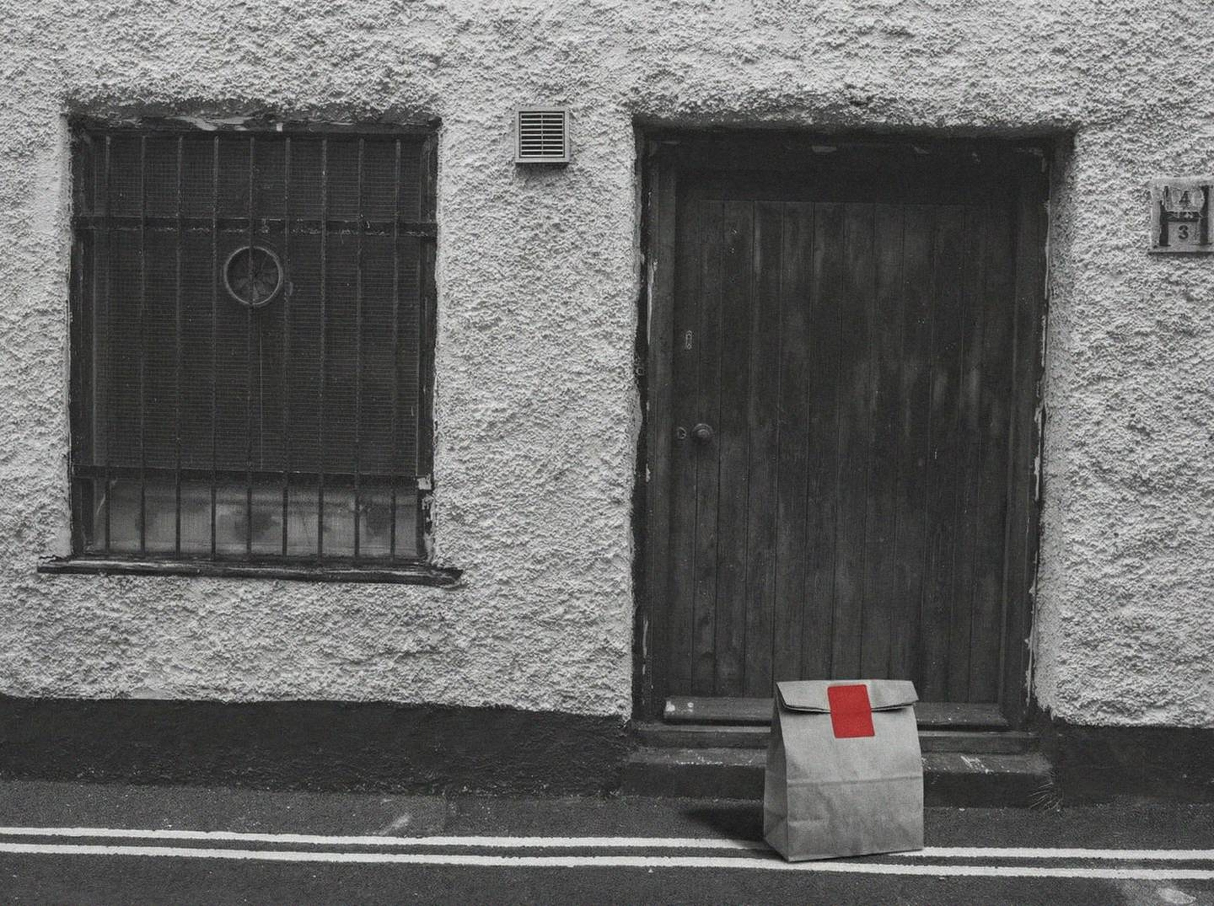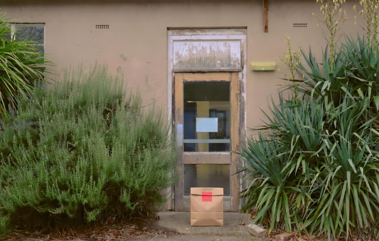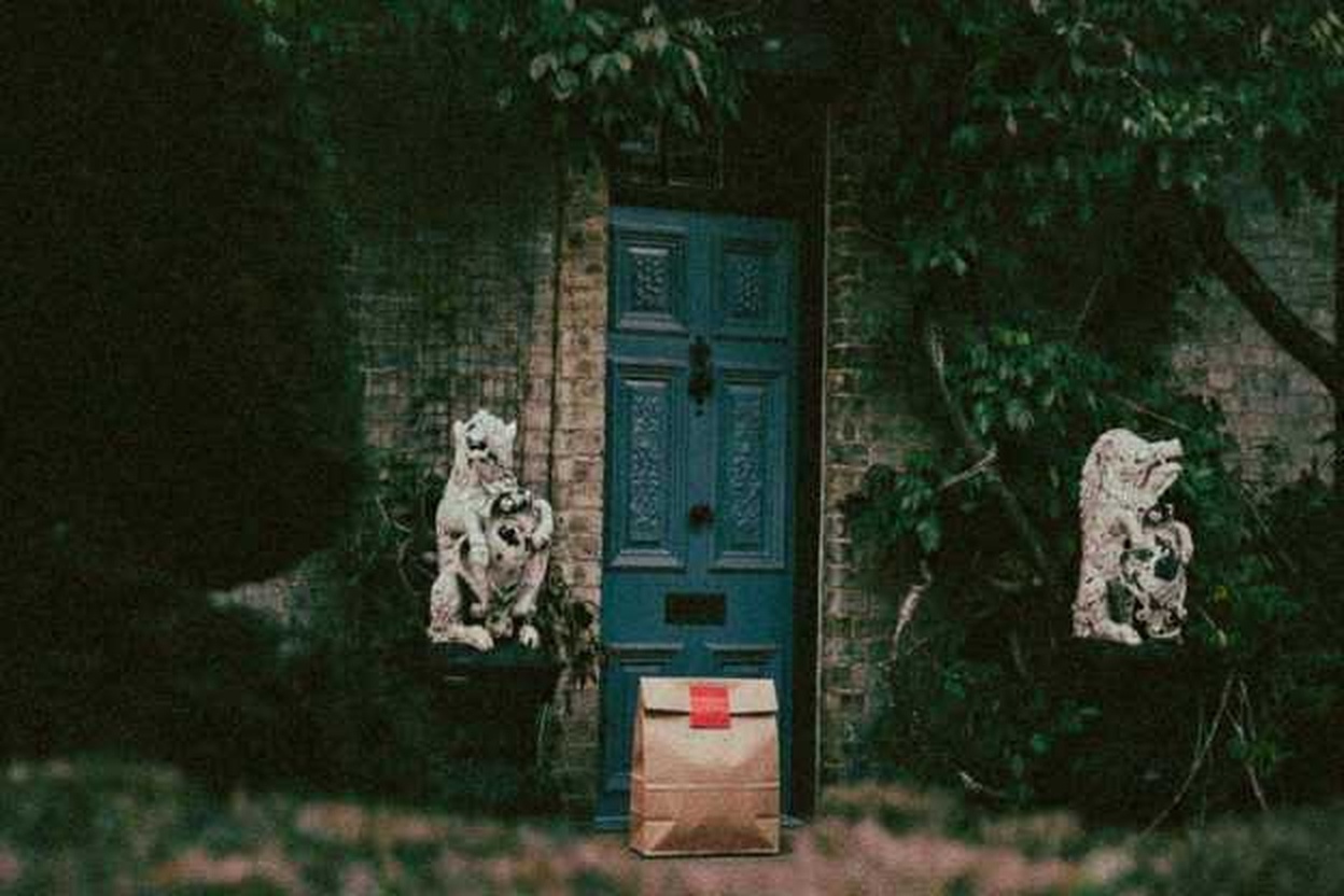 “In this existing photo, add a food delivery paper bag on the ground right in front of the door. The bag should be a small brown paper bag with a solid plain red sticker on the top keeping it closed. Preserve existing photo style and lighting as much as possible.”