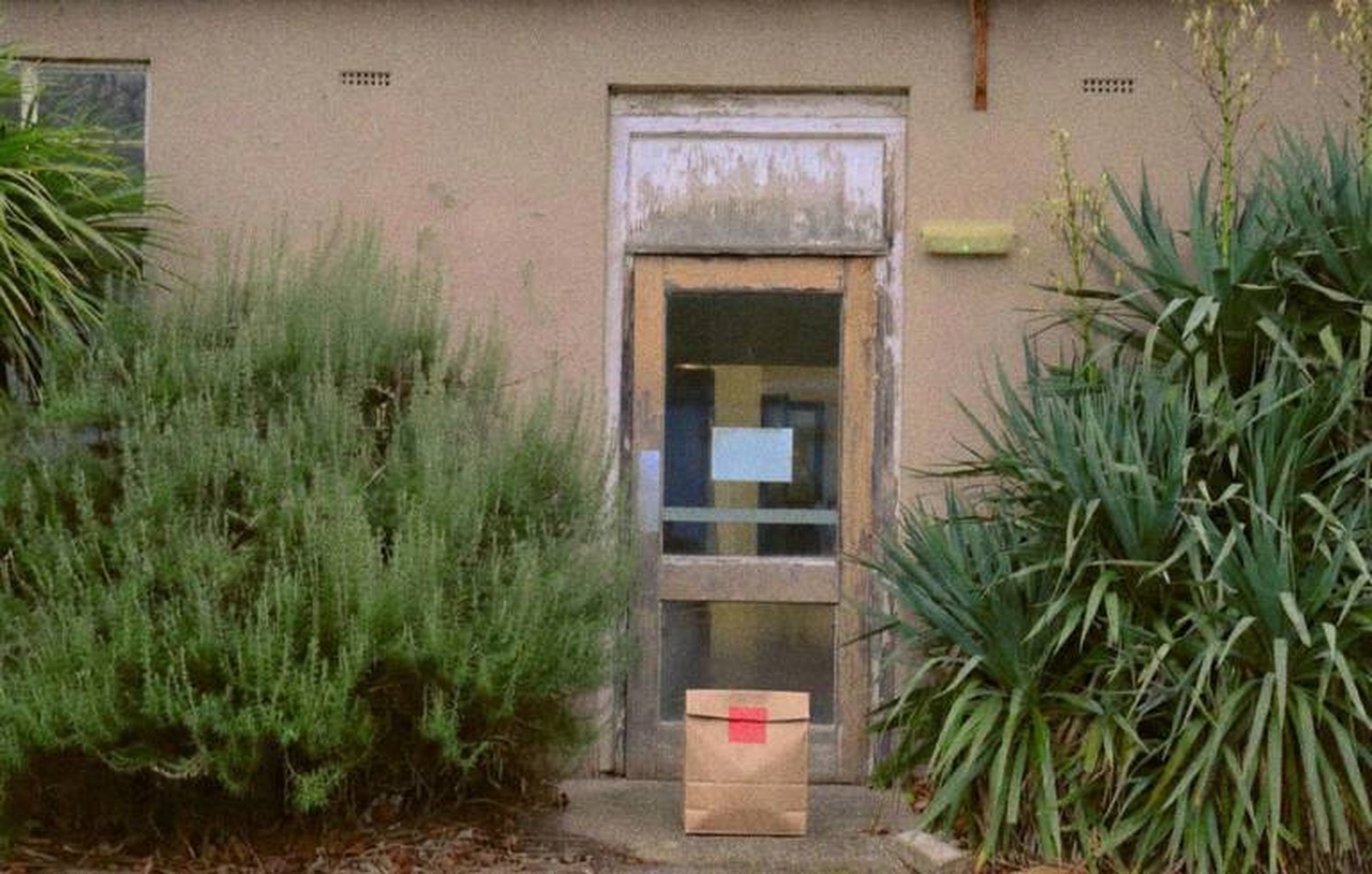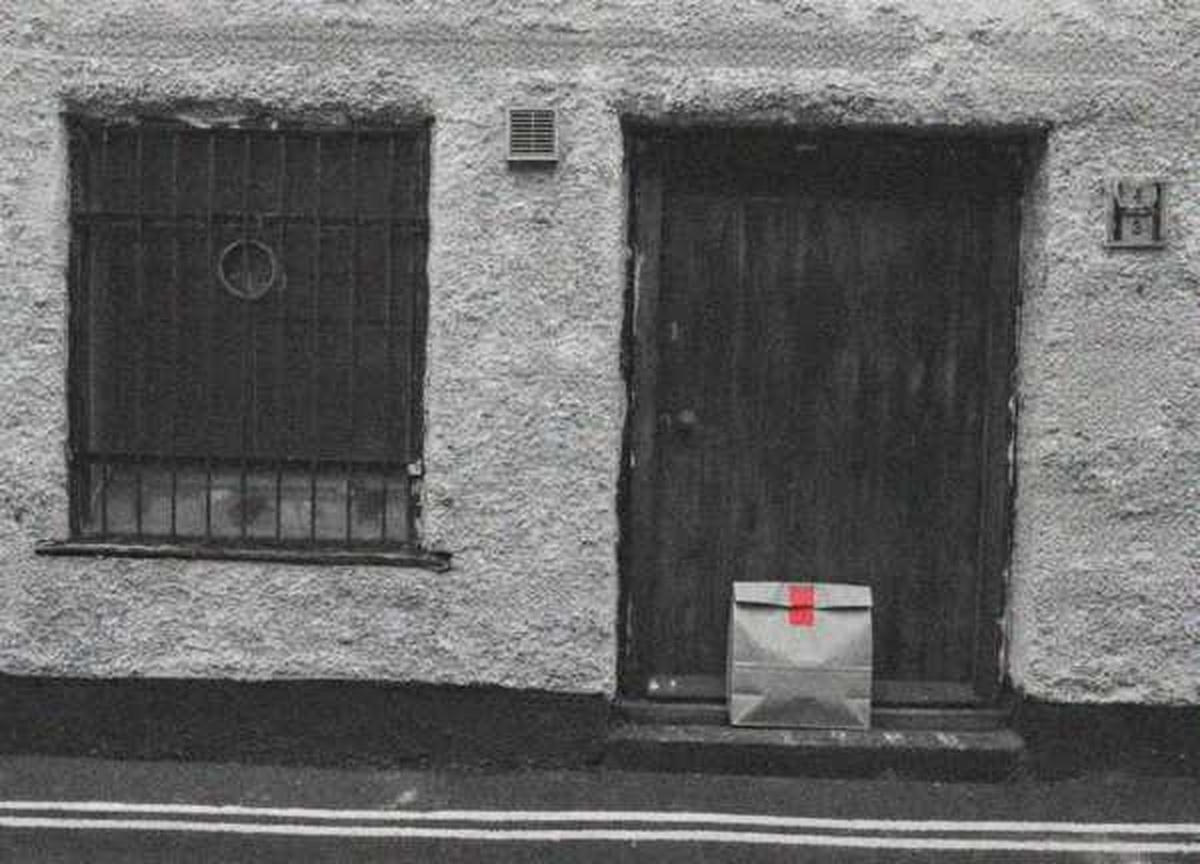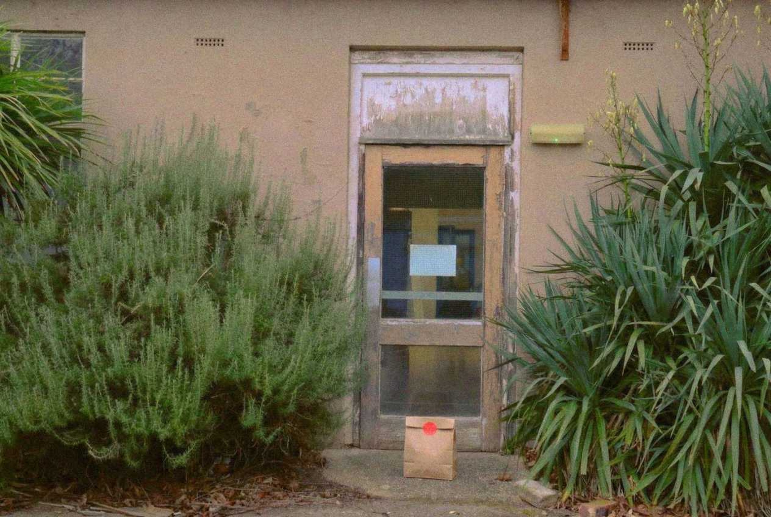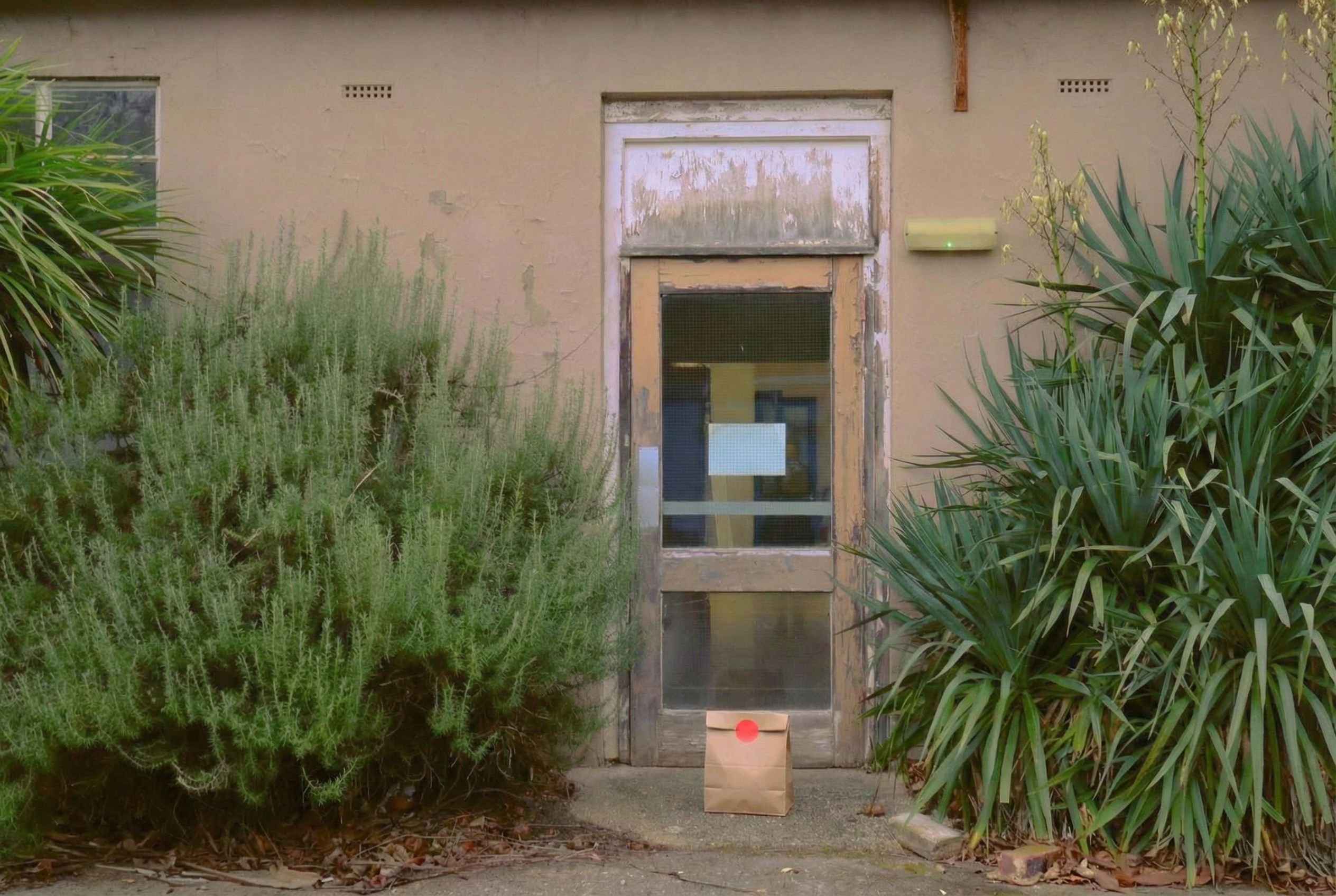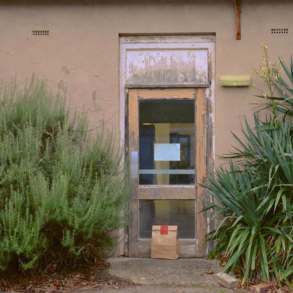 “In this existing photo, add a food delivery paper bag on the ground right in front of the door. The bag should be a small brown paper bag with a solid plain red sticker on the top keeping it closed. Preserve existing photo style and lighting as much as possible.”