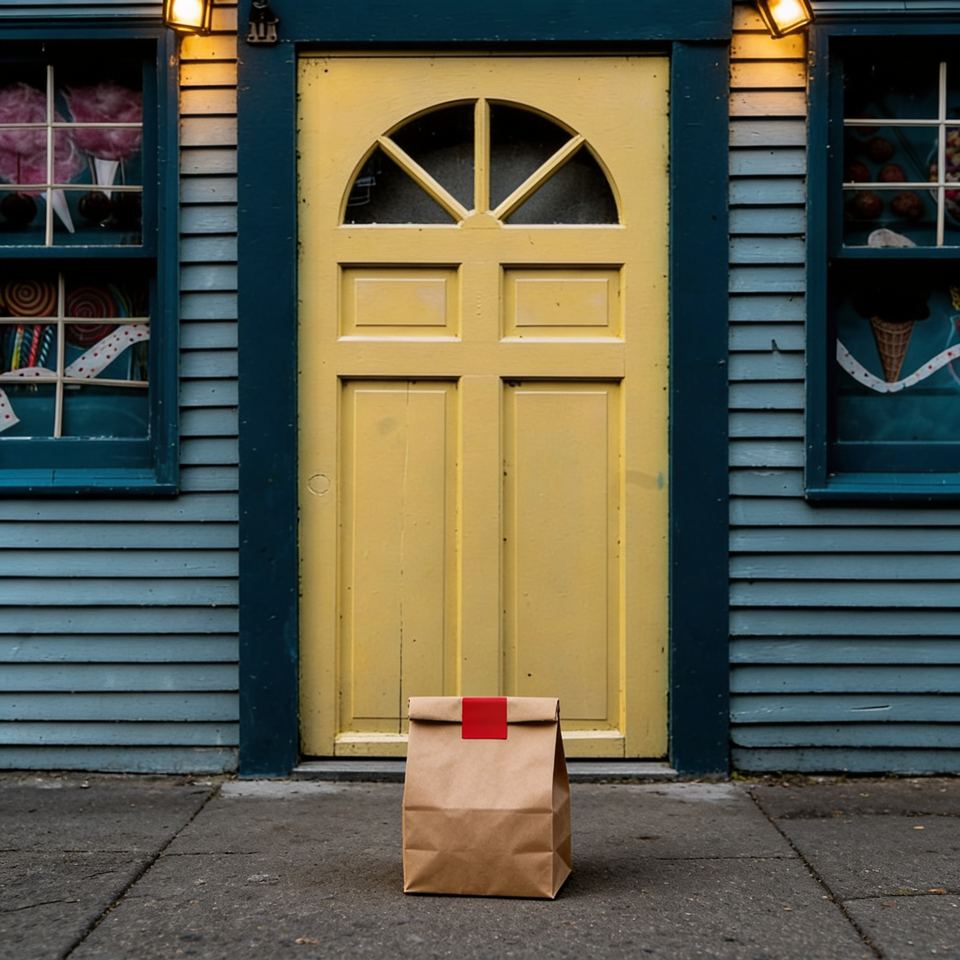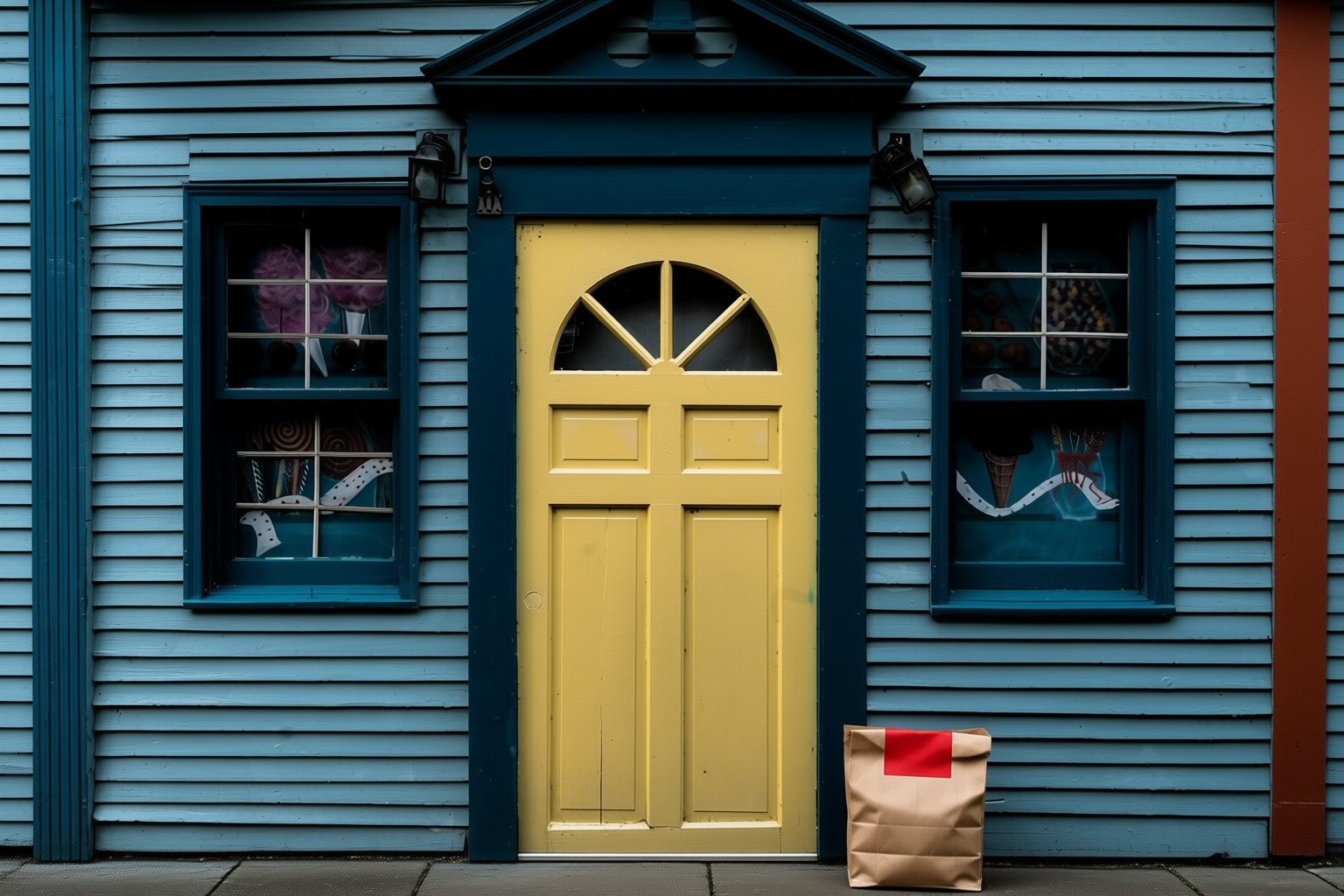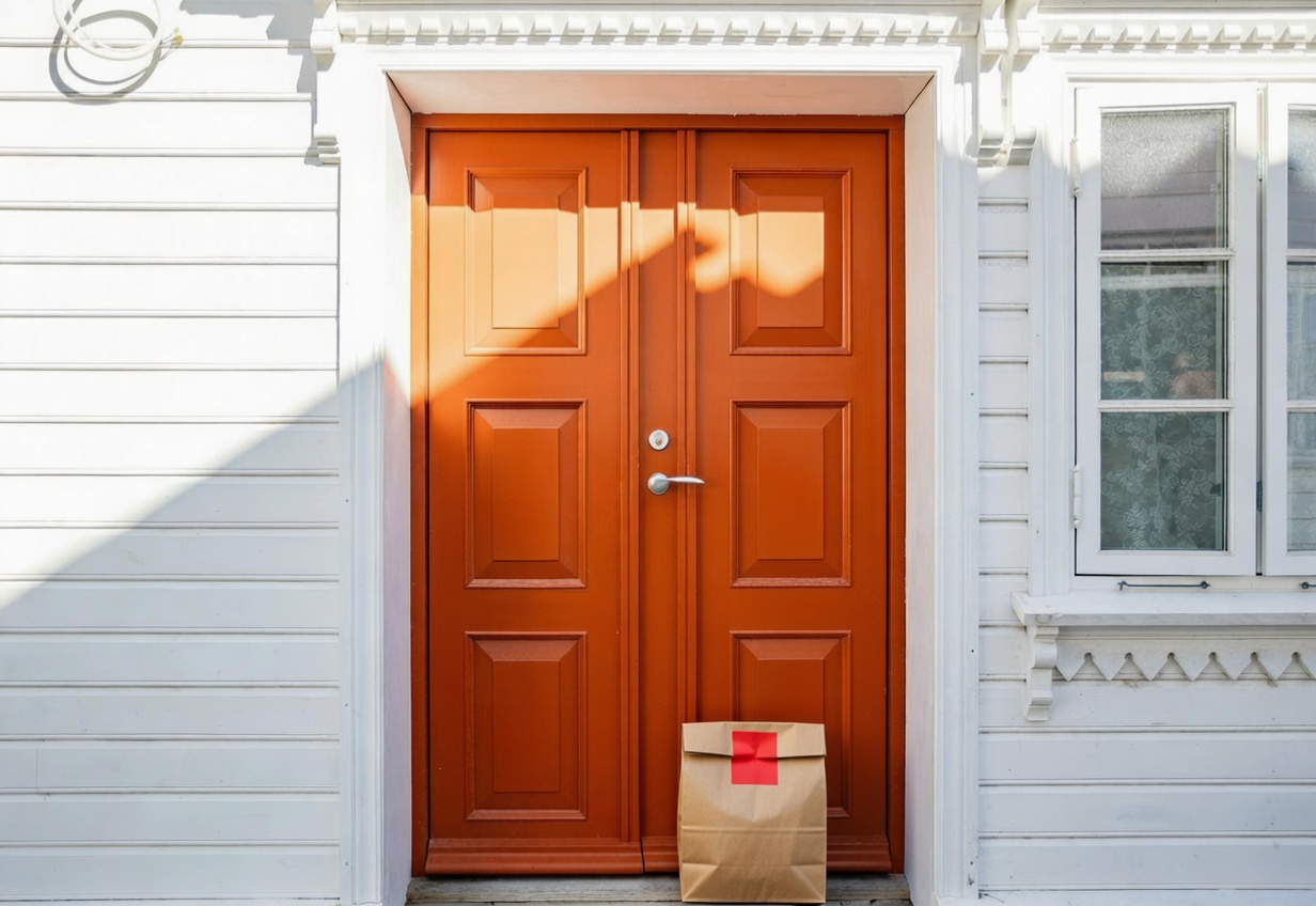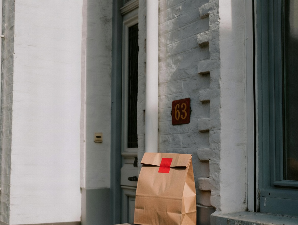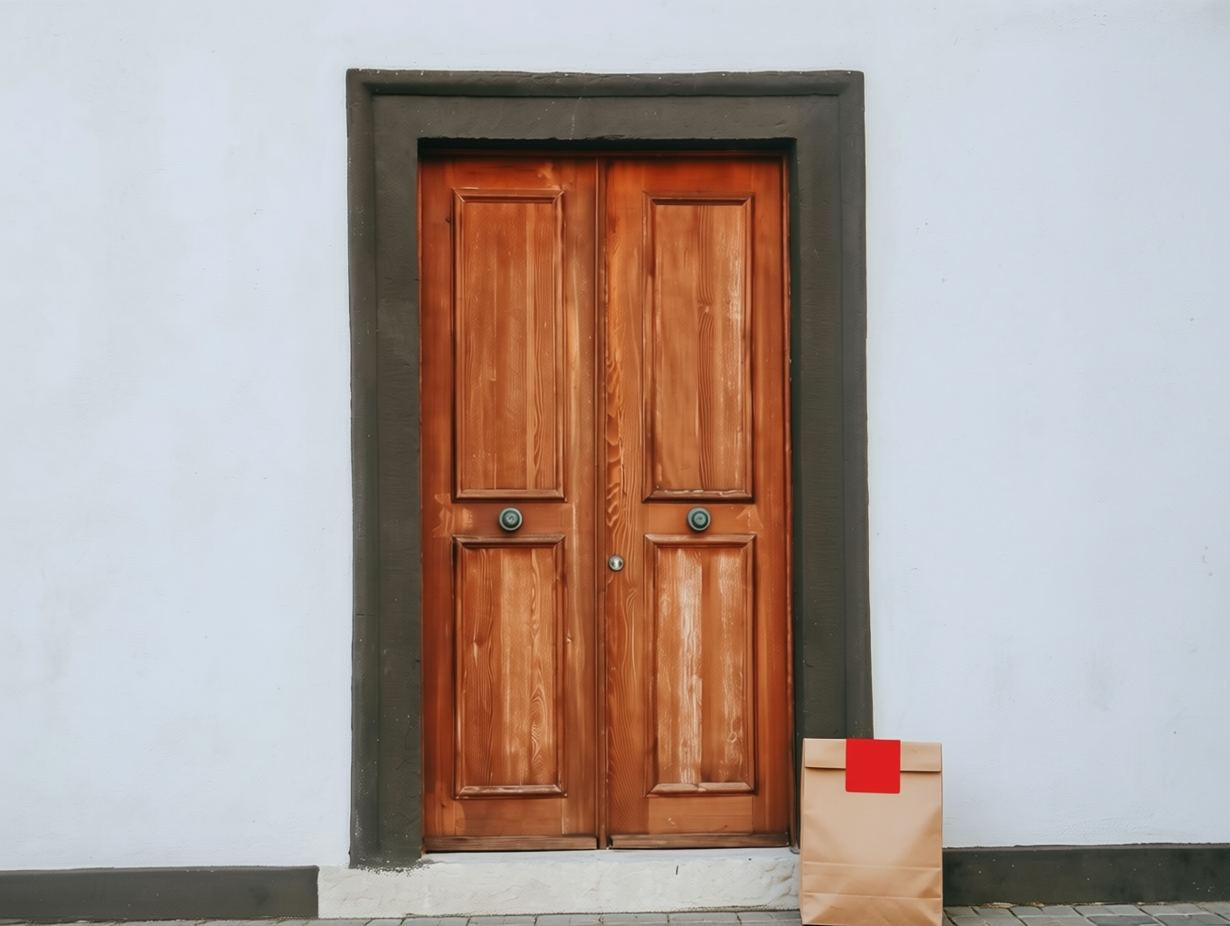 “In this existing photo, add a food delivery paper bag on the ground right in front of the door. The bag should be a small brown paper bag with a solid plain red sticker on the top keeping it closed. Preserve existing photo style and lighting as much as possible.”