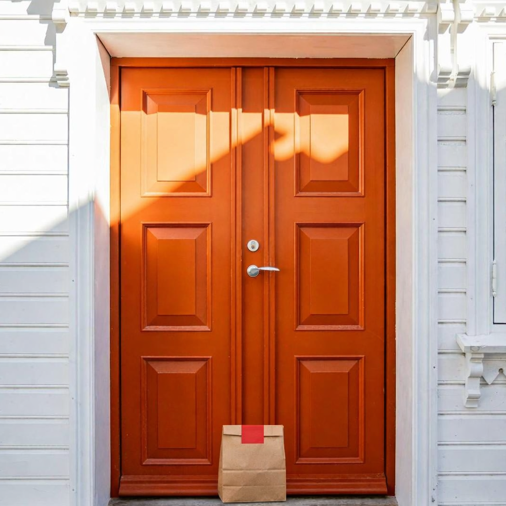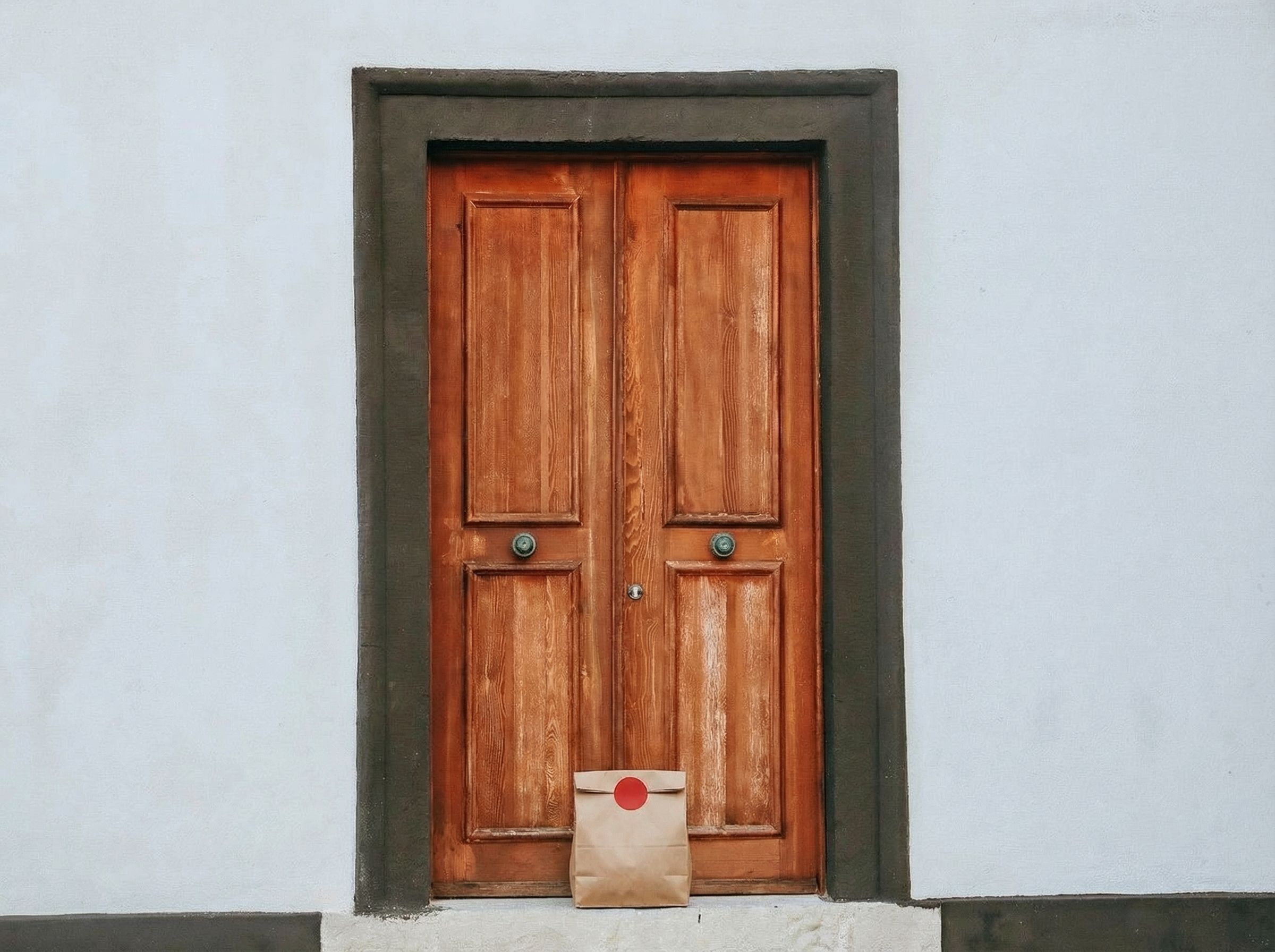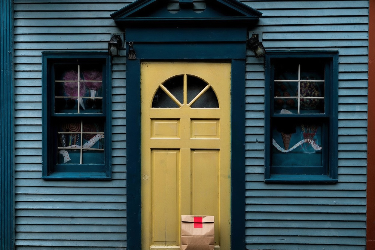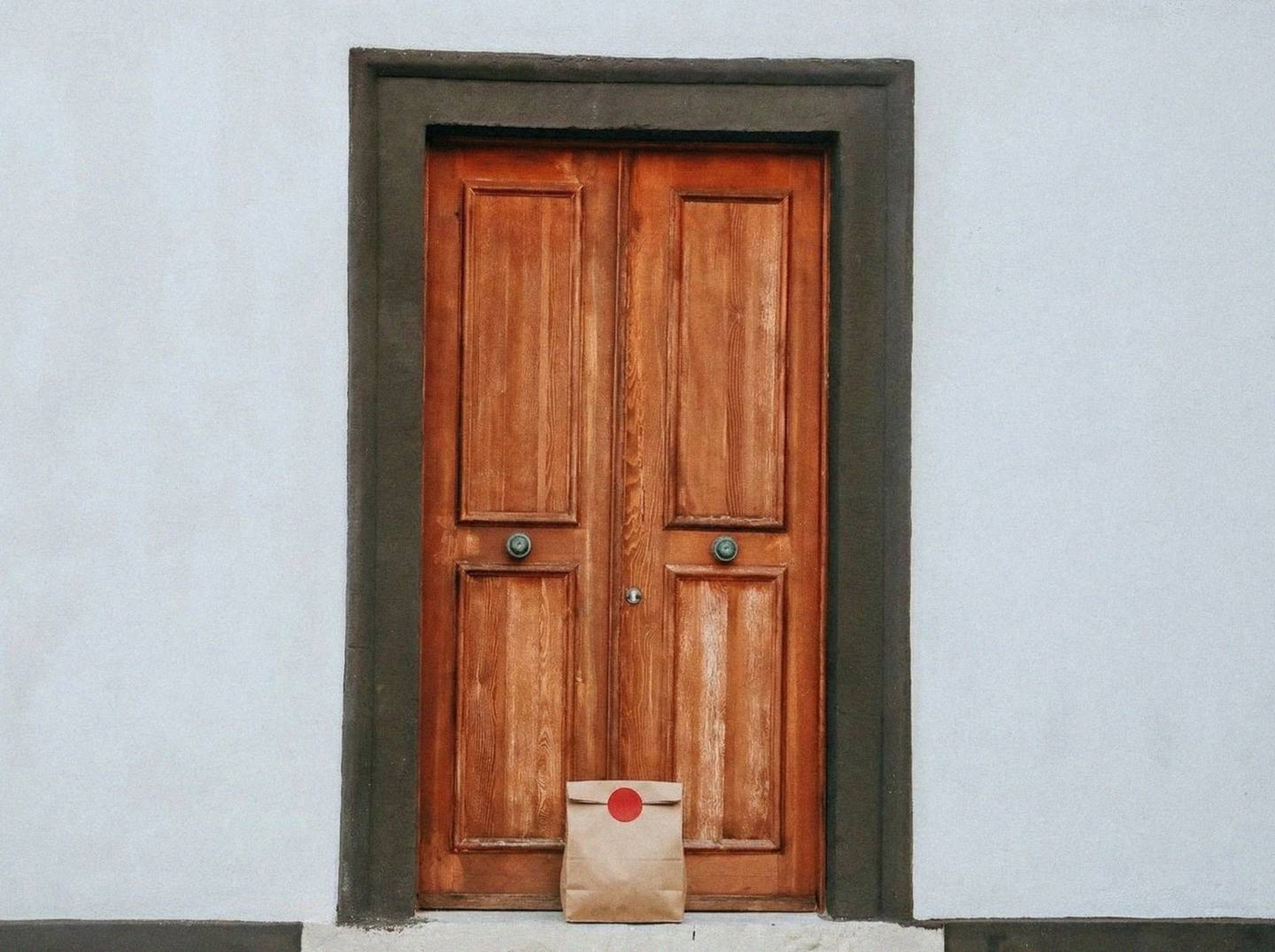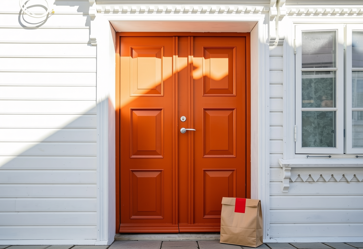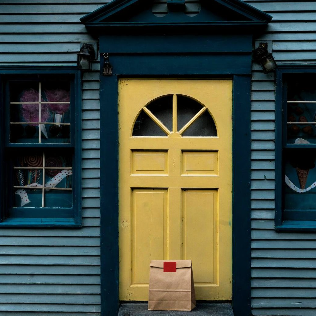 “In this existing photo, add a food delivery paper bag on the ground right in front of the door. The bag should be a small brown paper bag with a solid plain red sticker on the top keeping it closed. Preserve existing photo style and lighting as much as possible.”
