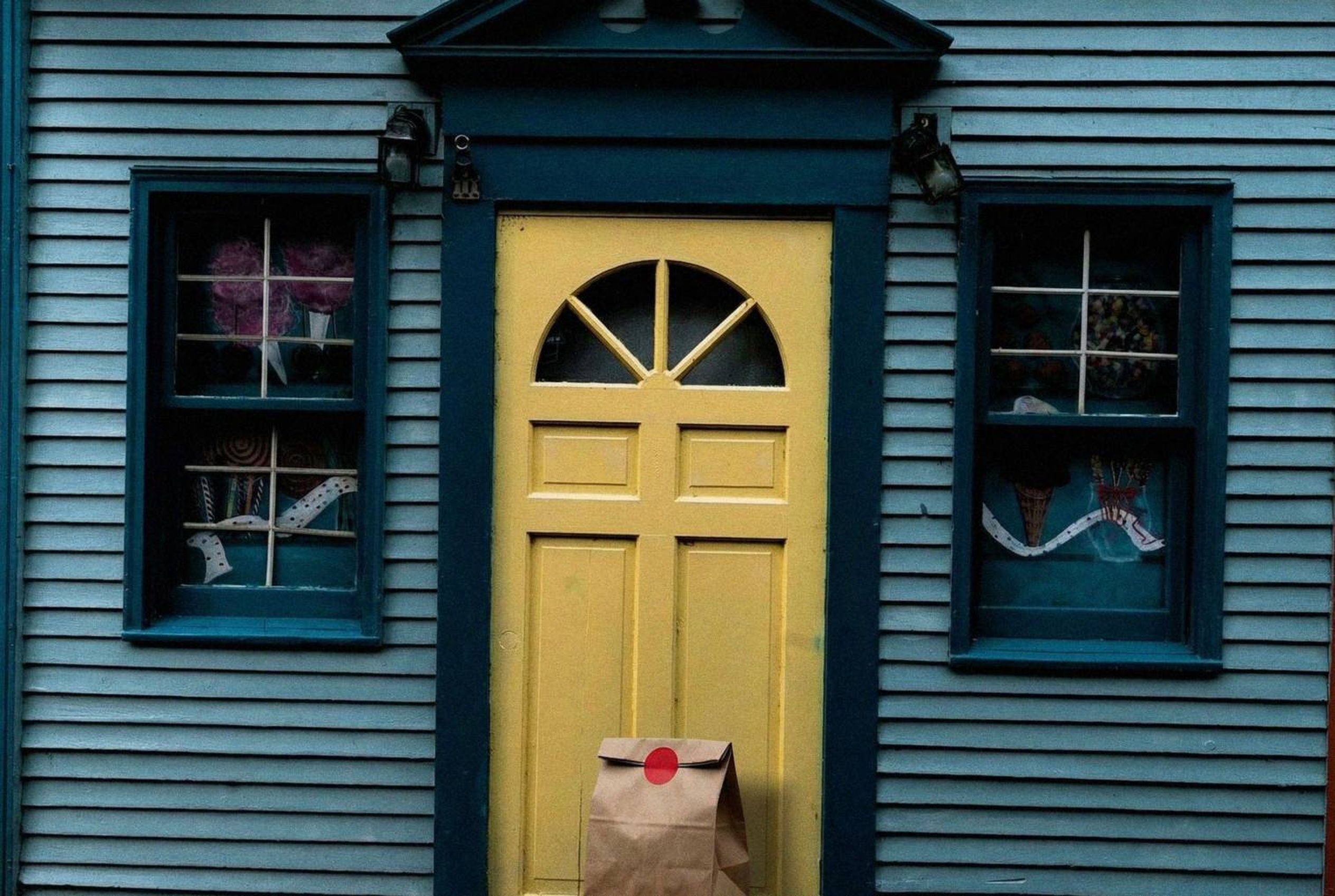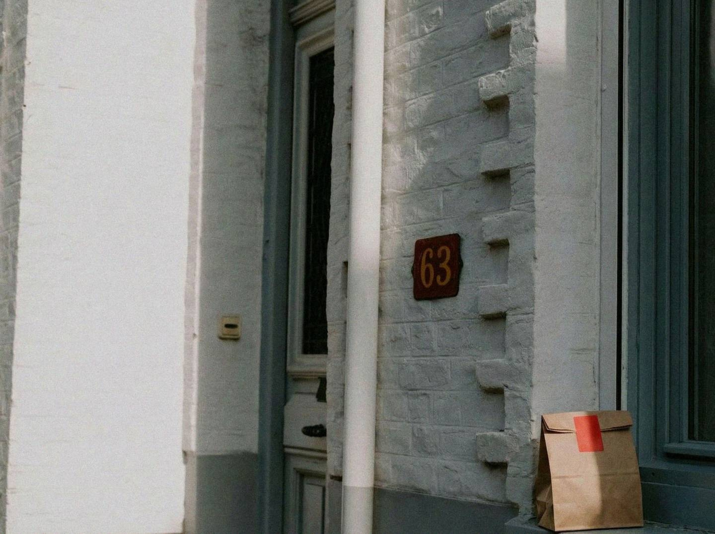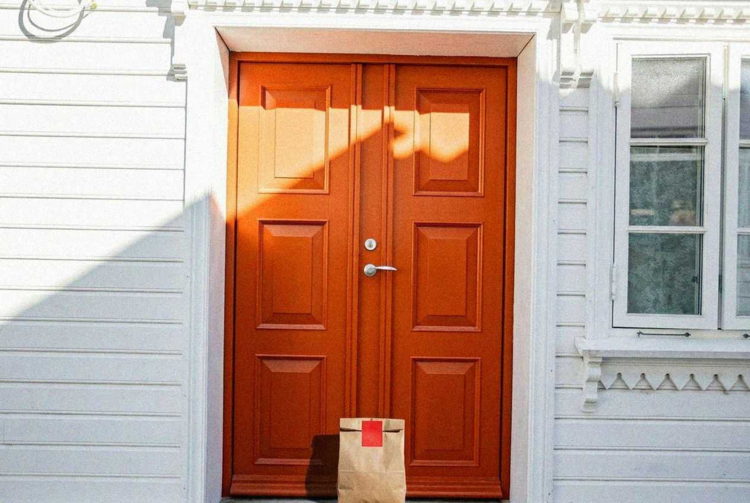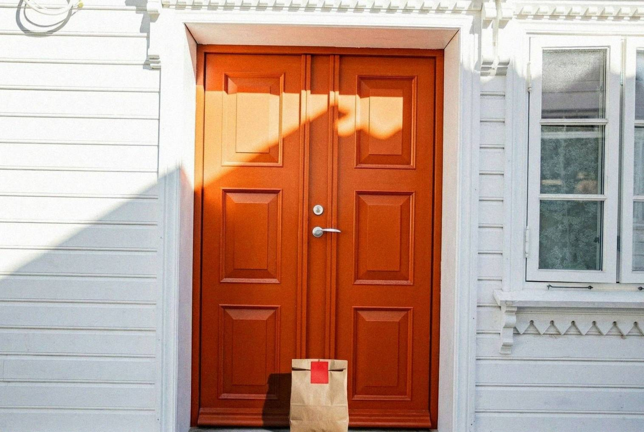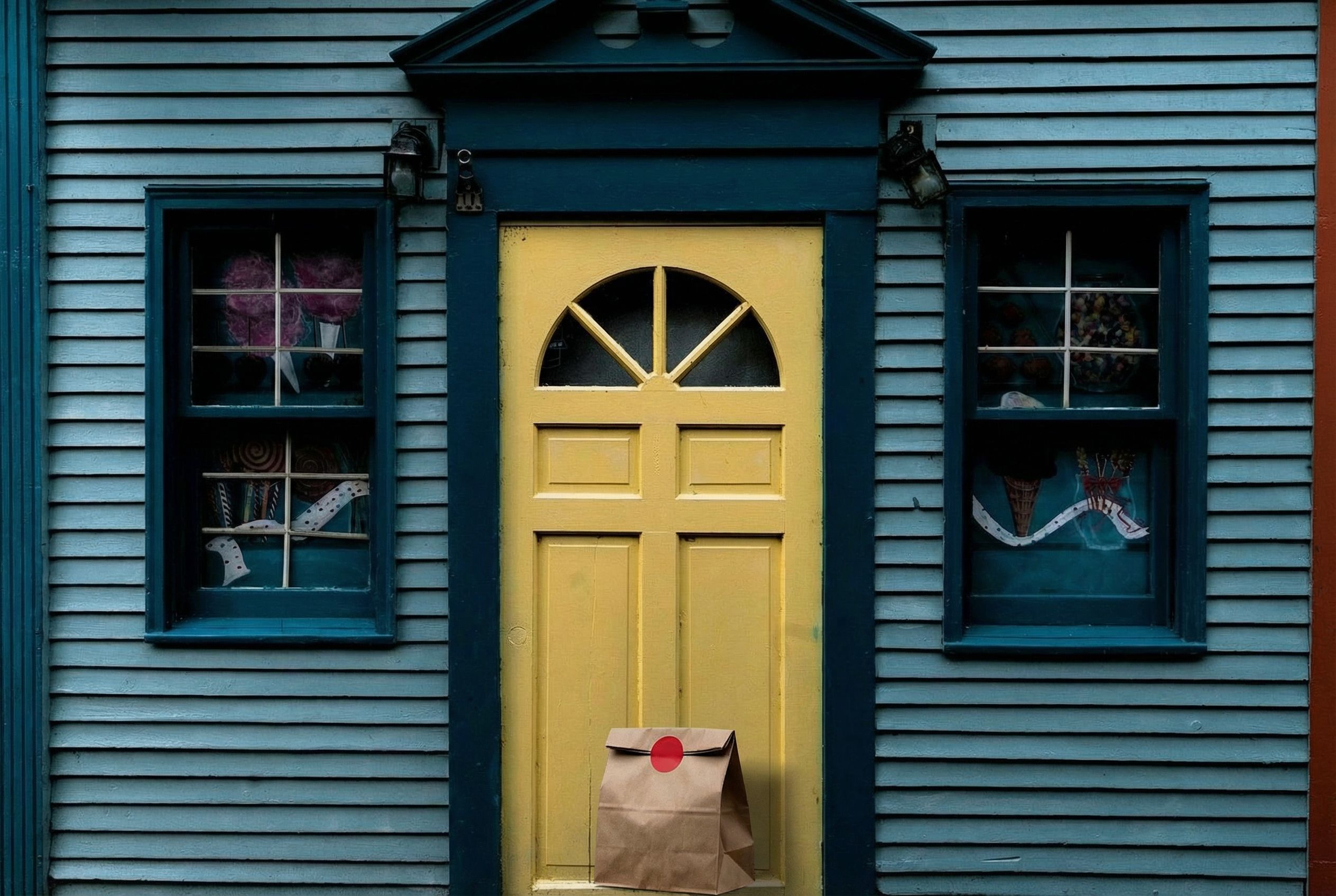 “In this existing photo, add a food delivery paper bag on the ground right in front of the door. The bag should be a small brown paper bag with a solid plain red sticker on the top keeping it closed. Preserve existing photo style and lighting as much as possible.”