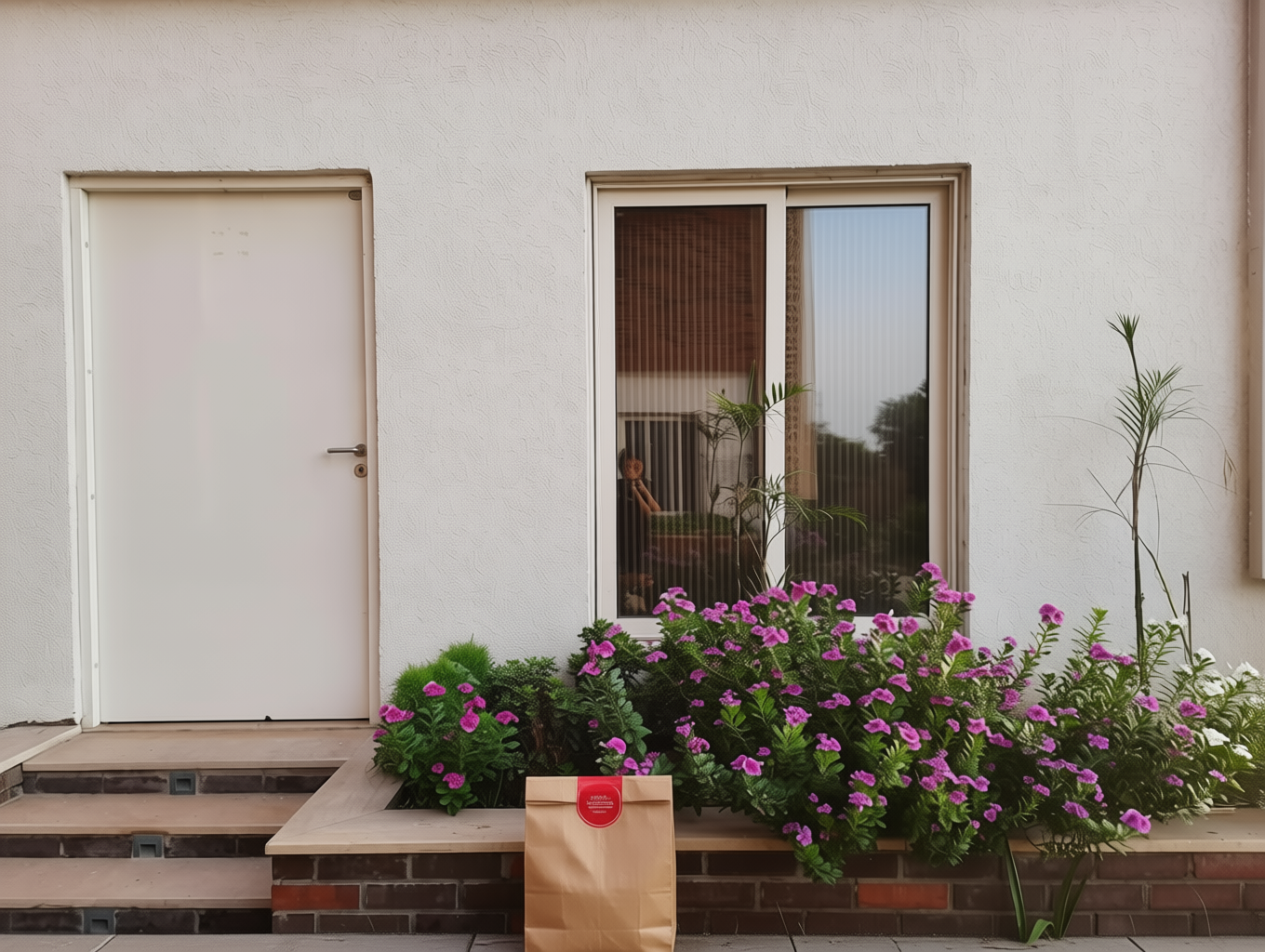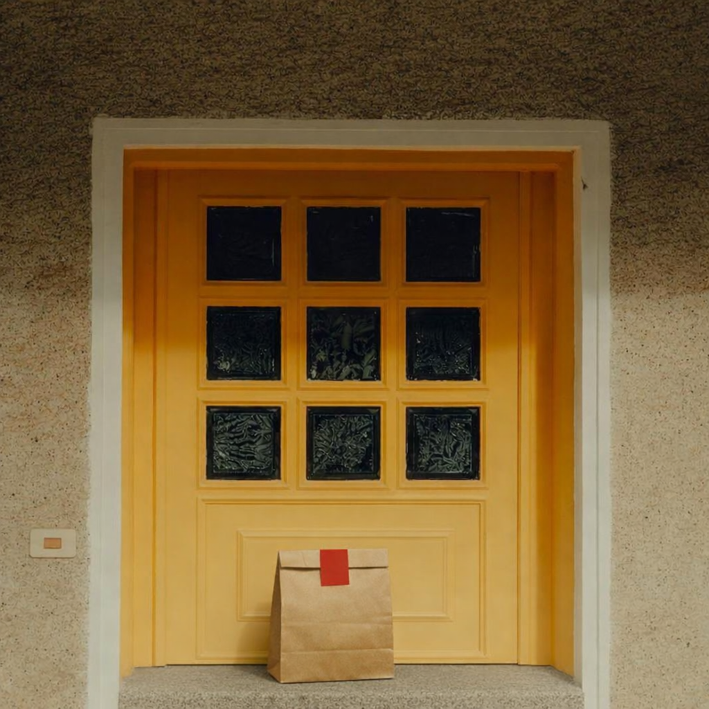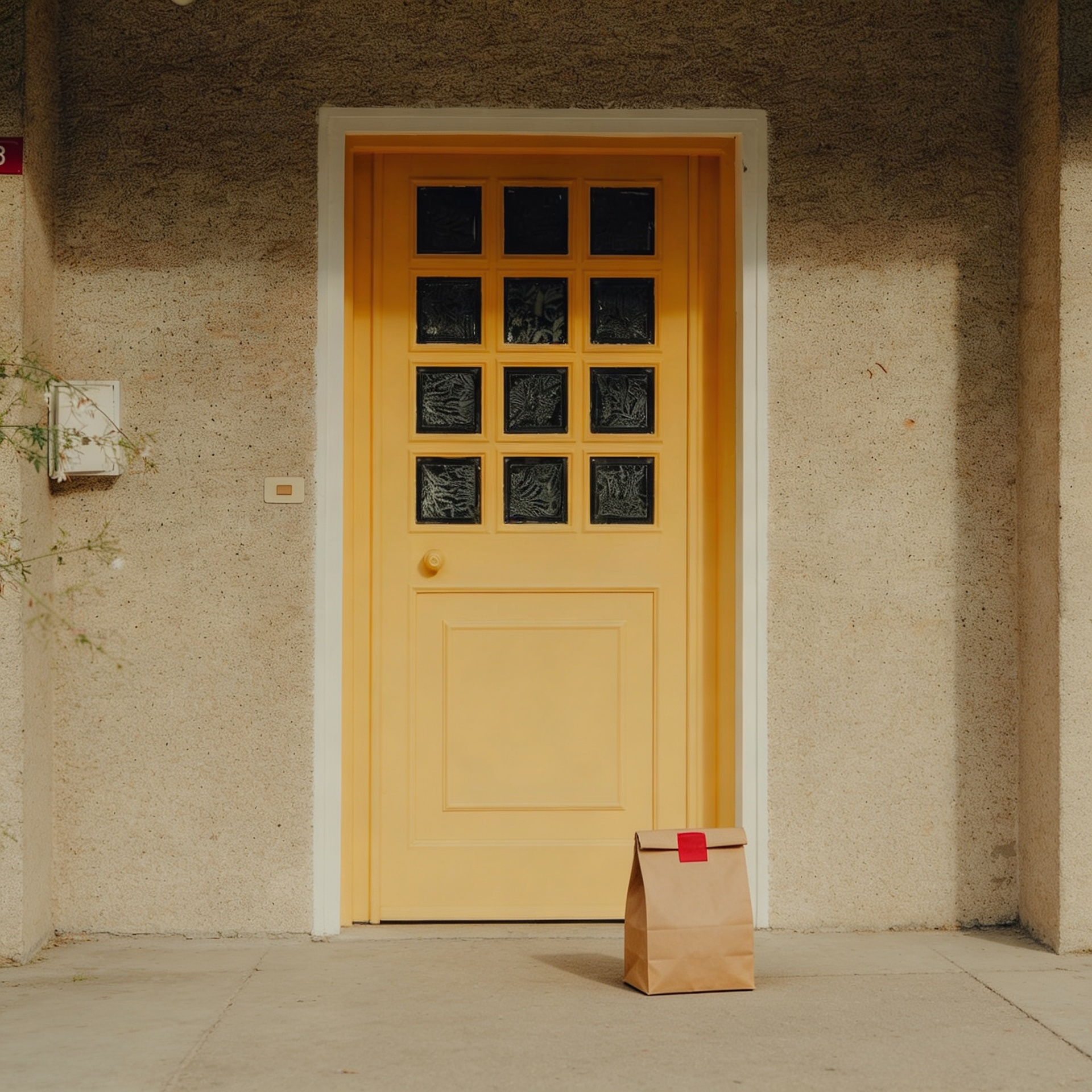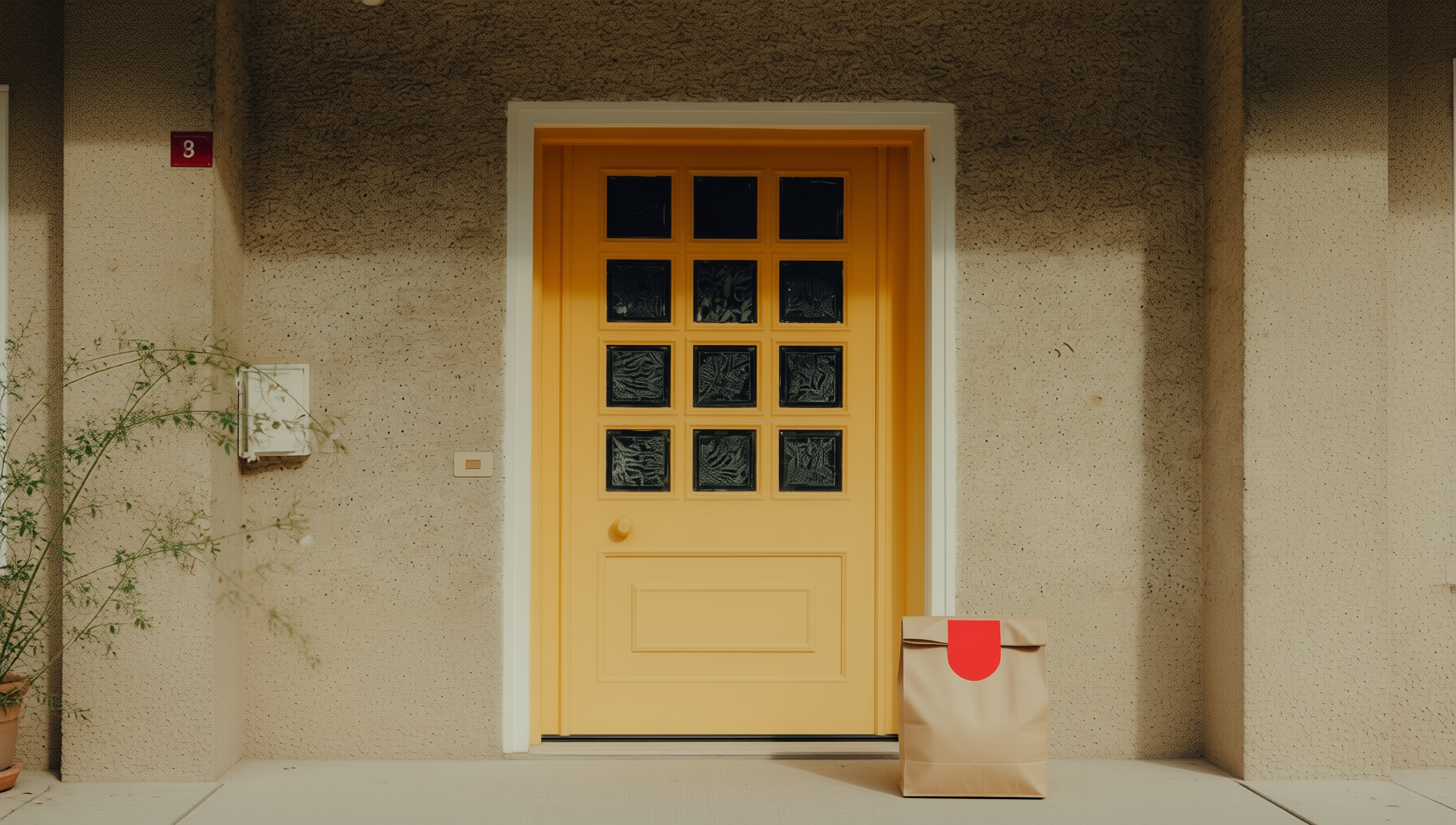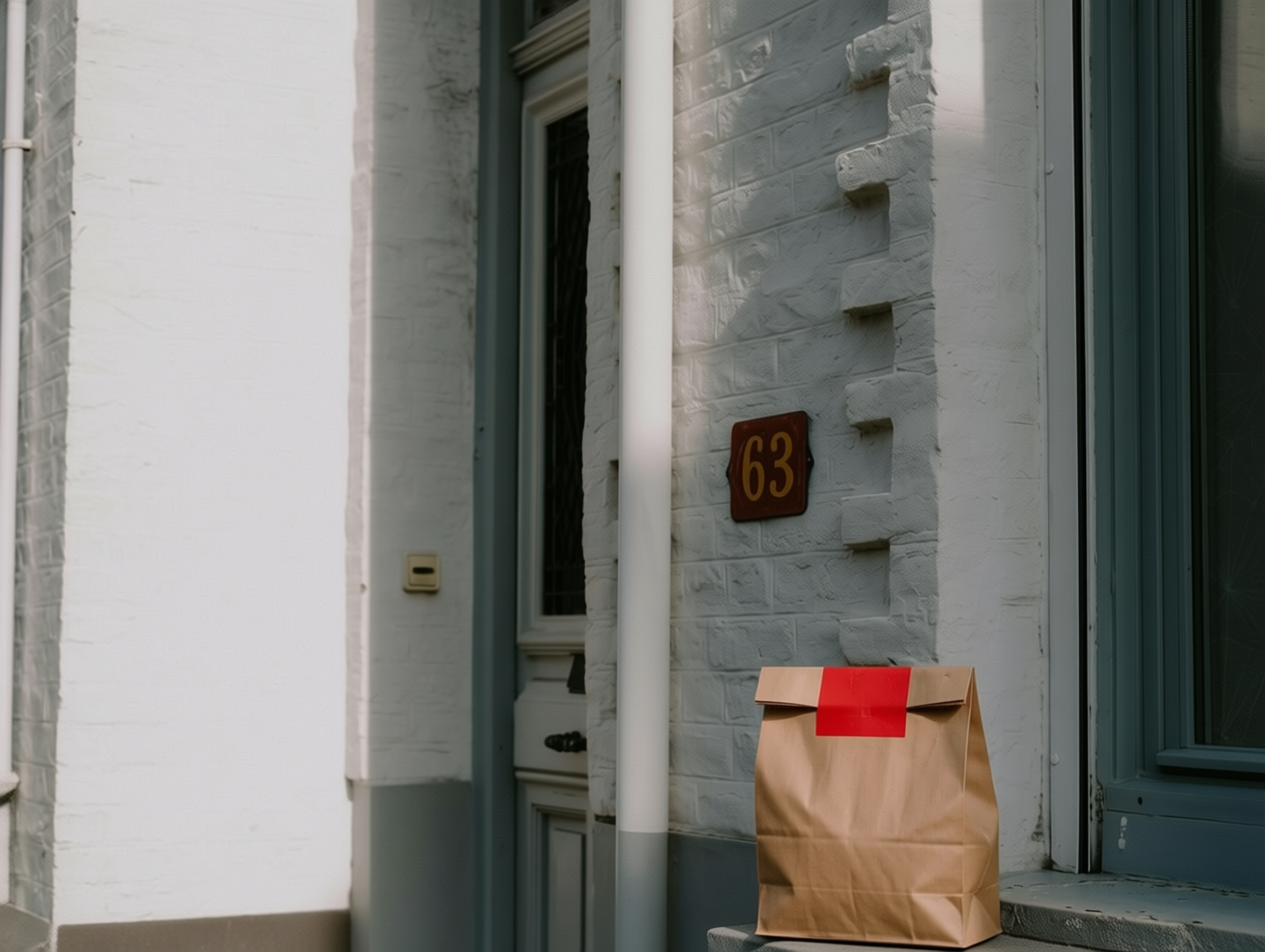 Delivery: We took real front door photos and used AI to add a fake delivery bag to the photo.