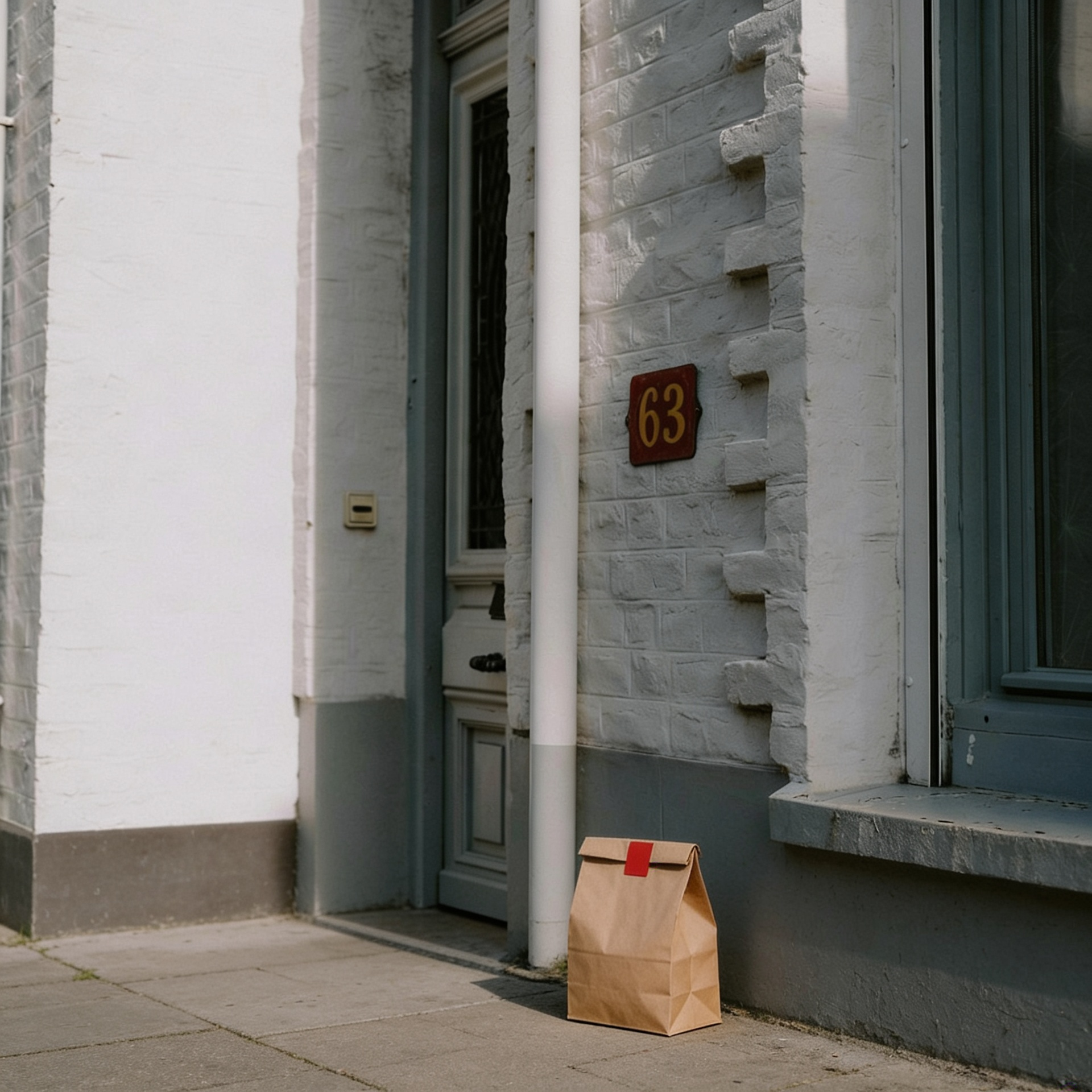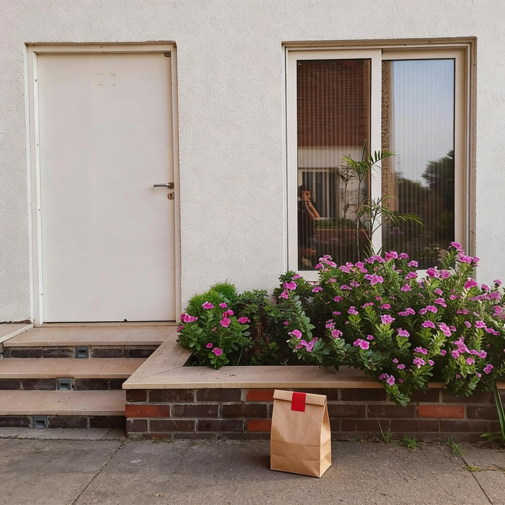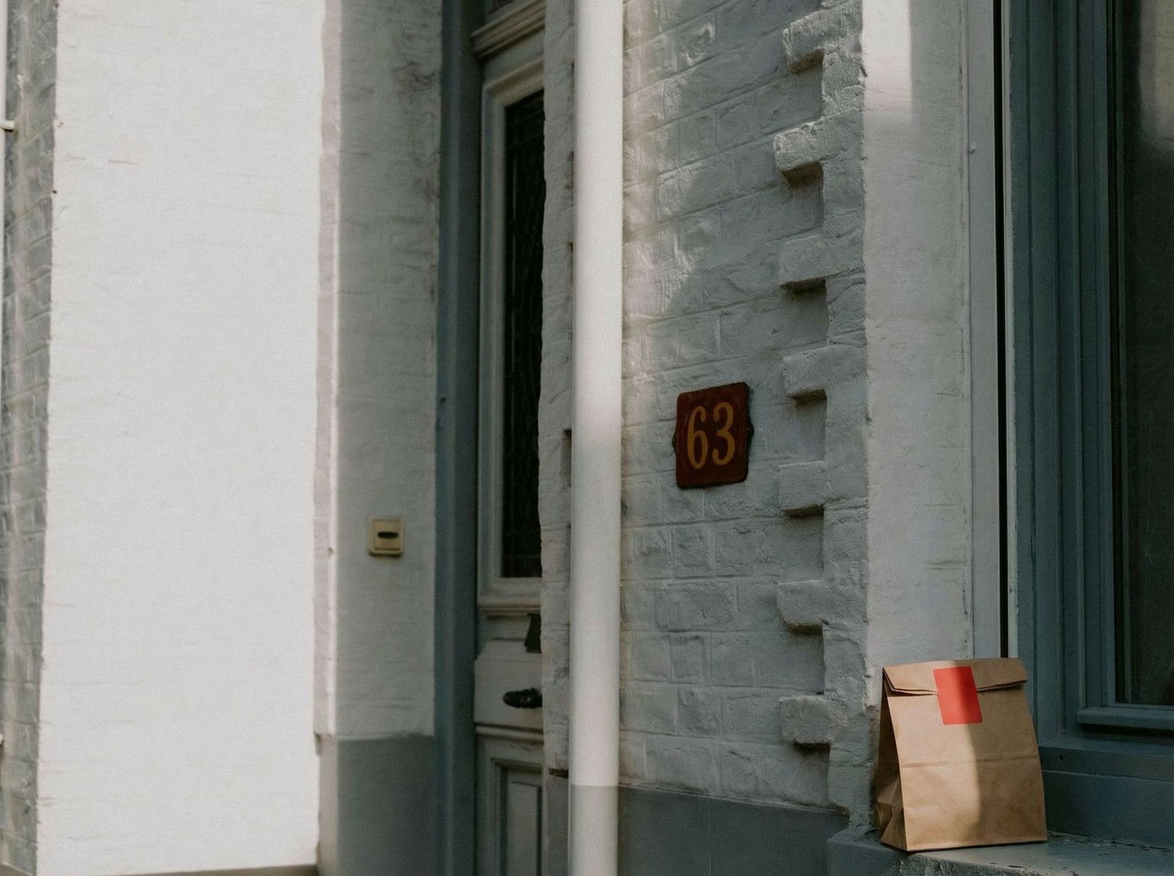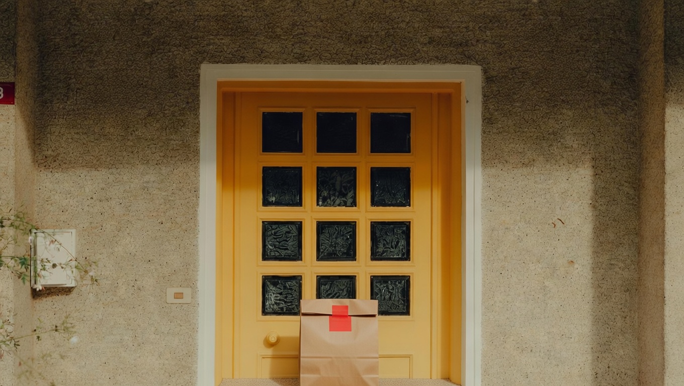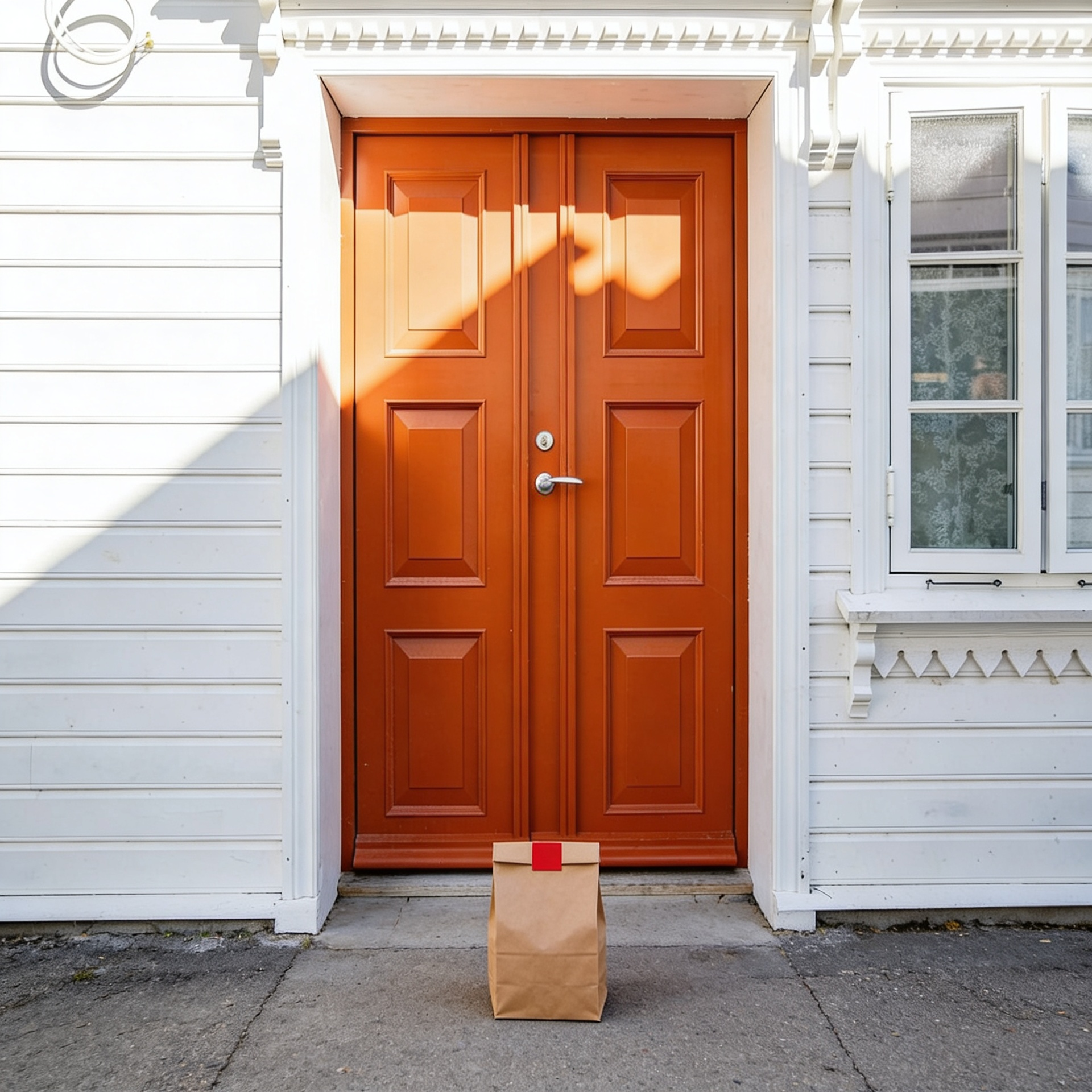 Delivery: We took real front door photos and used AI to add a fake delivery bag to the photo.