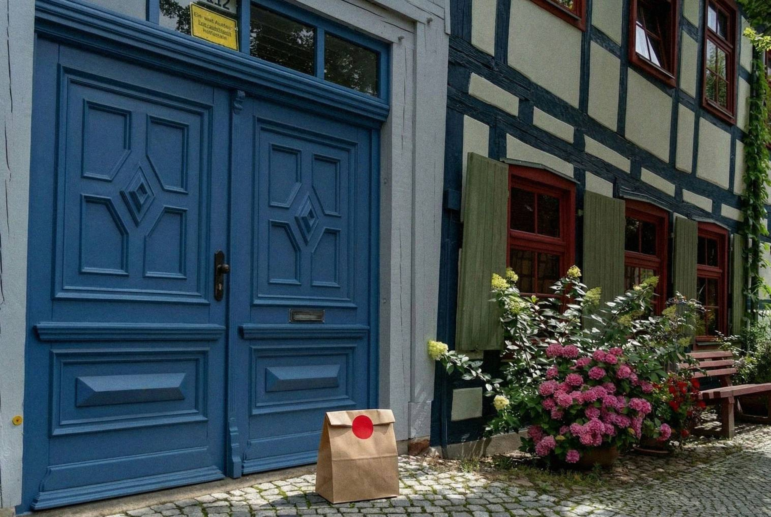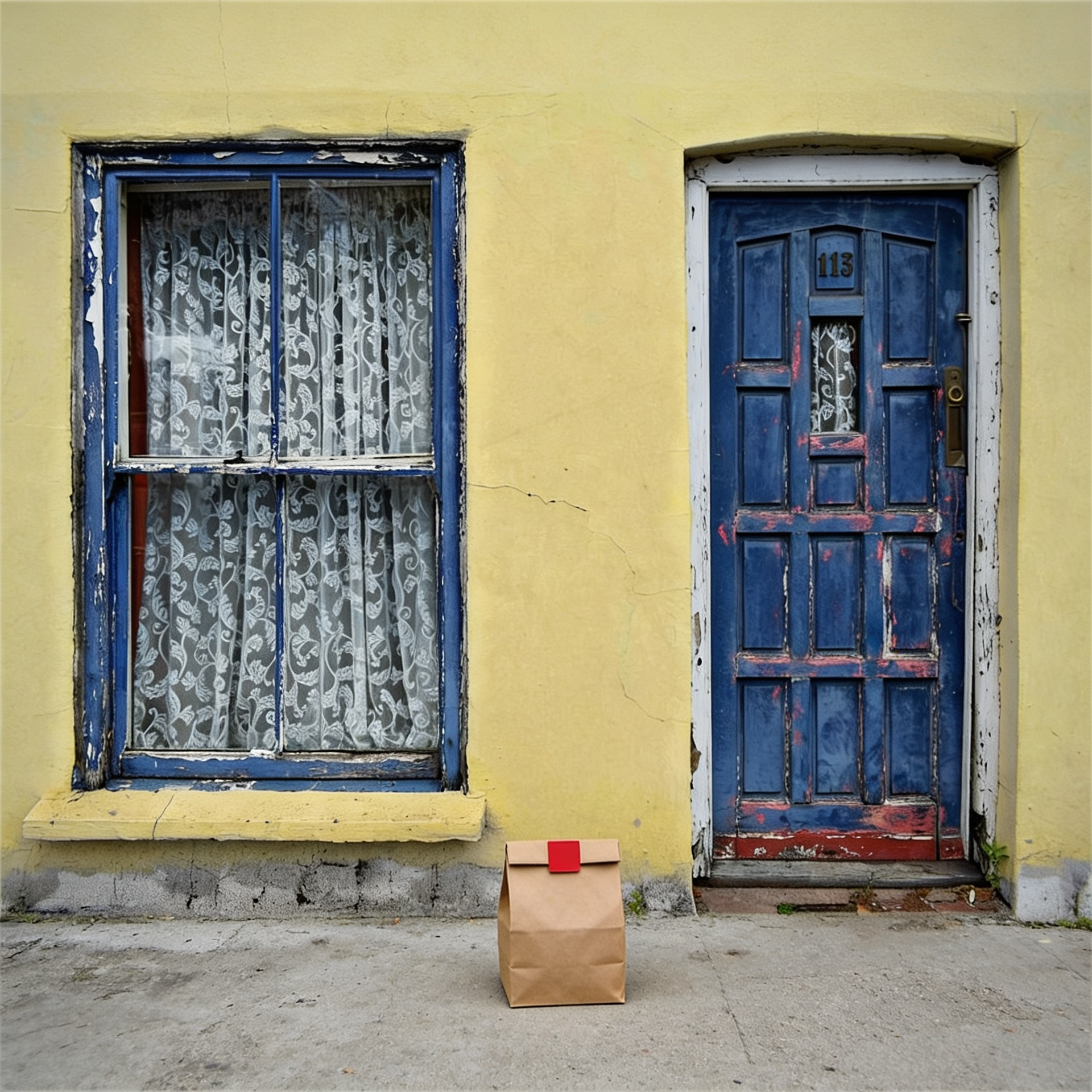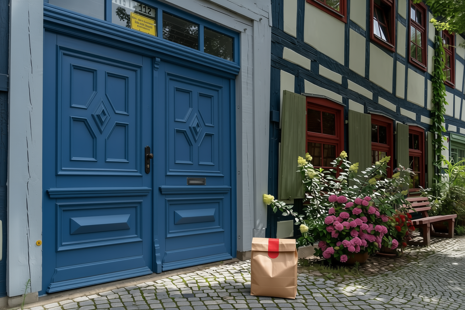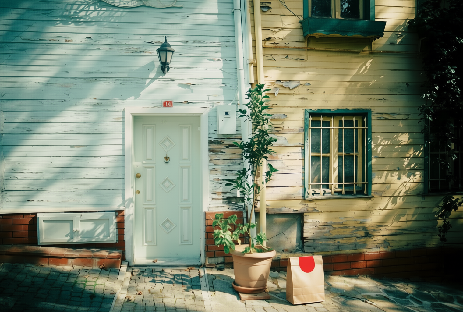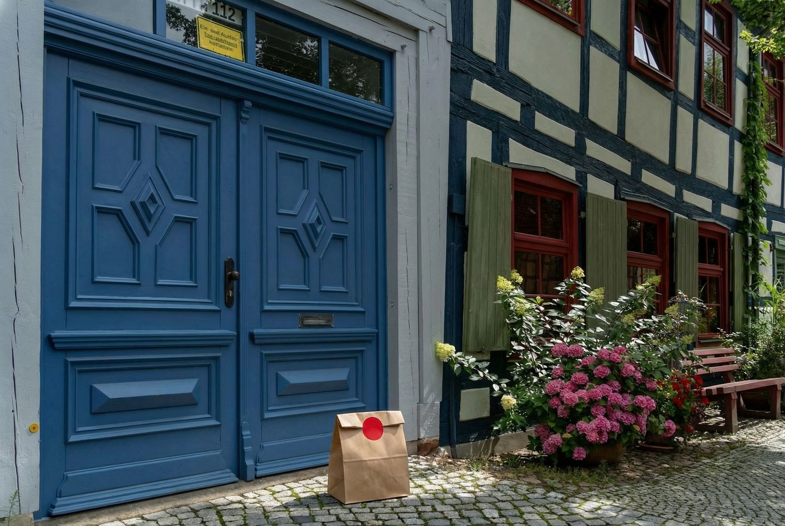 “In this existing photo, add a food delivery paper bag on the ground right in front of the door. The bag should be a small brown paper bag with a solid plain red sticker on the top keeping it closed. Preserve existing photo style and lighting as much as possible.”