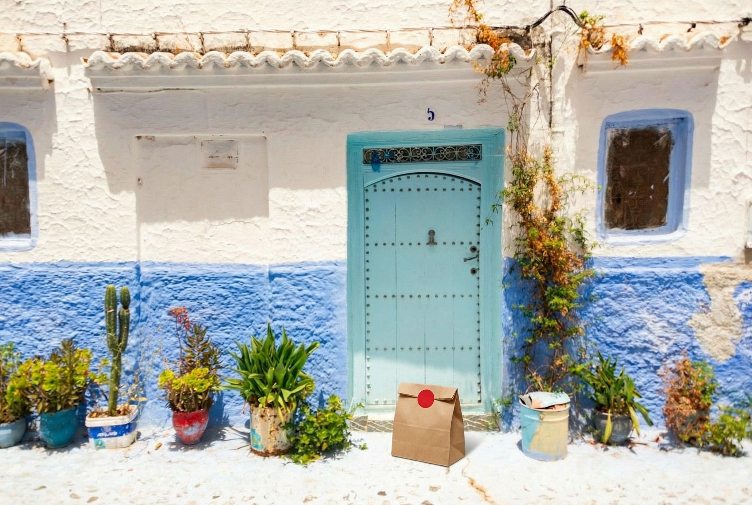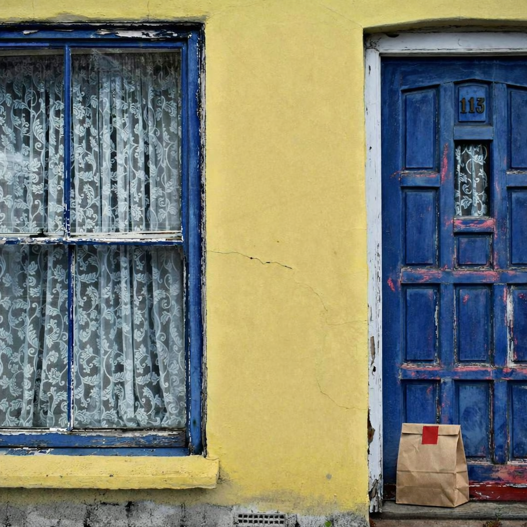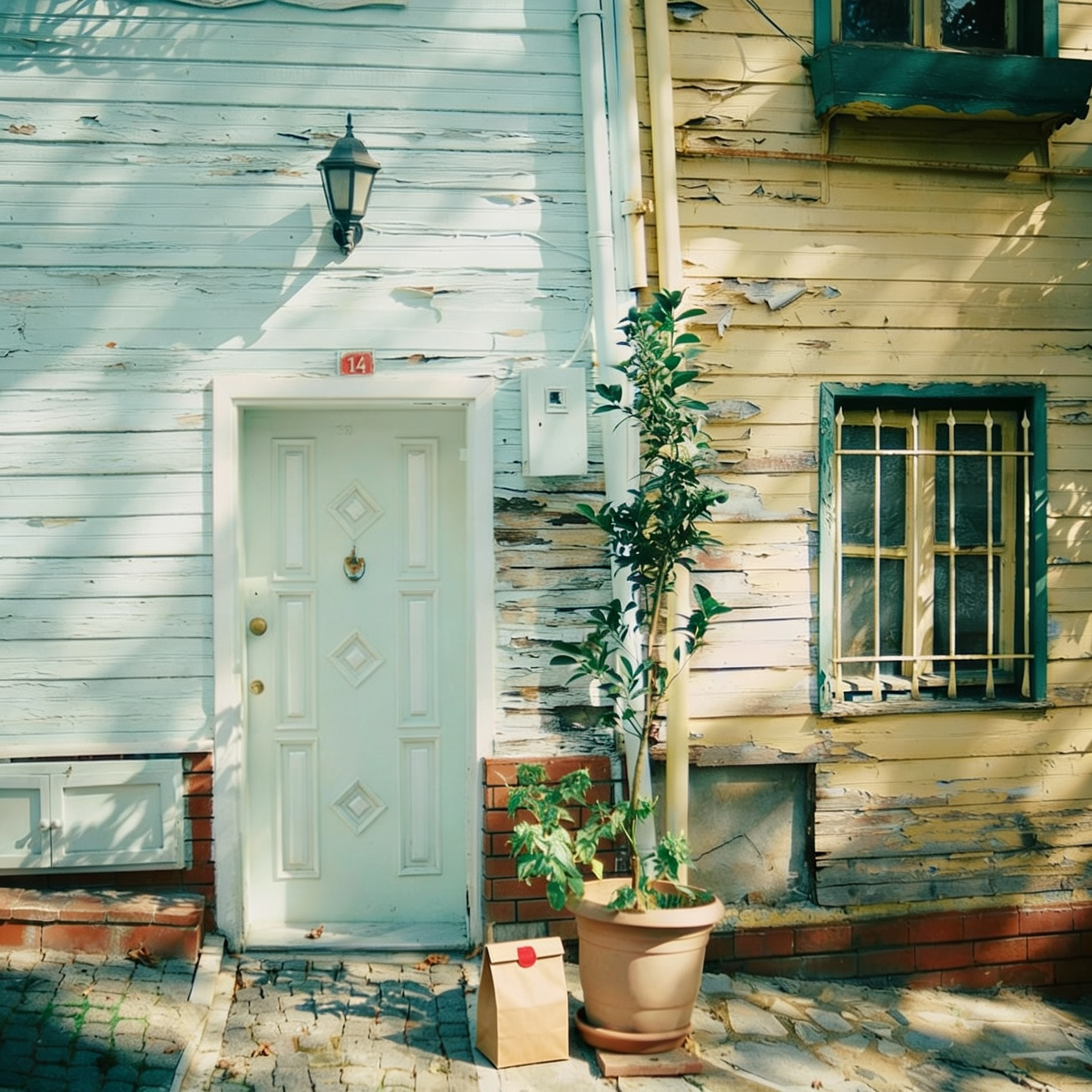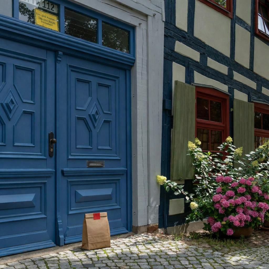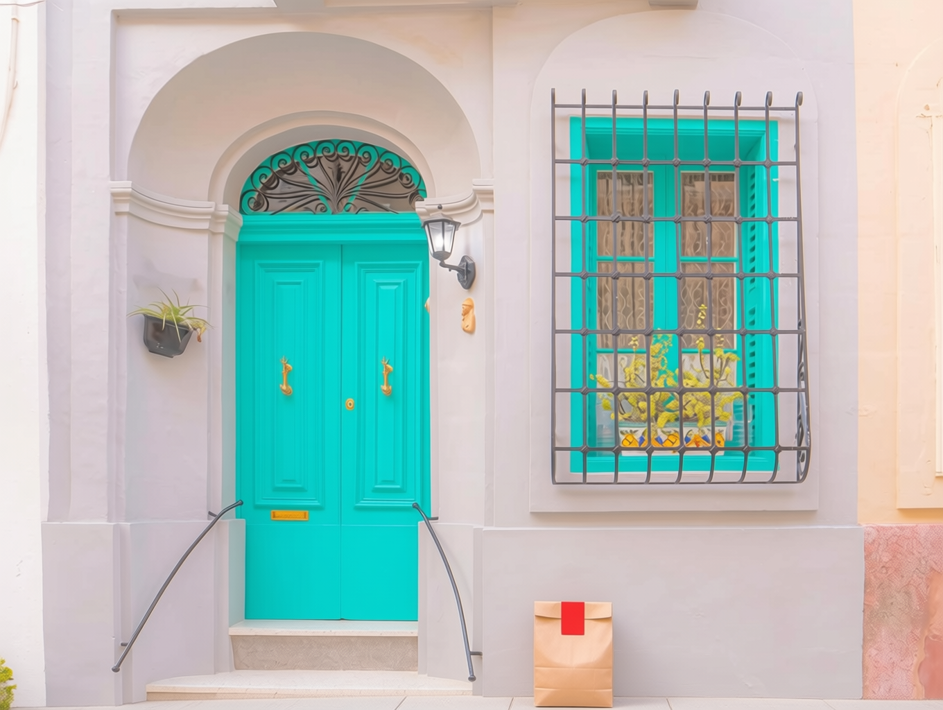 “In this existing photo, add a food delivery paper bag on the ground right in front of the door. The bag should be a small brown paper bag with a solid plain red sticker on the top keeping it closed. Preserve existing photo style and lighting as much as possible.”