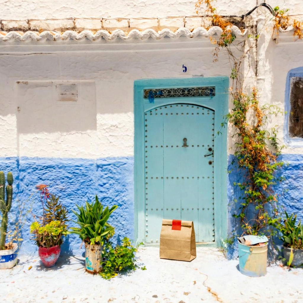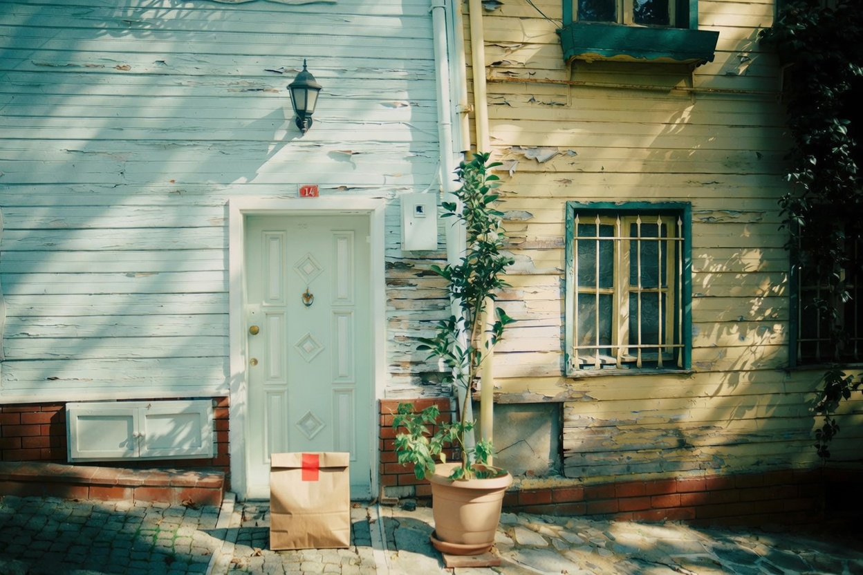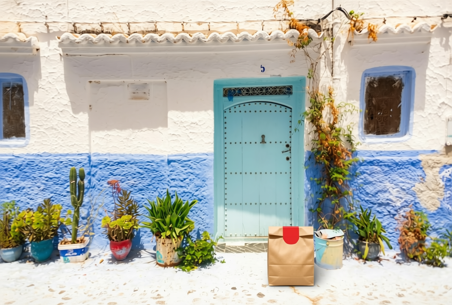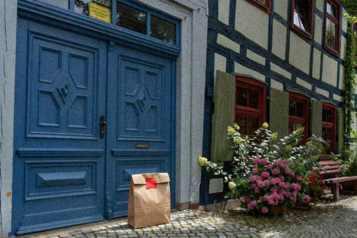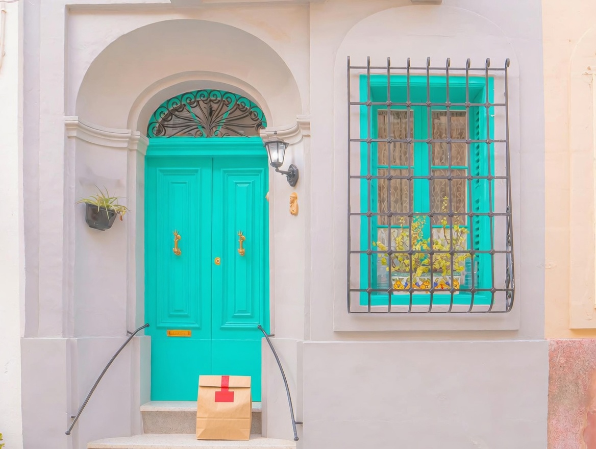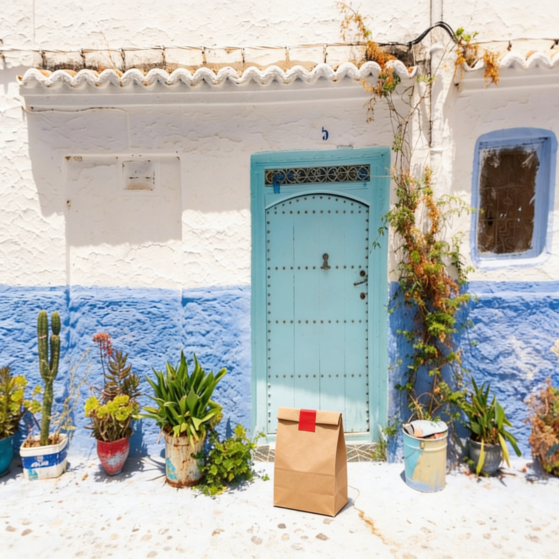 “In this existing photo, add a food delivery paper bag on the ground right in front of the door. The bag should be a small brown paper bag with a solid plain red sticker on the top keeping it closed. Preserve existing photo style and lighting as much as possible.”