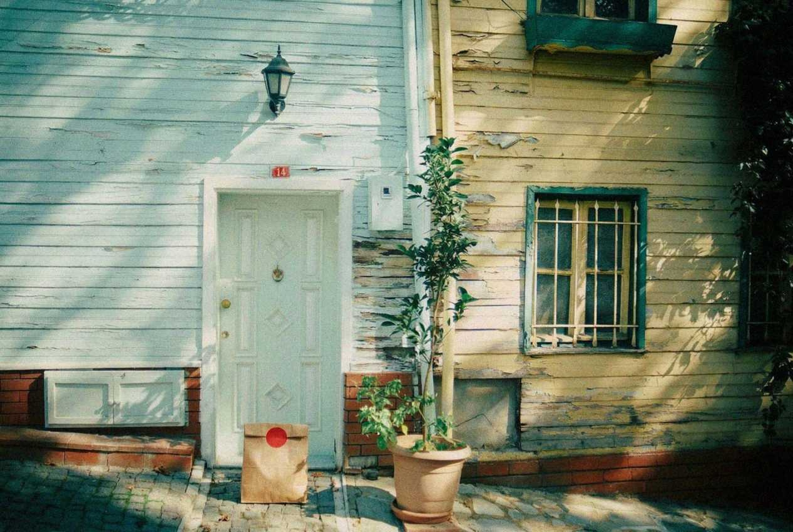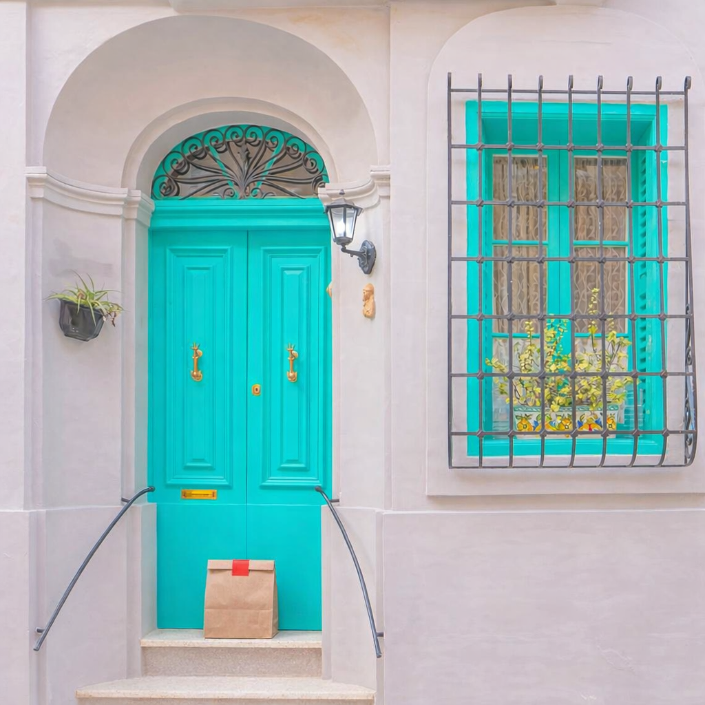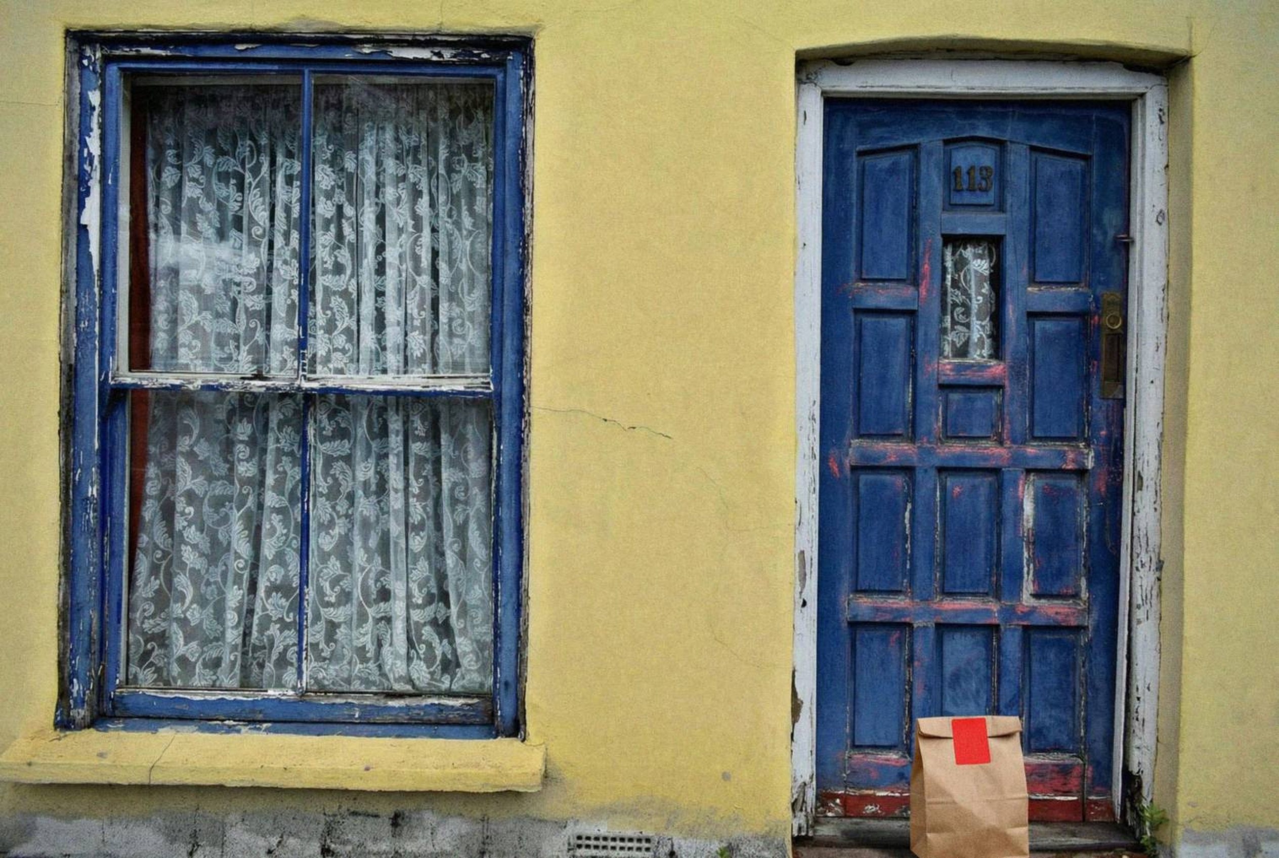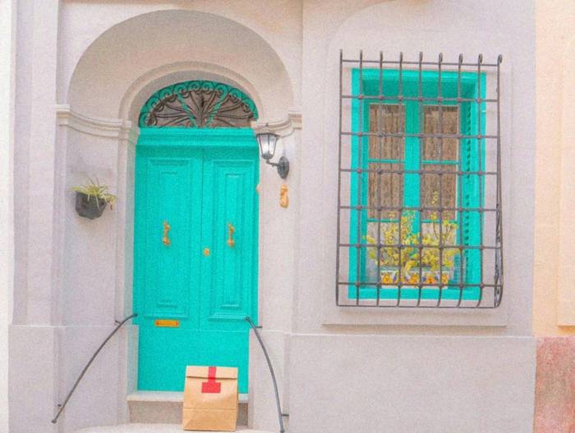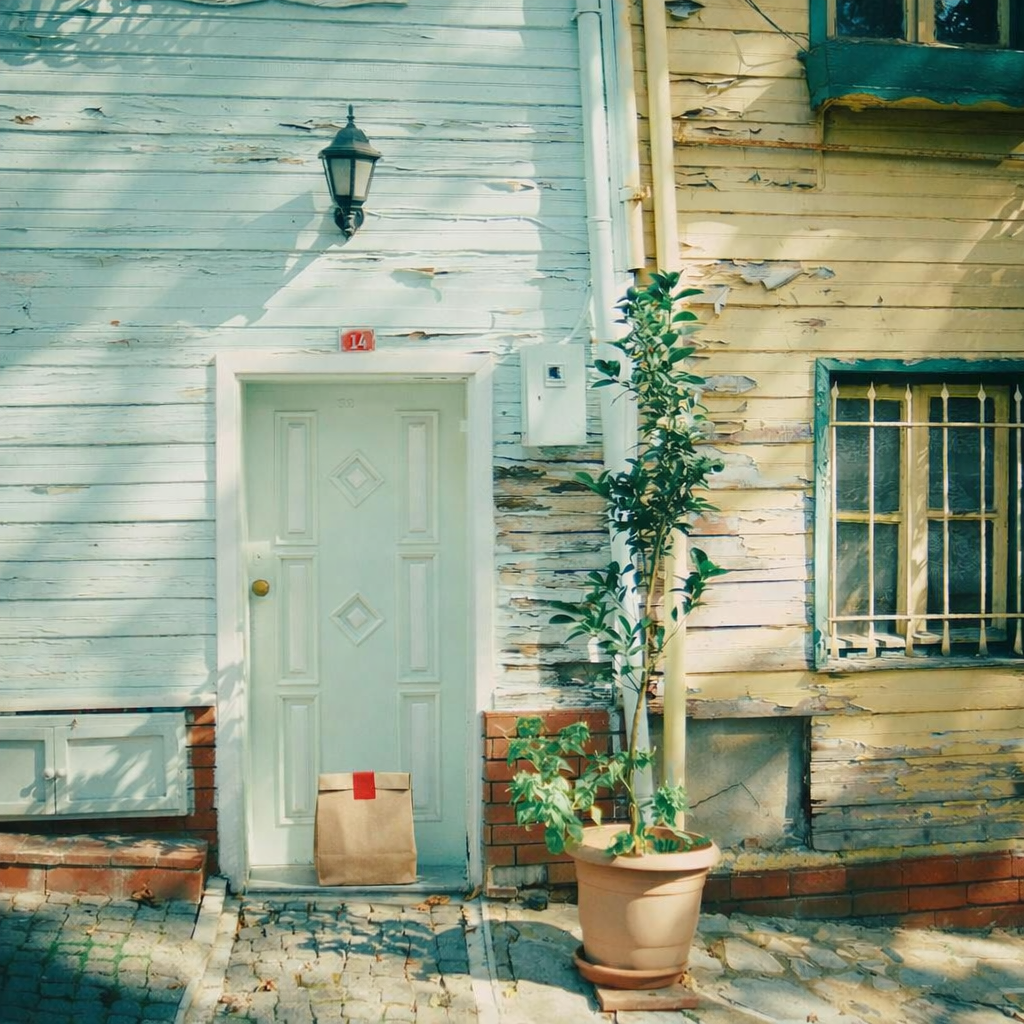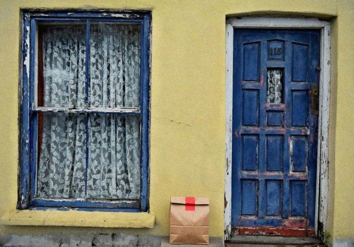 “In this existing photo, add a food delivery paper bag on the ground right in front of the door. The bag should be a small brown paper bag with a solid plain red sticker on the top keeping it closed. Preserve existing photo style and lighting as much as possible.”