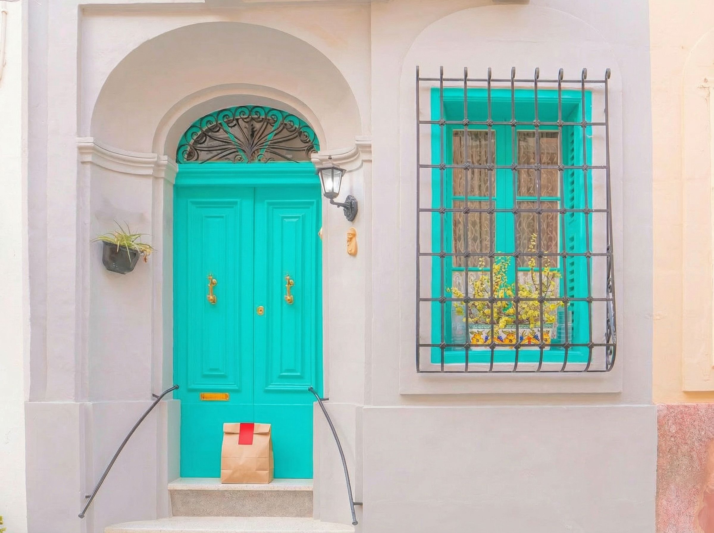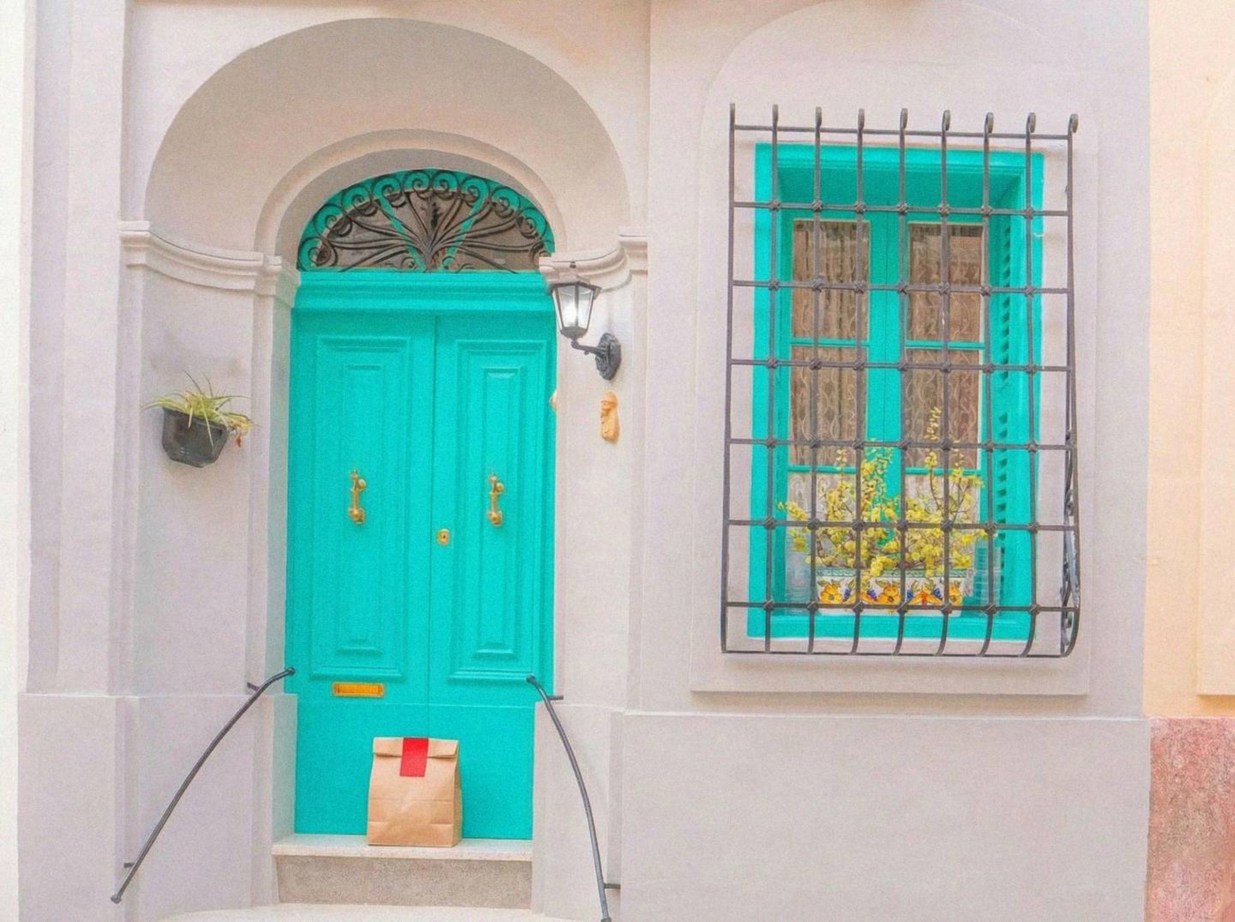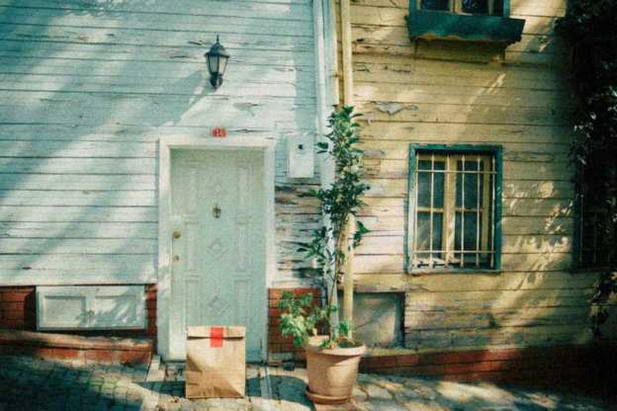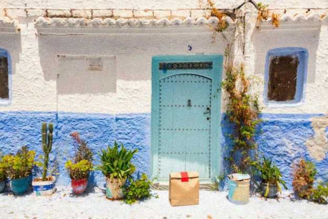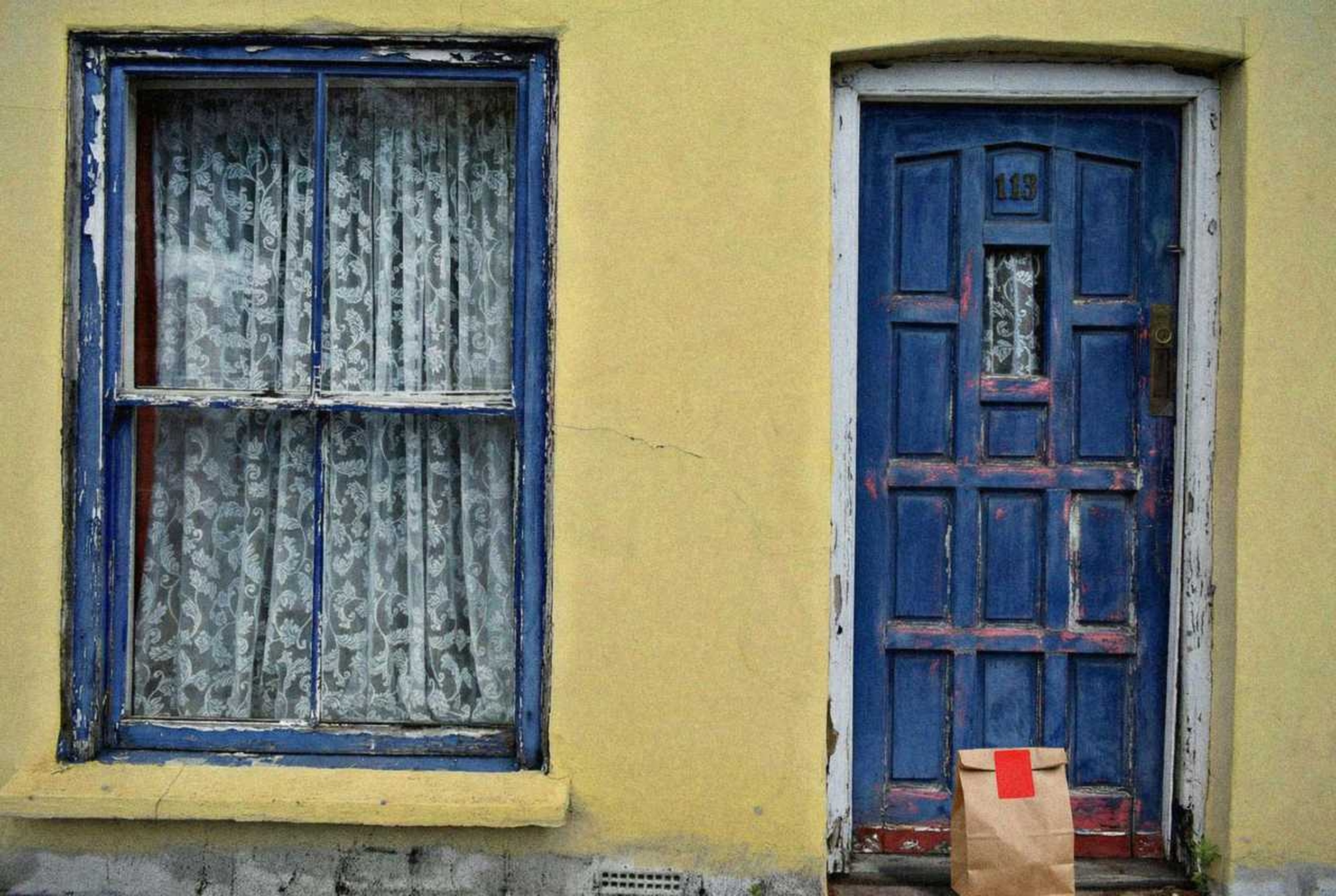 “In this existing photo, add a food delivery paper bag on the ground right in front of the door. The bag should be a small brown paper bag with a solid plain red sticker on the top keeping it closed. Preserve existing photo style and lighting as much as possible.”