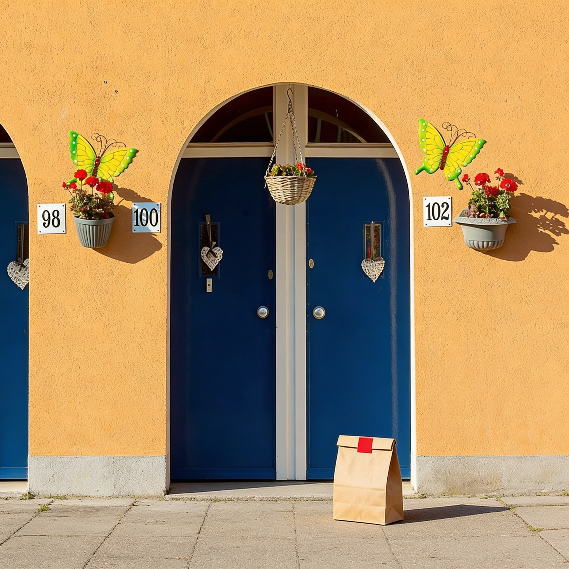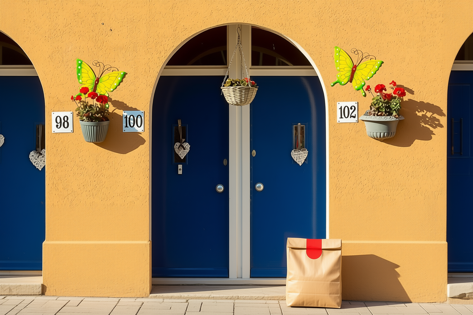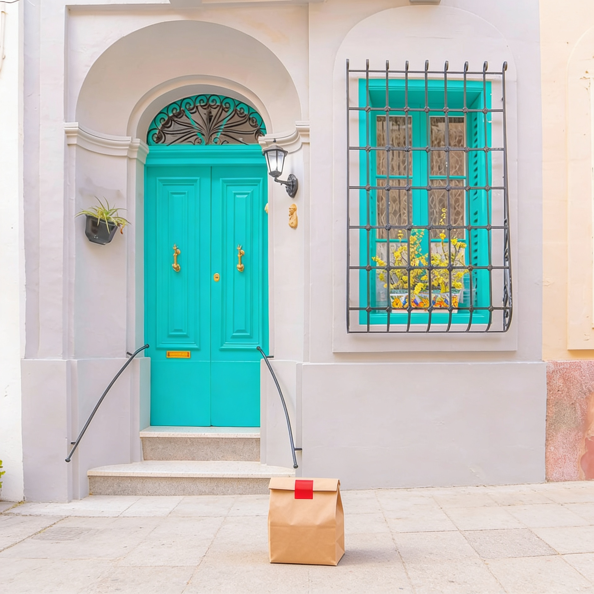 Delivery: We took real front door photos and used AI to add a fake delivery bag to the photo.