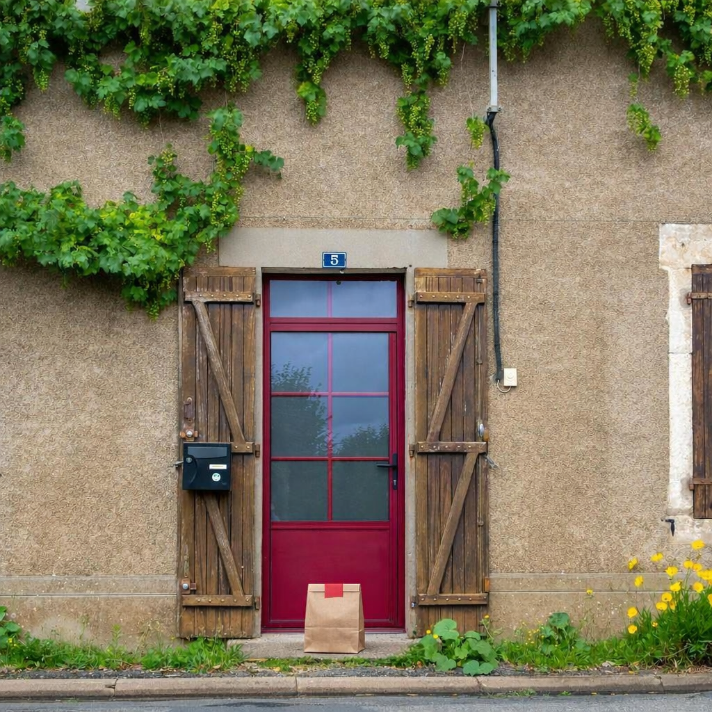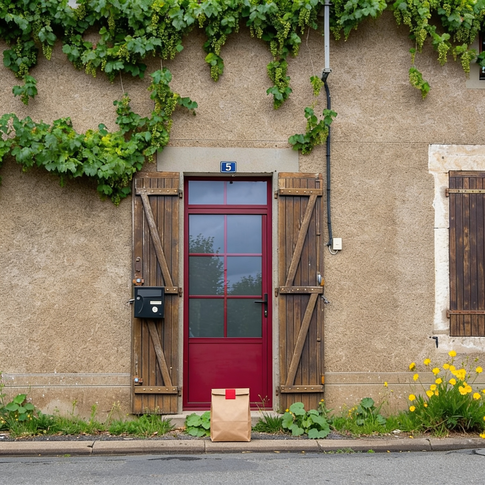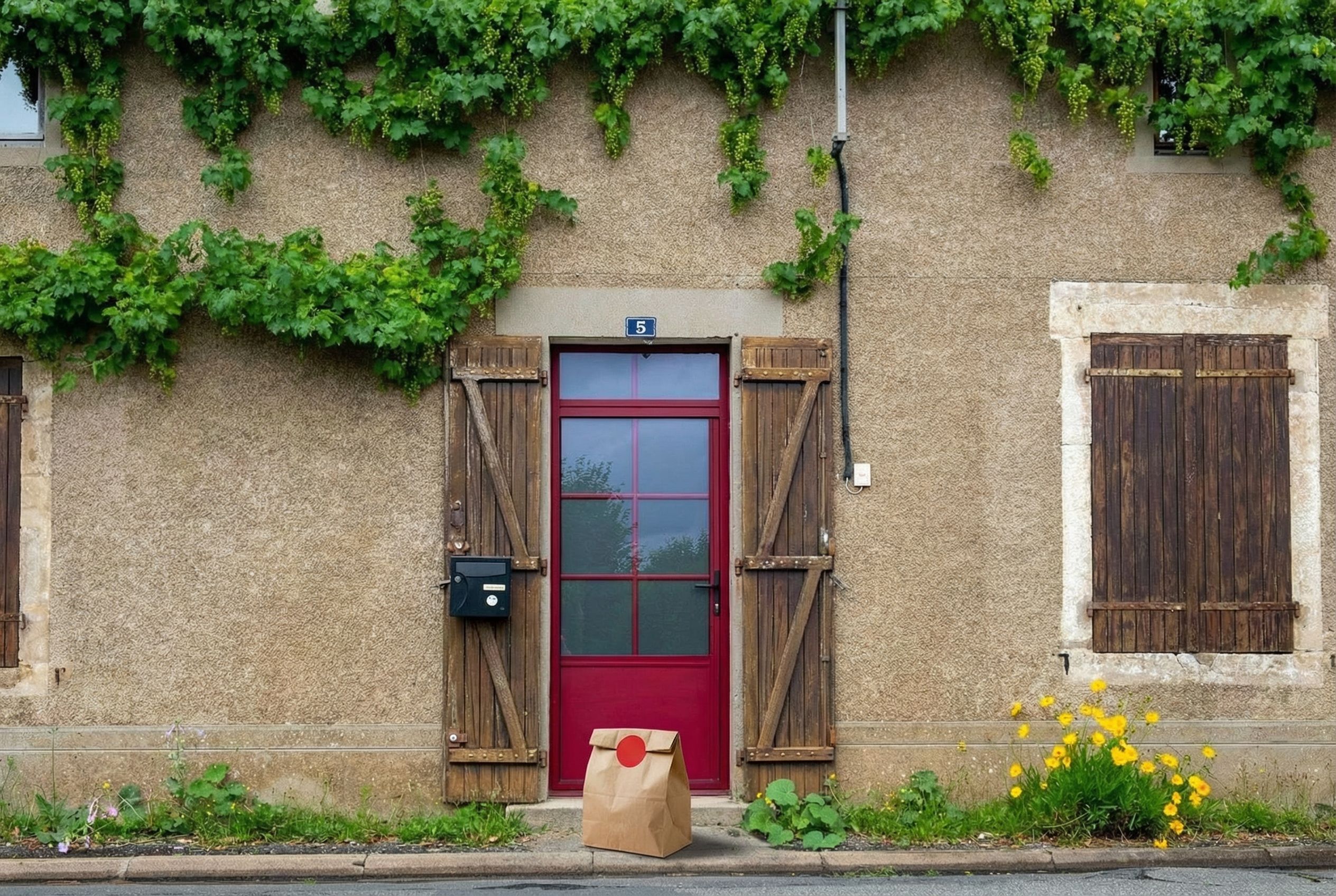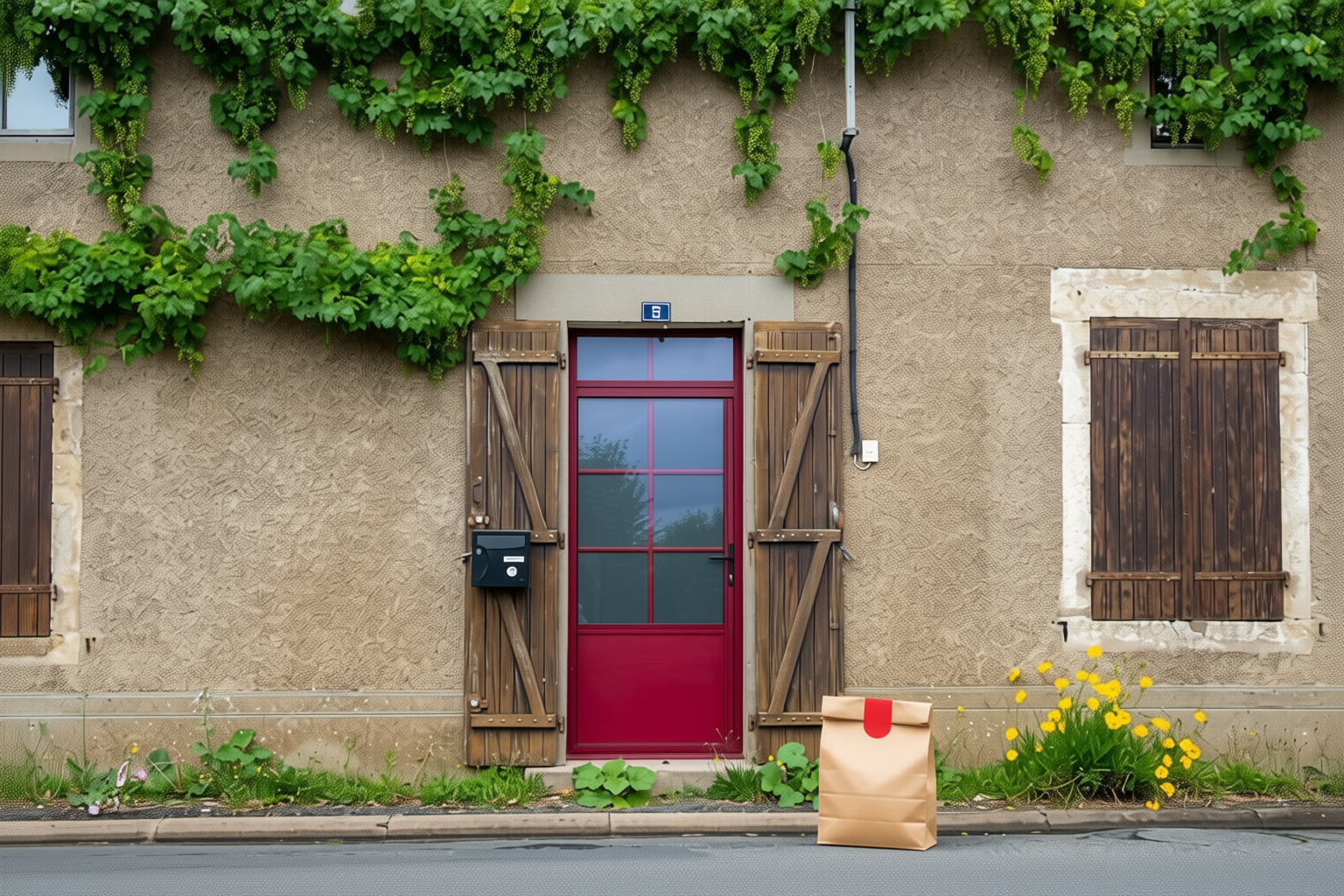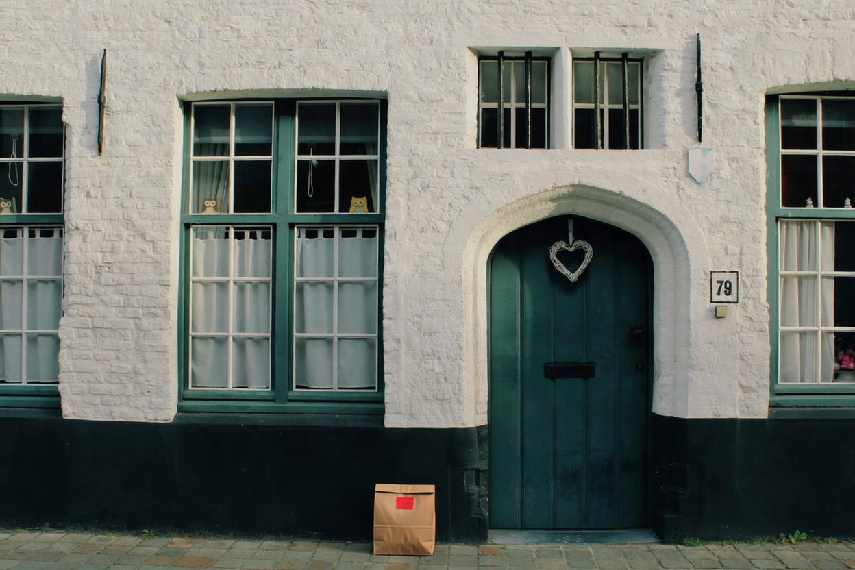 “In this existing photo, add a food delivery paper bag on the ground right in front of the door. The bag should be a small brown paper bag with a solid plain red sticker on the top keeping it closed. Preserve existing photo style and lighting as much as possible.”