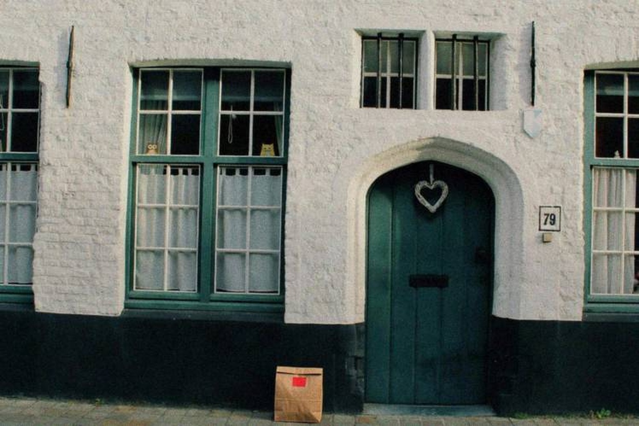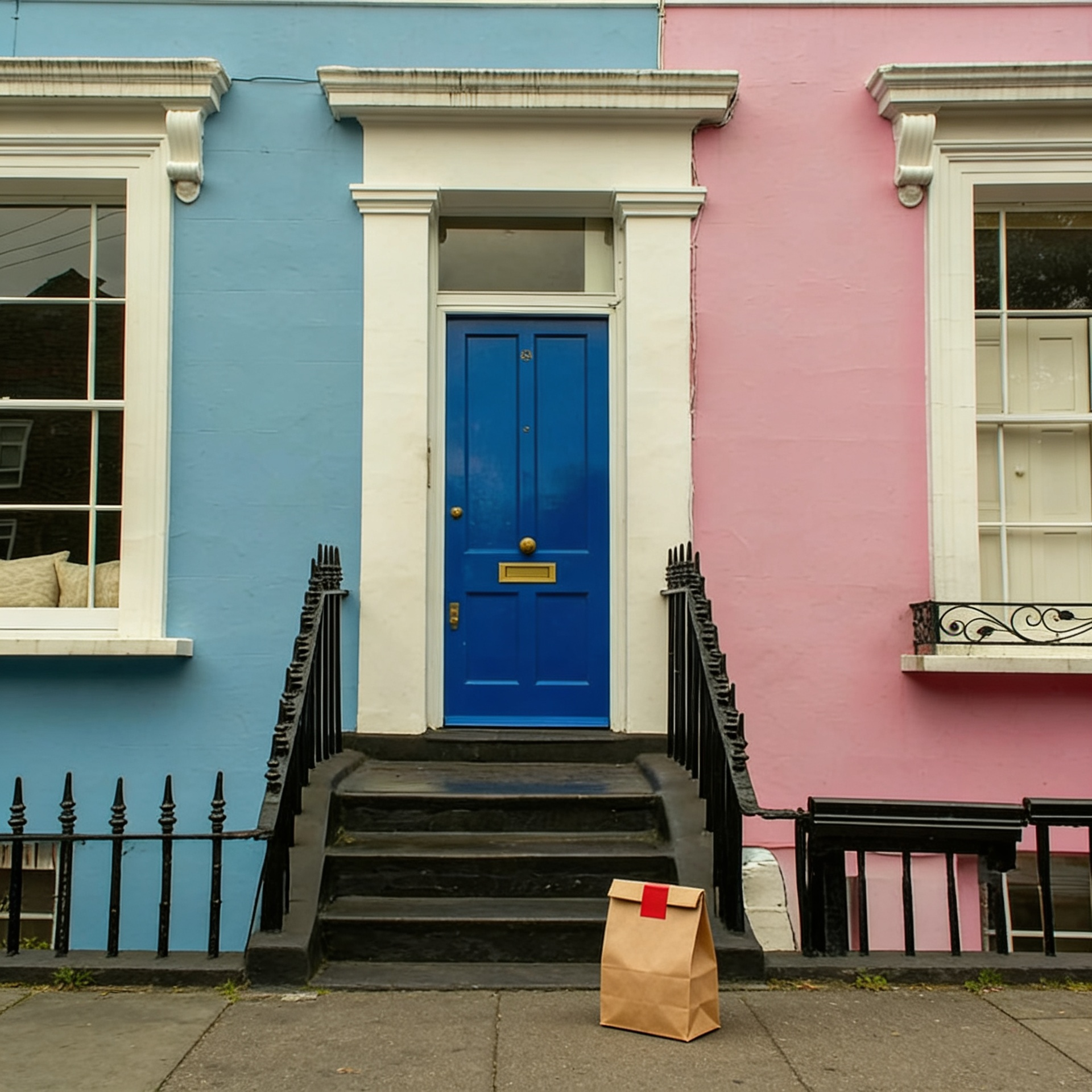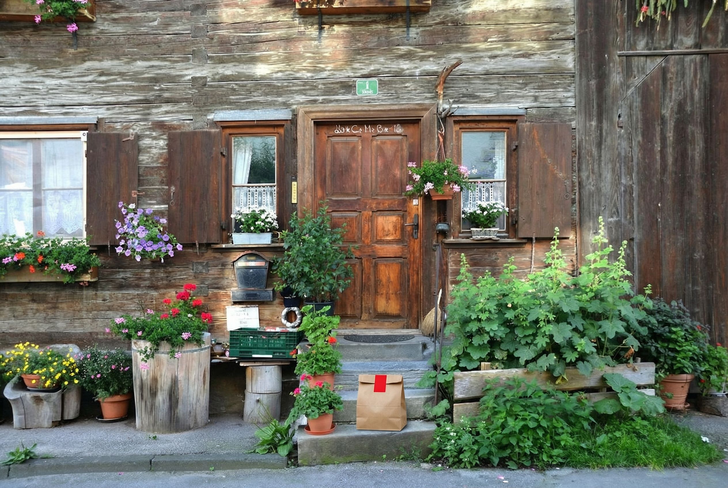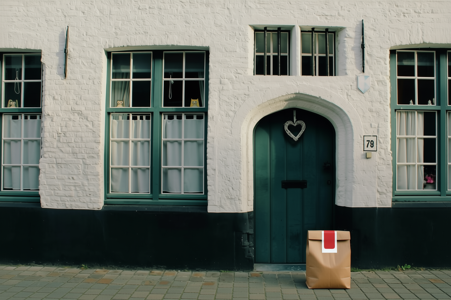 “In this existing photo, add a food delivery paper bag on the ground right in front of the door. The bag should be a small brown paper bag with a solid plain red sticker on the top keeping it closed. Preserve existing photo style and lighting as much as possible.”