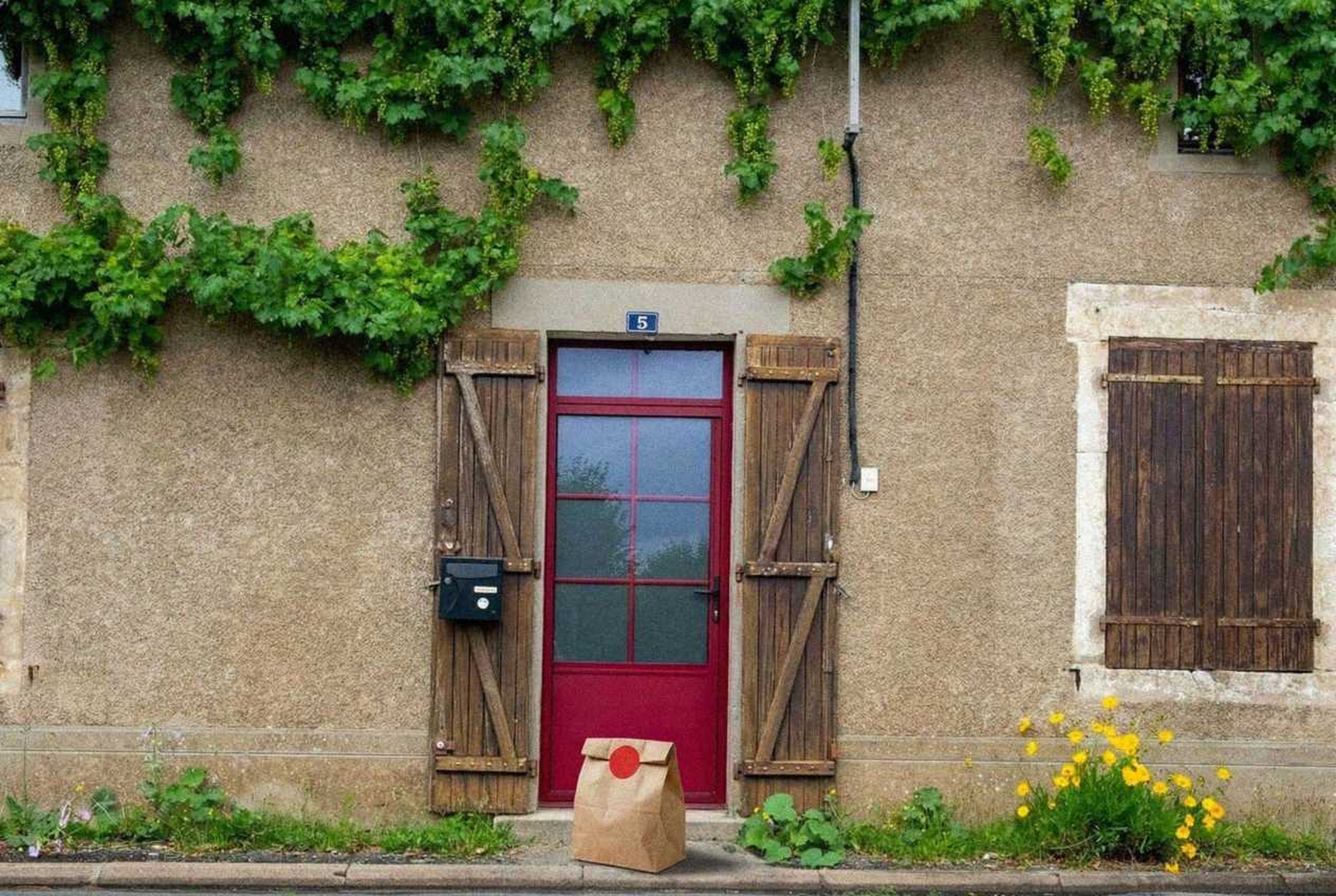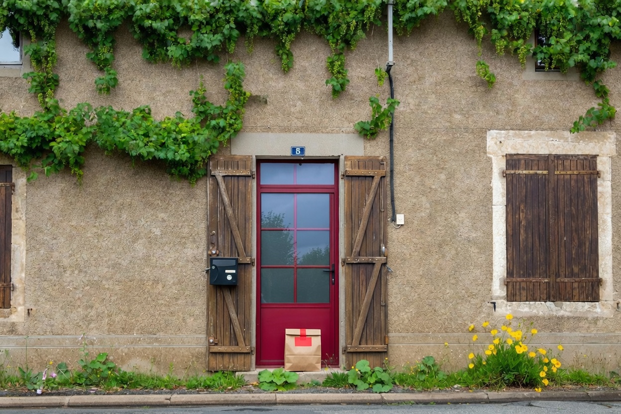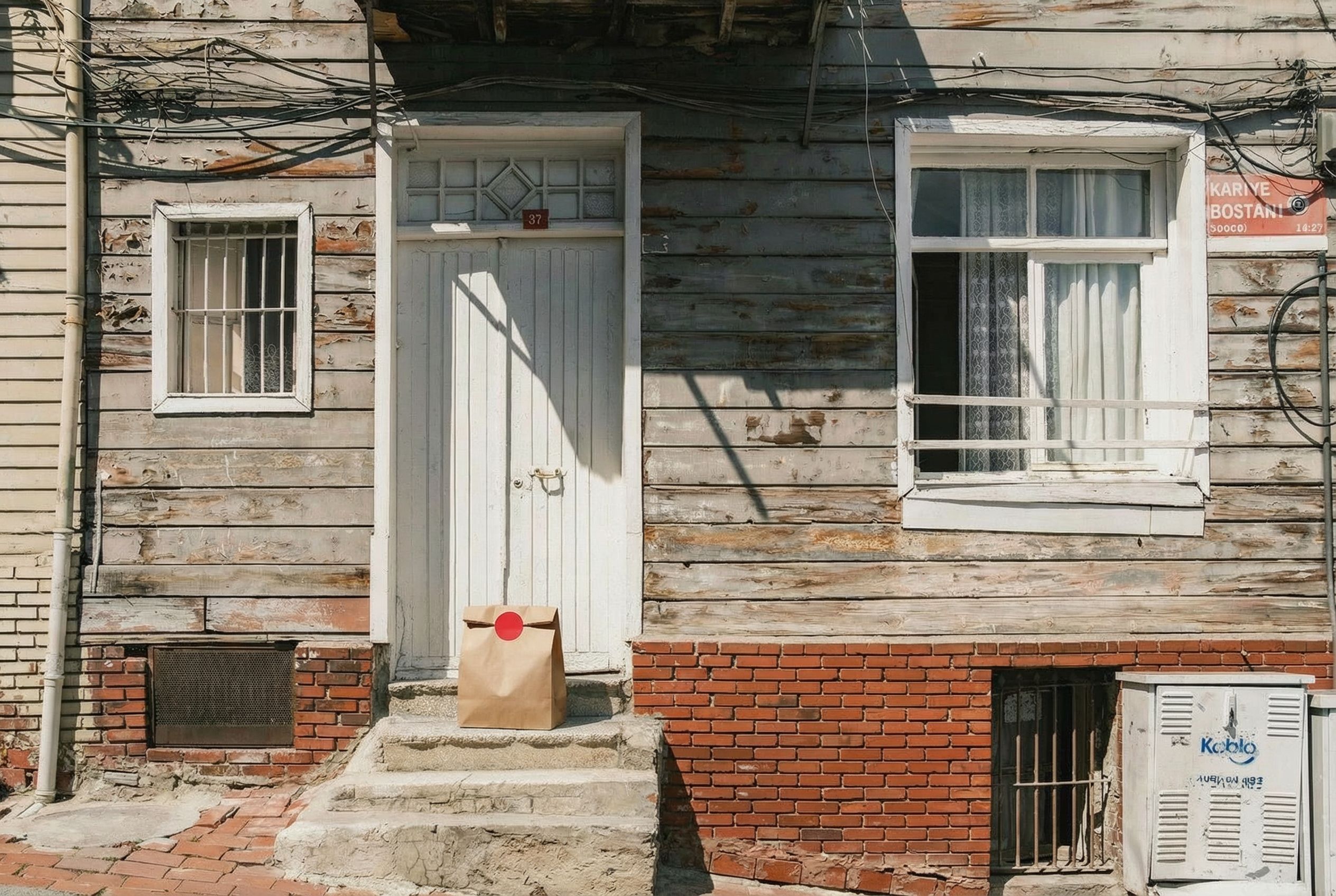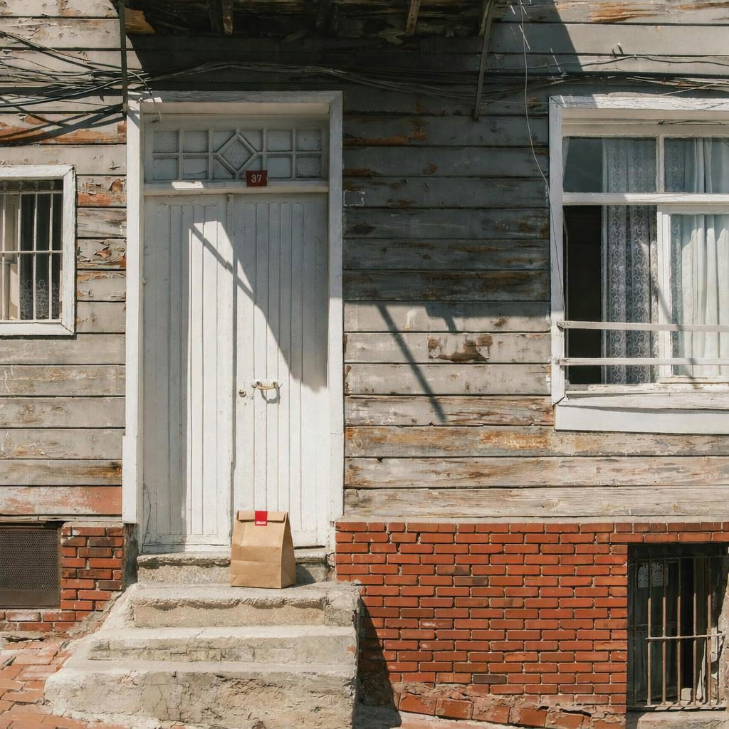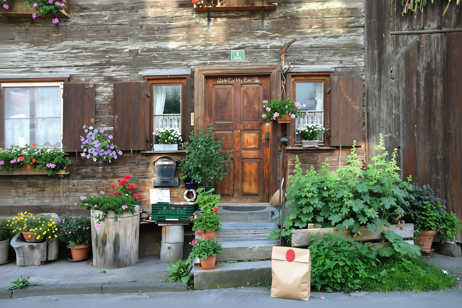 “In this existing photo, add a food delivery paper bag on the ground right in front of the door. The bag should be a small brown paper bag with a solid plain red sticker on the top keeping it closed. Preserve existing photo style and lighting as much as possible.”