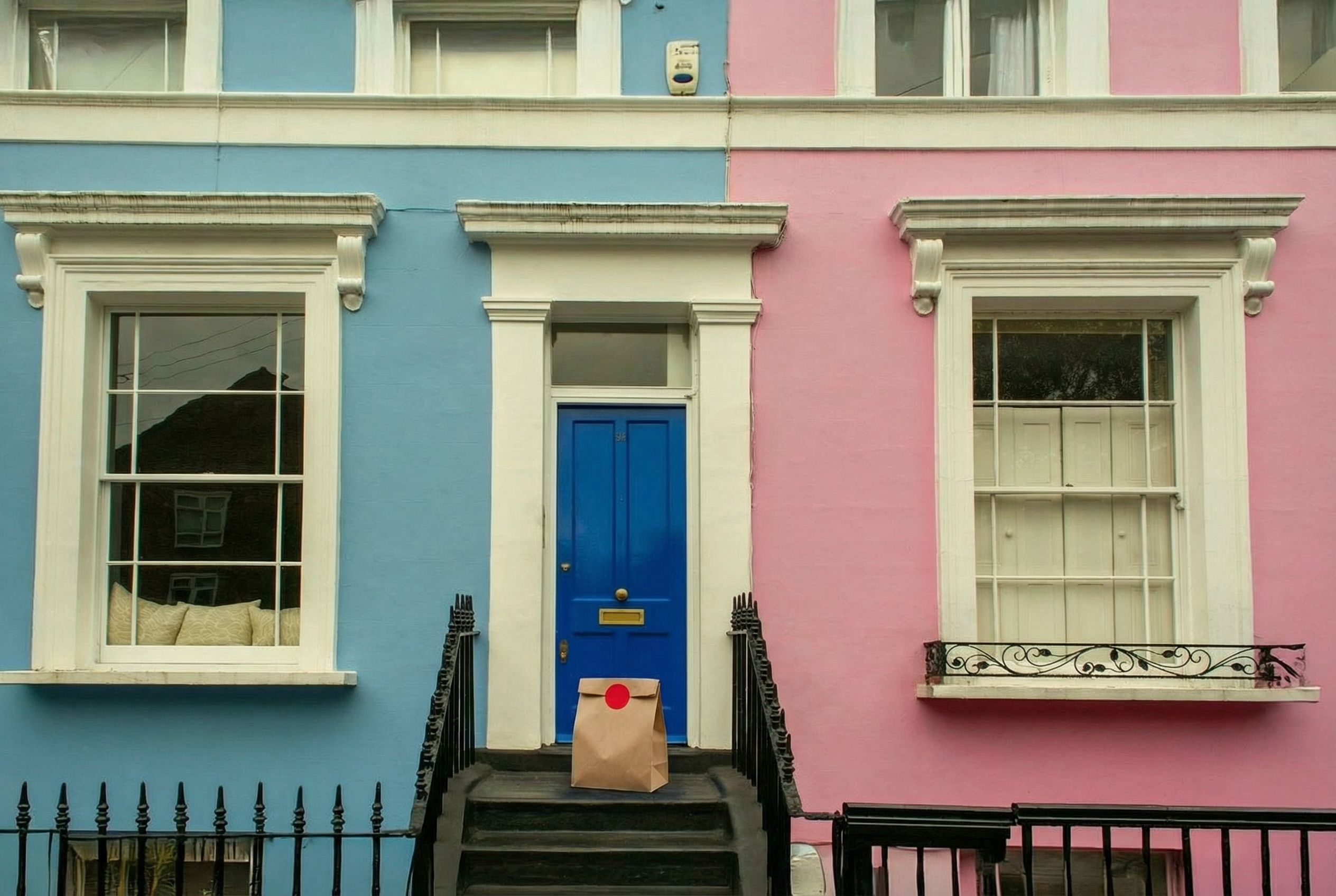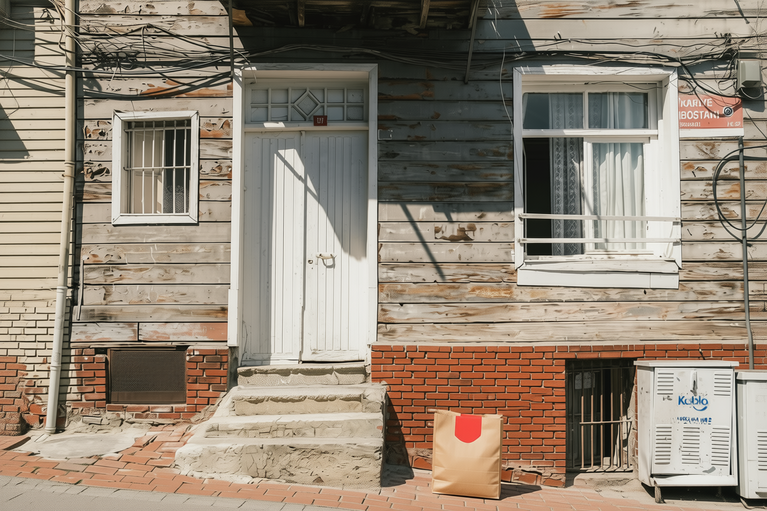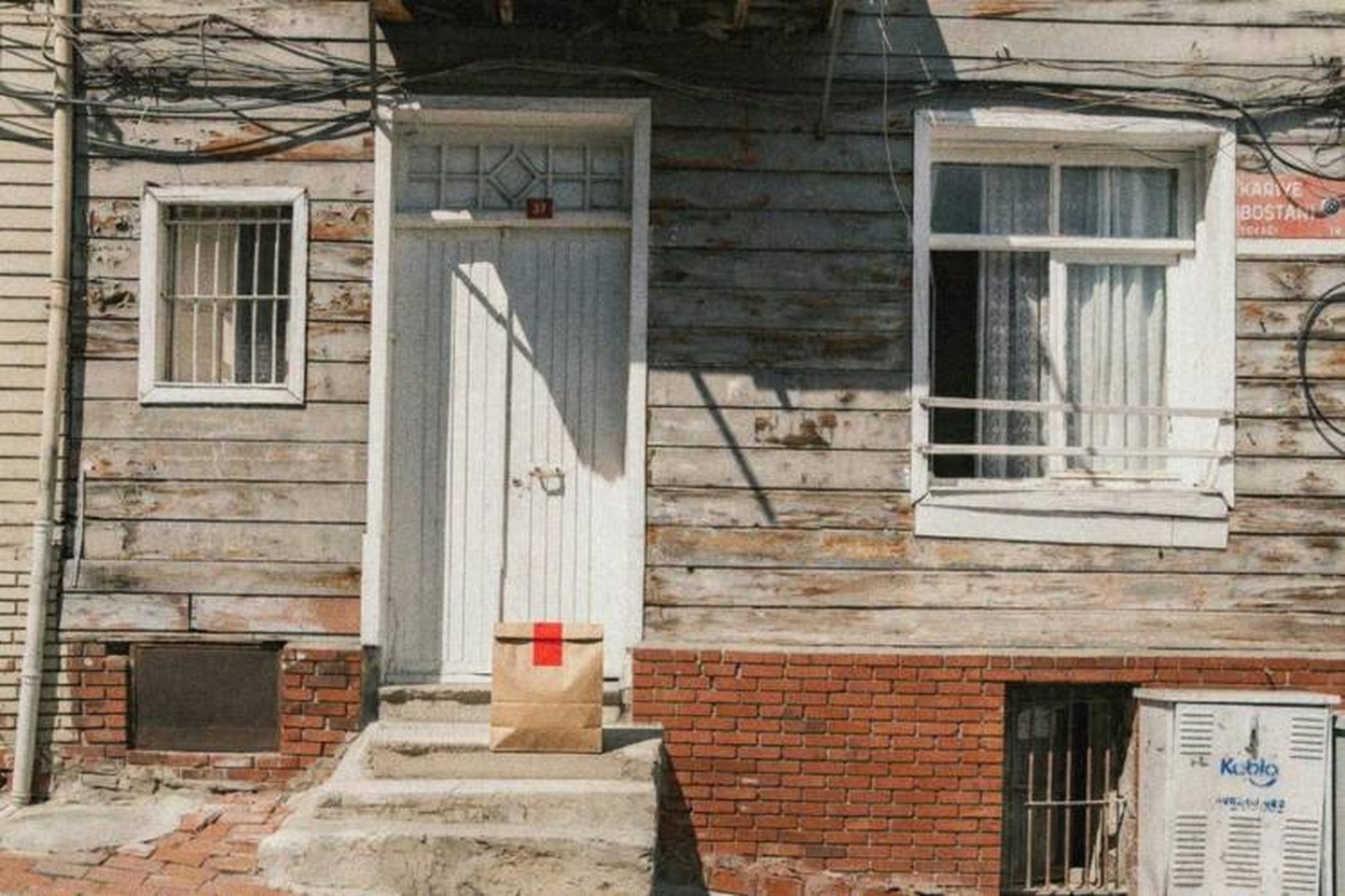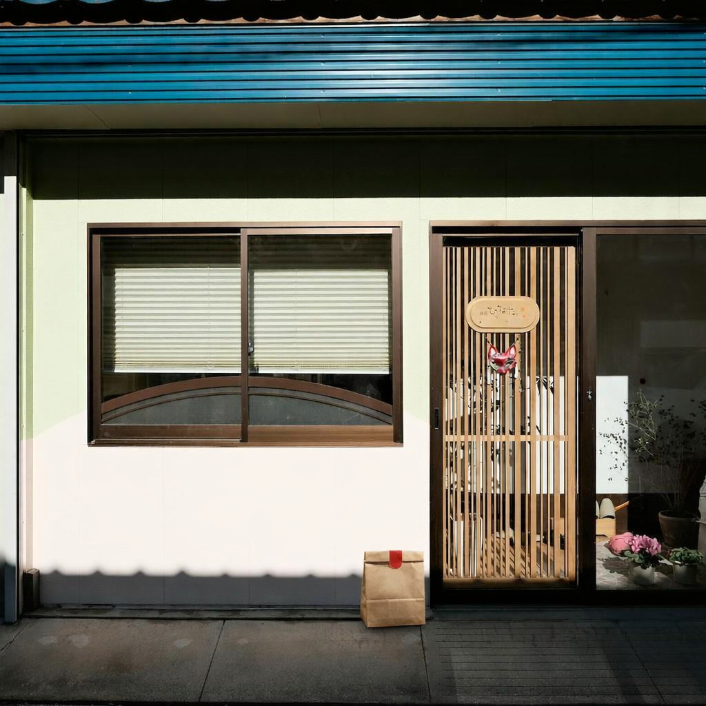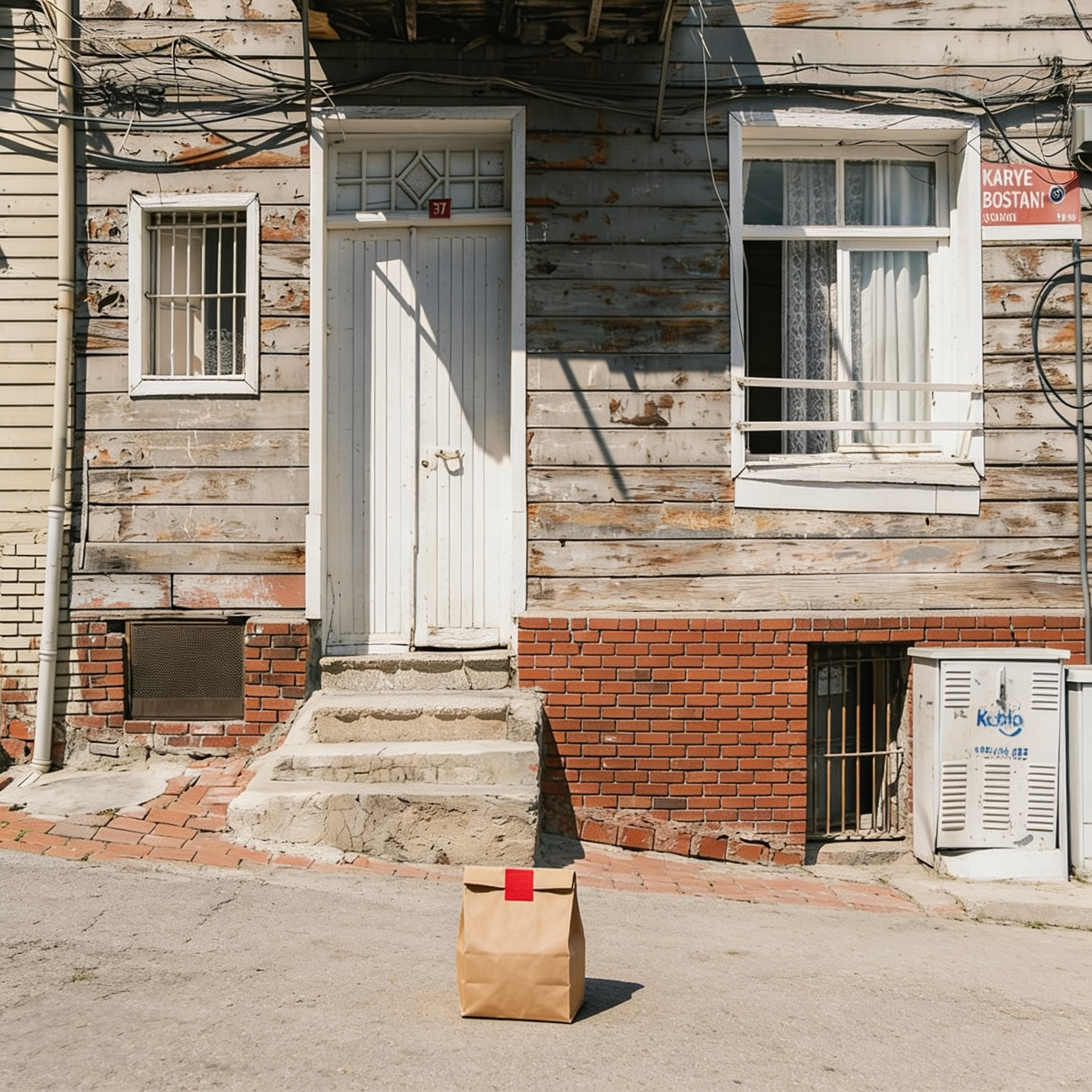 “In this existing photo, add a food delivery paper bag on the ground right in front of the door. The bag should be a small brown paper bag with a solid plain red sticker on the top keeping it closed. Preserve existing photo style and lighting as much as possible.”