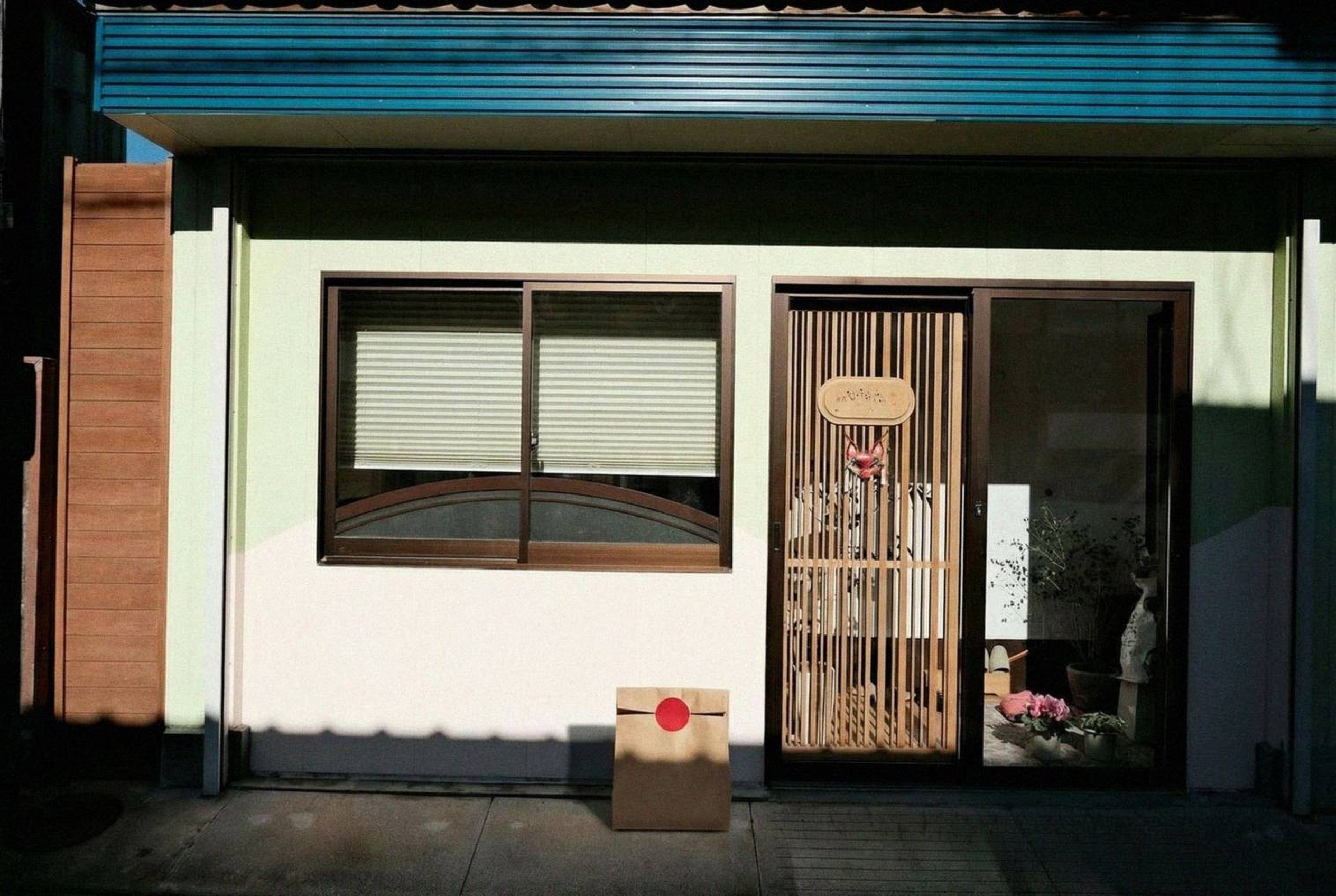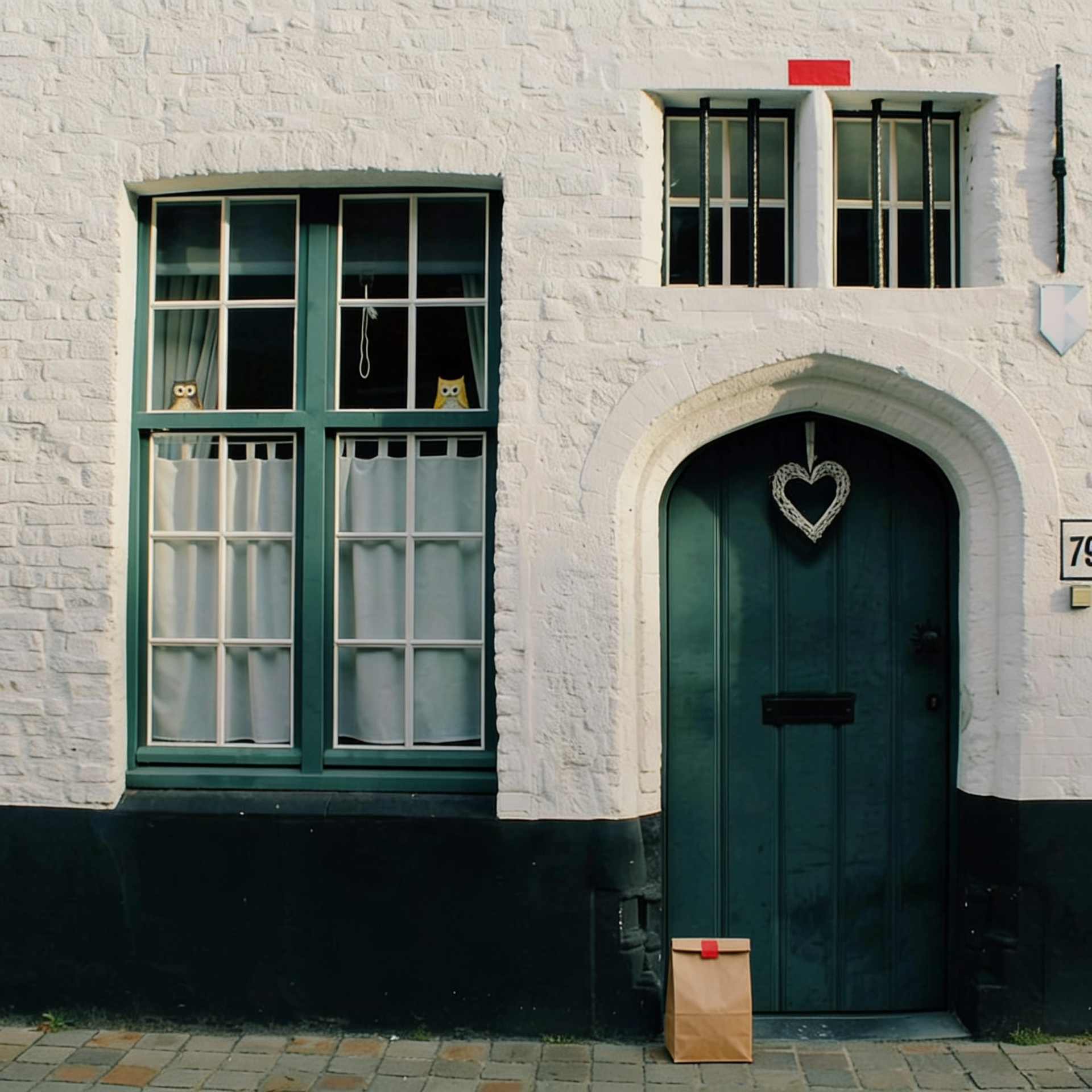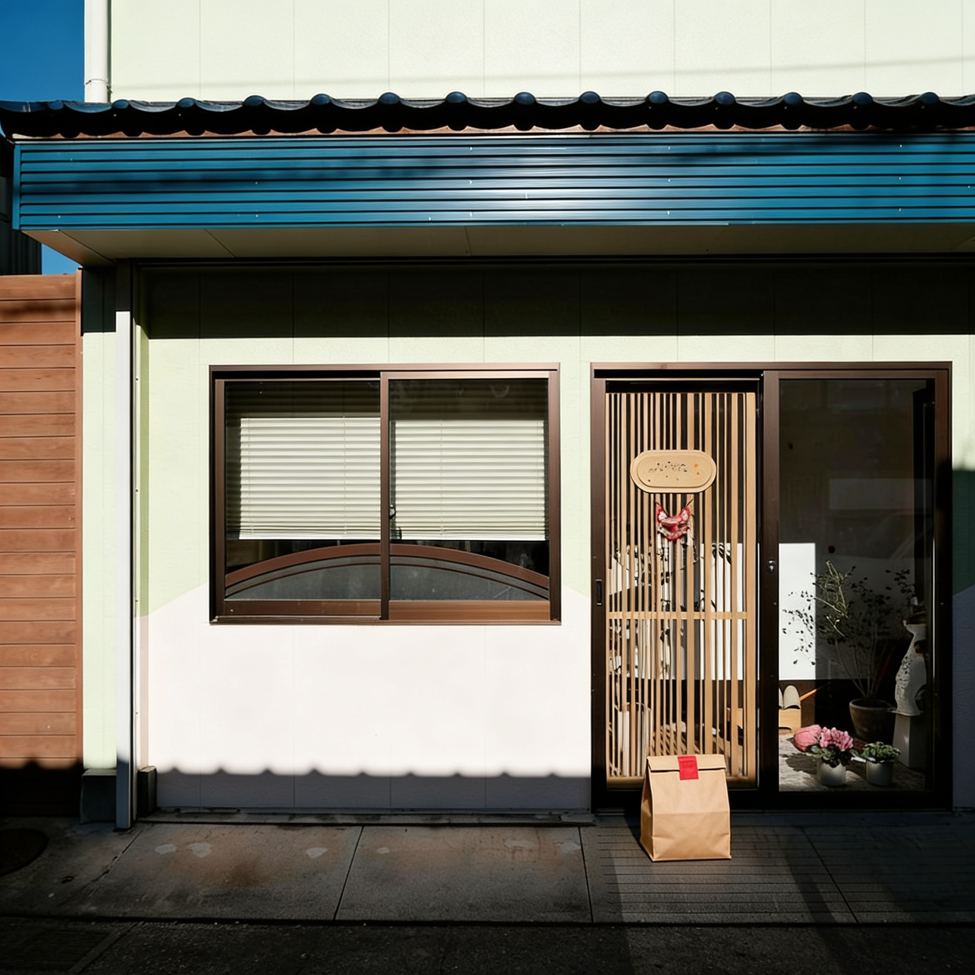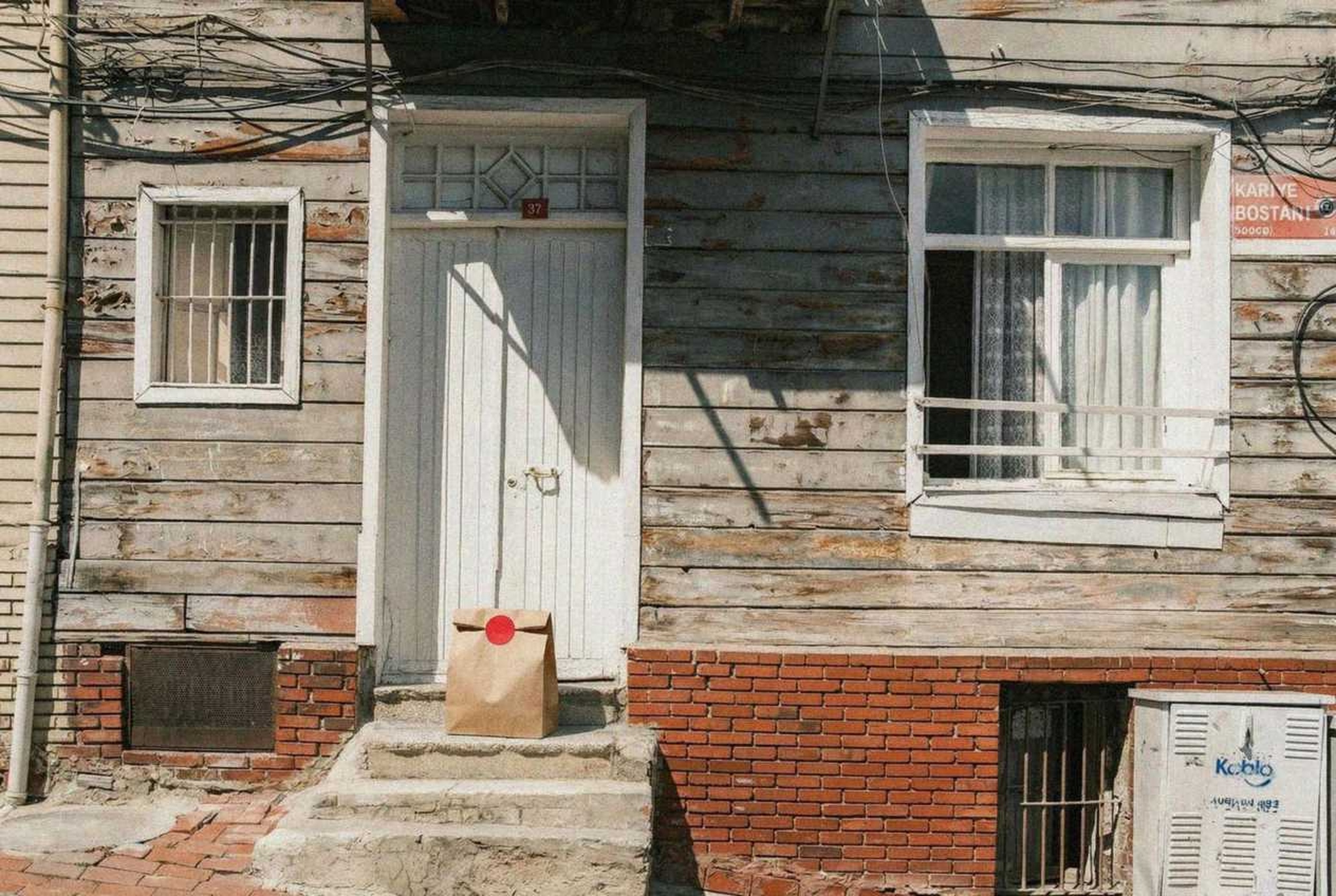 “In this existing photo, add a food delivery paper bag on the ground right in front of the door. The bag should be a small brown paper bag with a solid plain red sticker on the top keeping it closed. Preserve existing photo style and lighting as much as possible.”