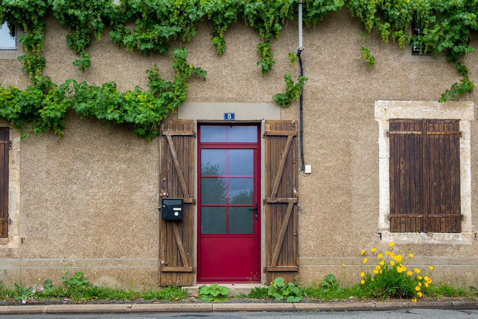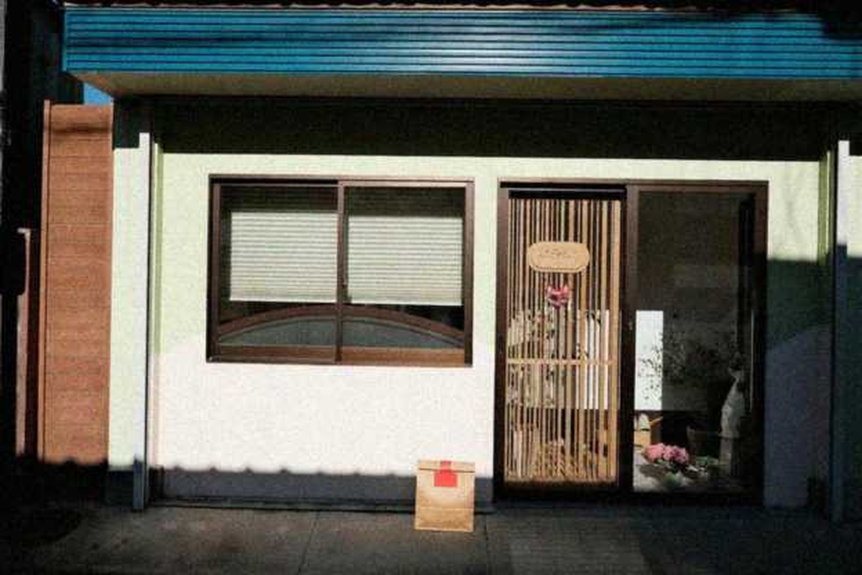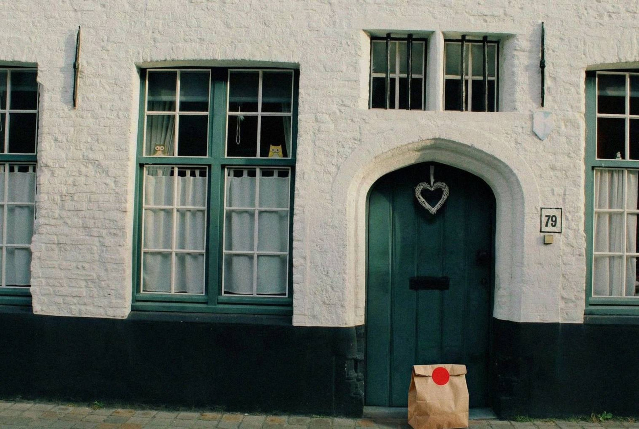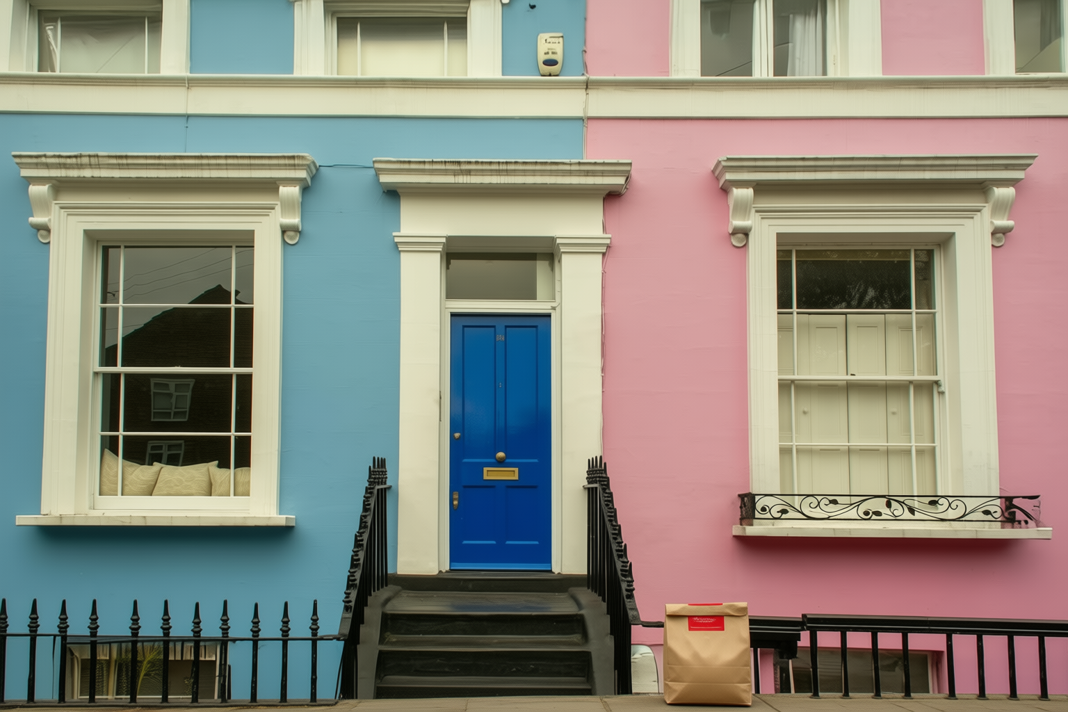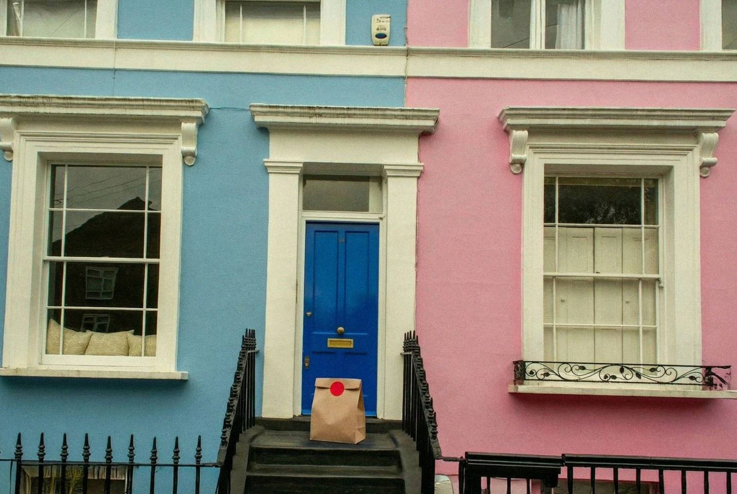 “In this existing photo, add a food delivery paper bag on the ground right in front of the door. The bag should be a small brown paper bag with a solid plain red sticker on the top keeping it closed. Preserve existing photo style and lighting as much as possible.”
