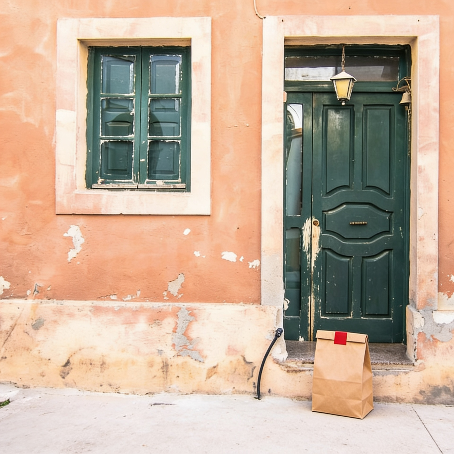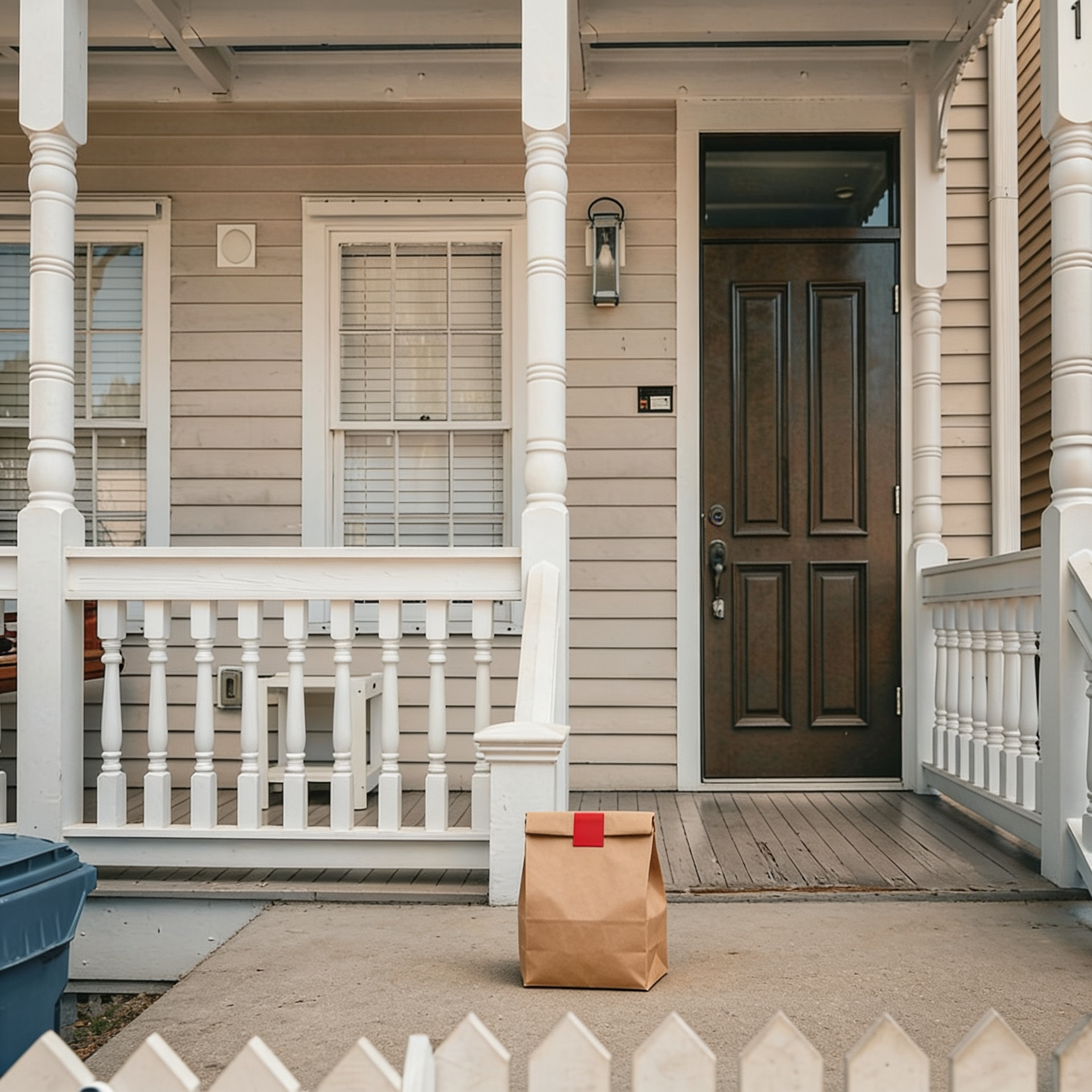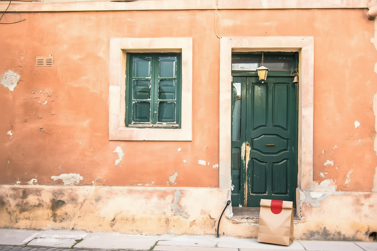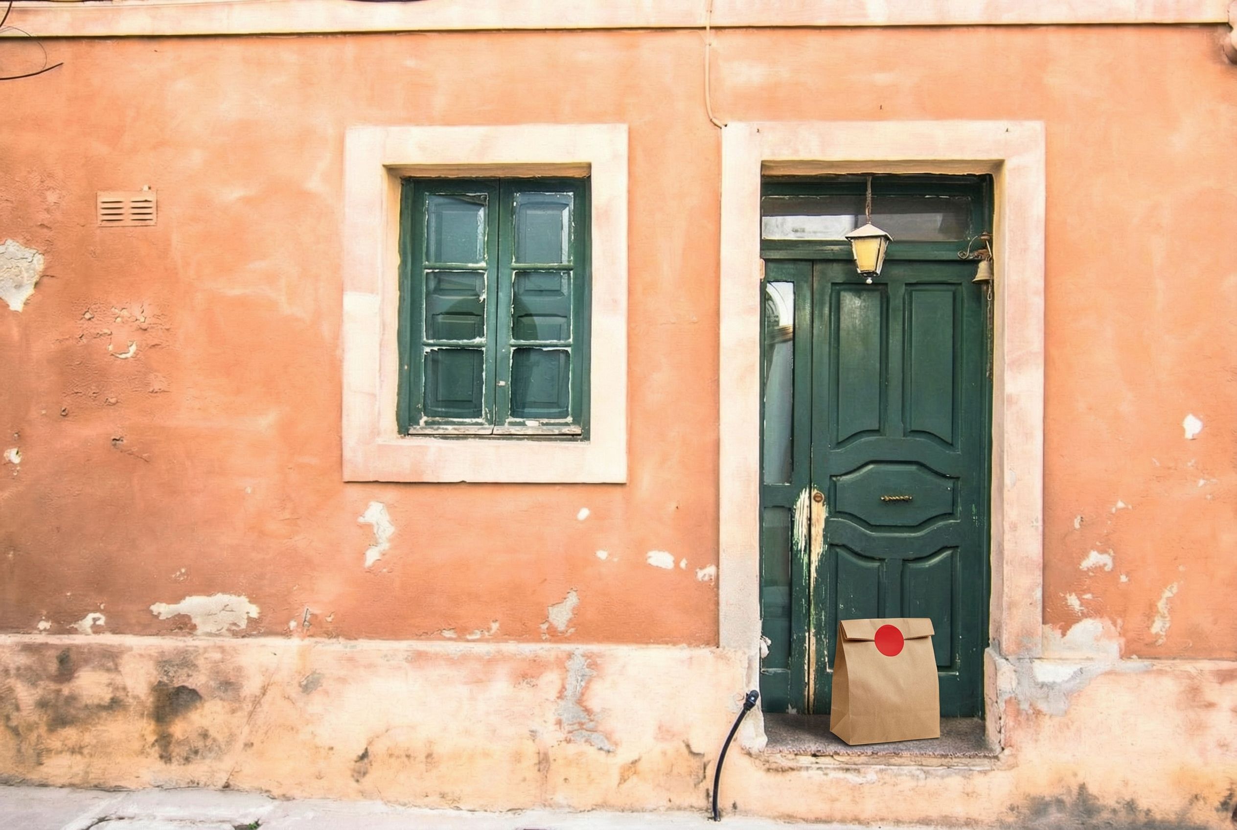 “In this existing photo, add a food delivery paper bag on the ground right in front of the door. The bag should be a small brown paper bag with a solid plain red sticker on the top keeping it closed. Preserve existing photo style and lighting as much as possible.”