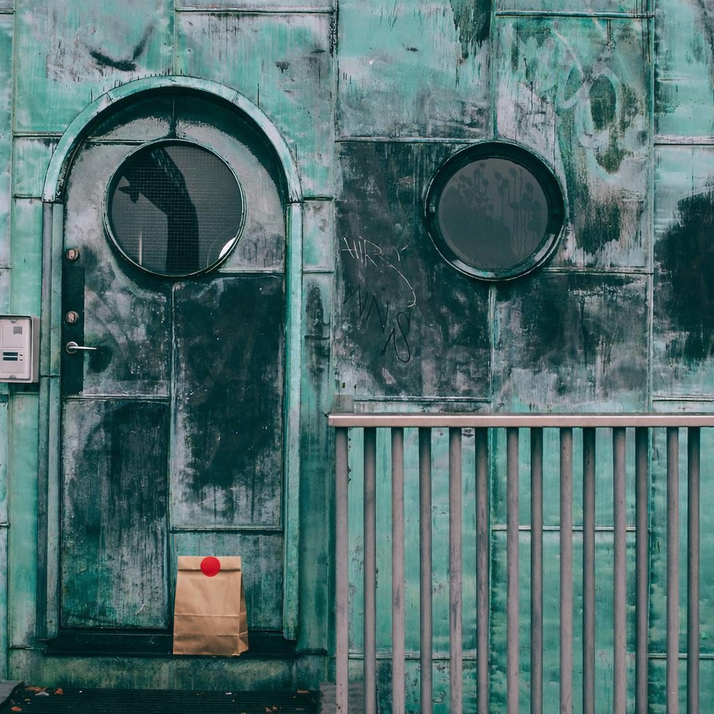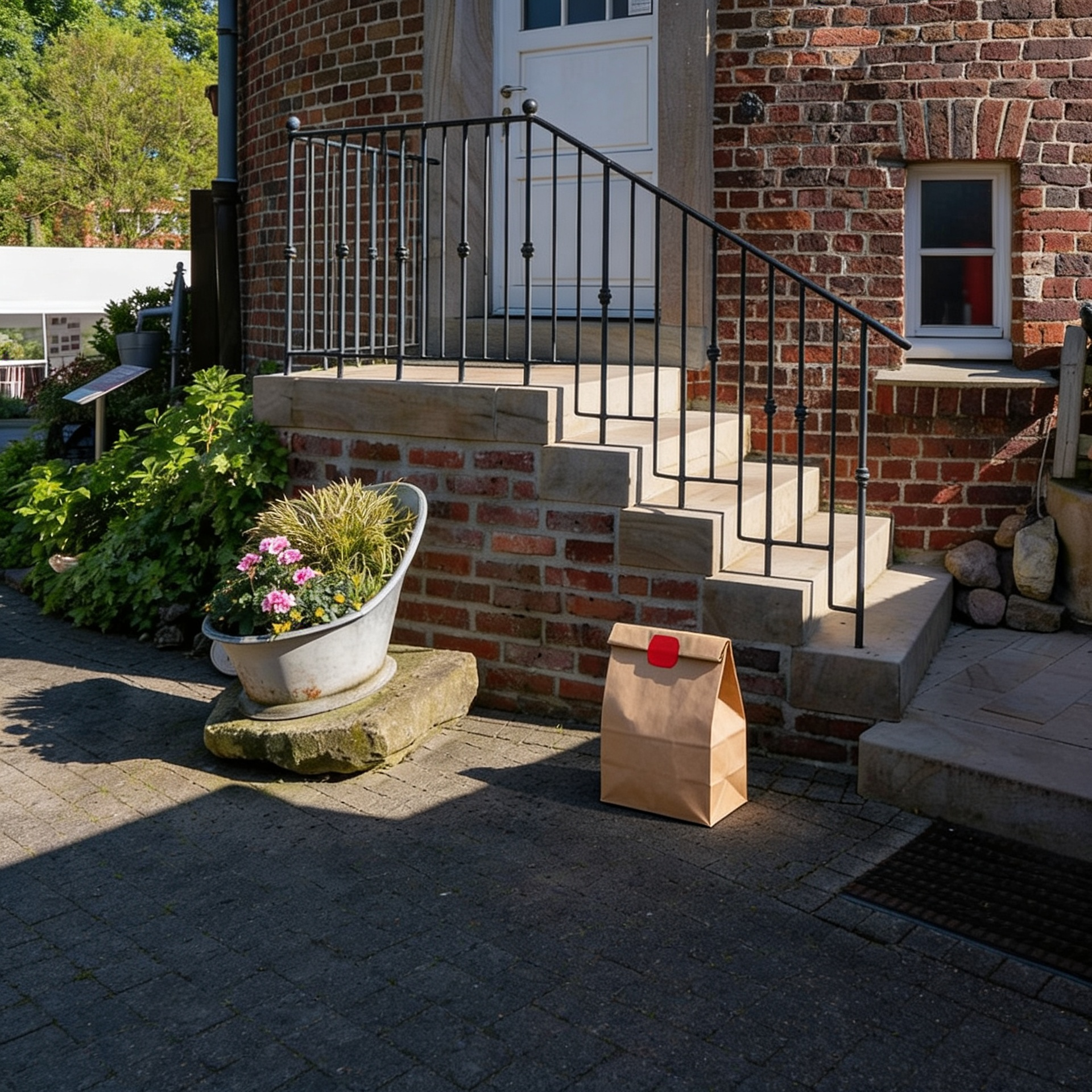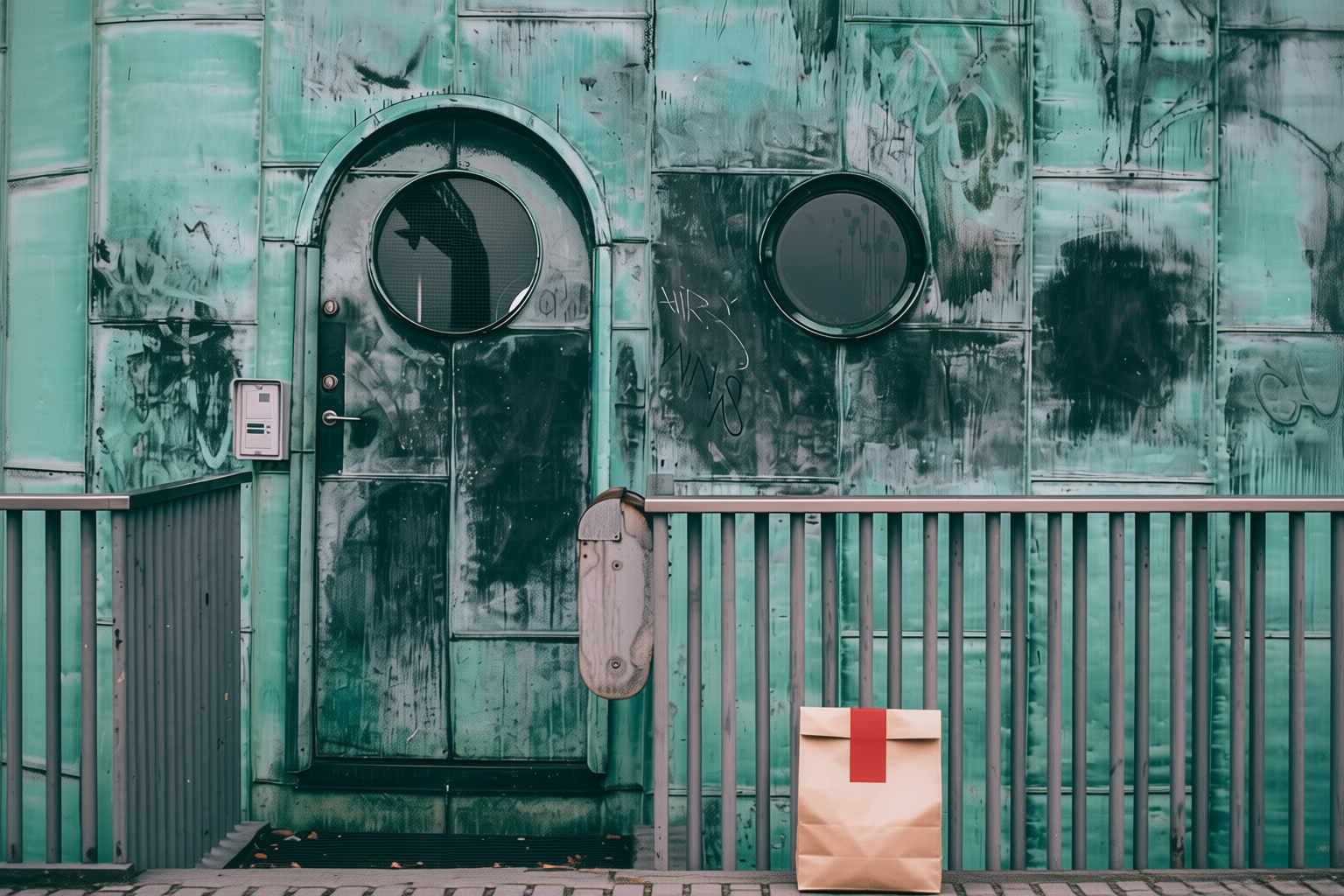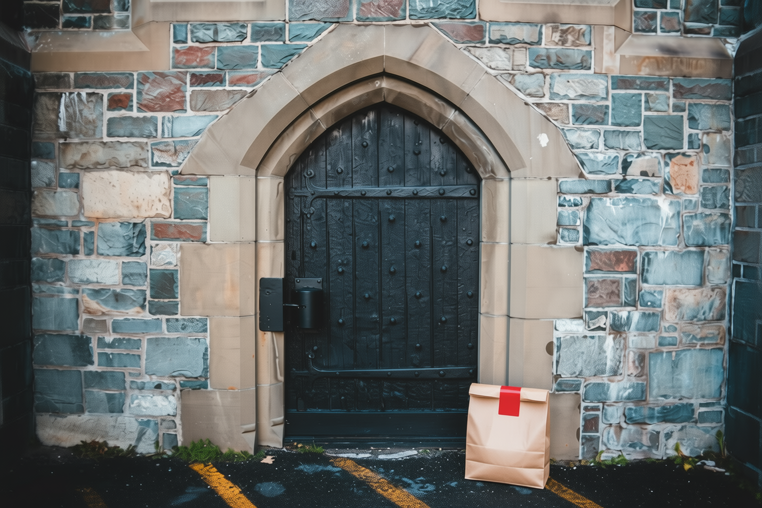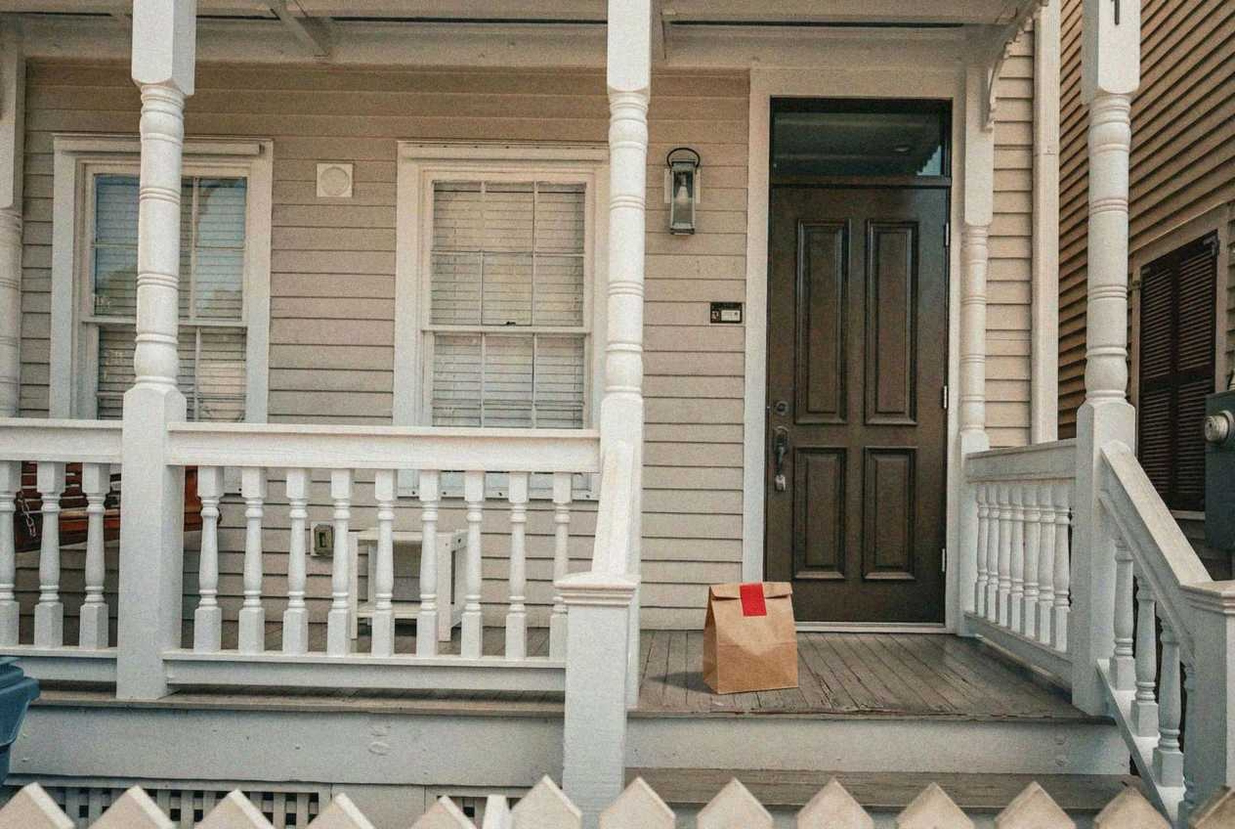 “In this existing photo, add a food delivery paper bag on the ground right in front of the door. The bag should be a small brown paper bag with a solid plain red sticker on the top keeping it closed. Preserve existing photo style and lighting as much as possible.”