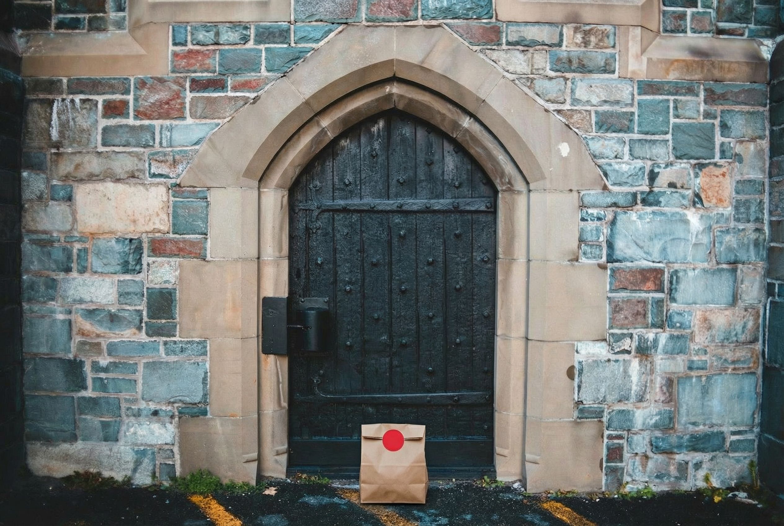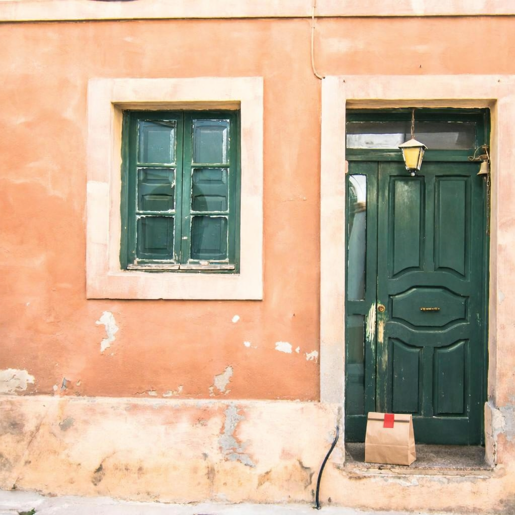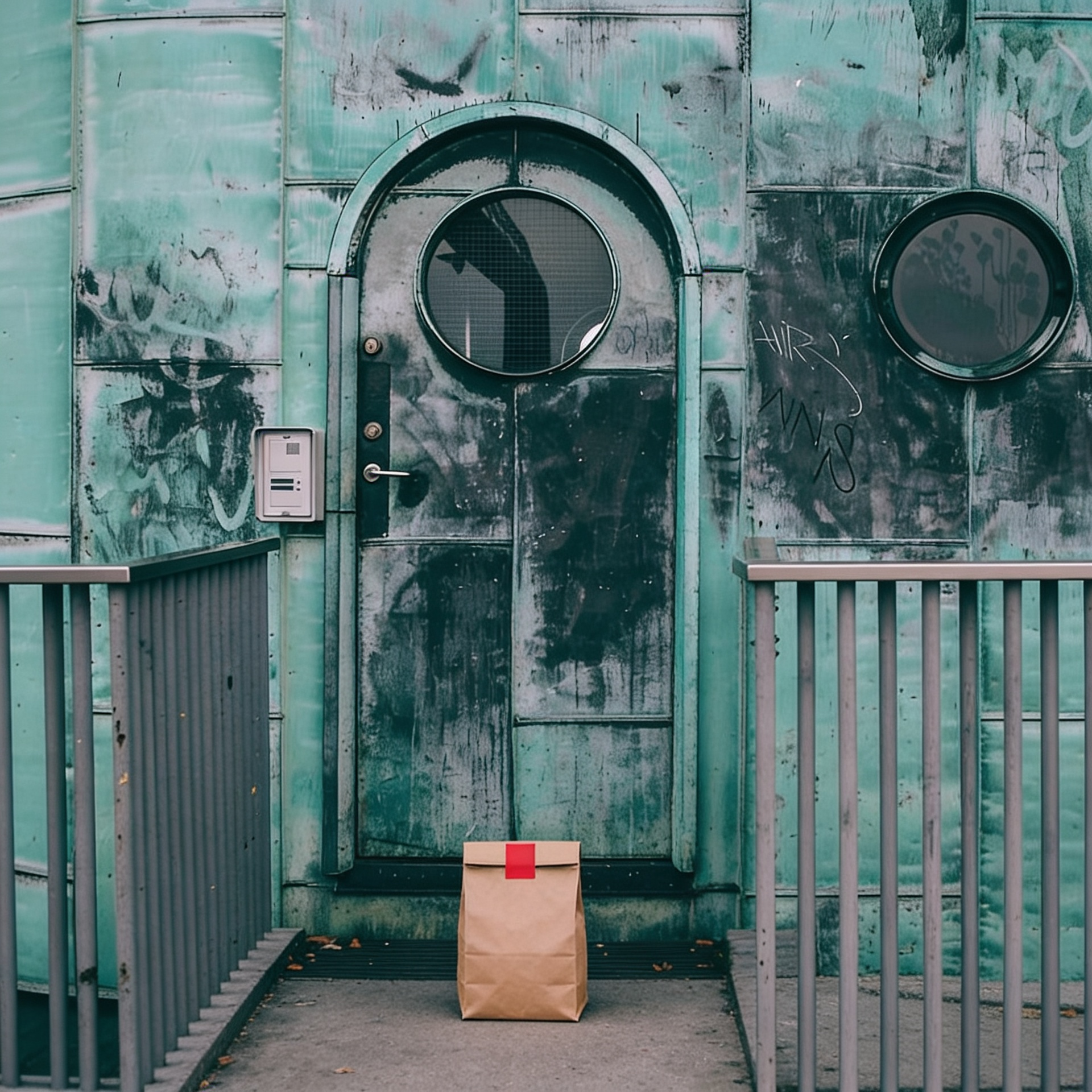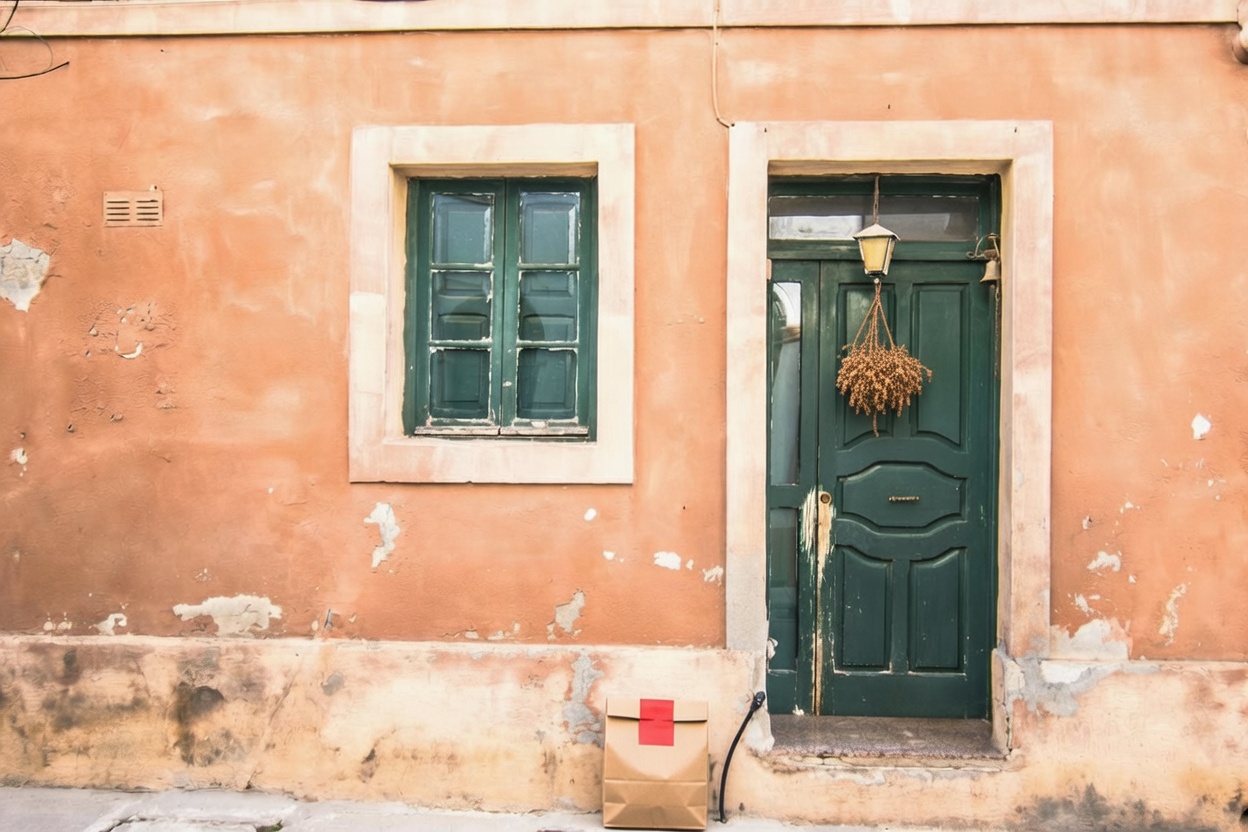 “In this existing photo, add a food delivery paper bag on the ground right in front of the door. The bag should be a small brown paper bag with a solid plain red sticker on the top keeping it closed. Preserve existing photo style and lighting as much as possible.”