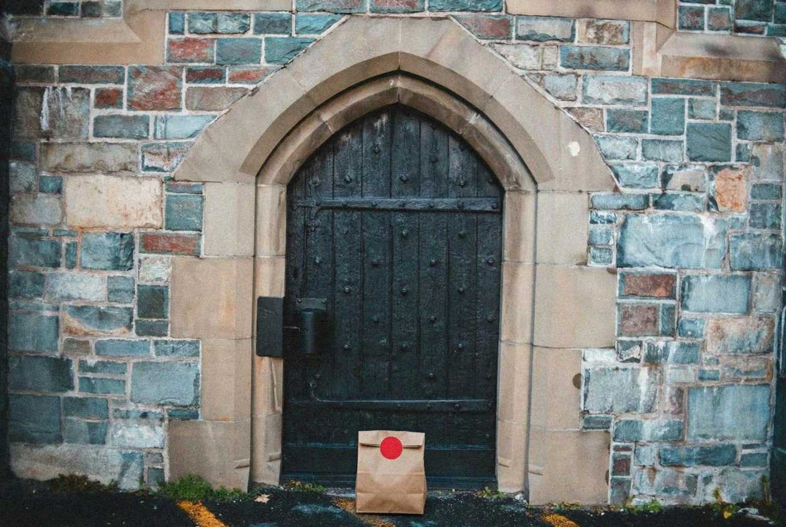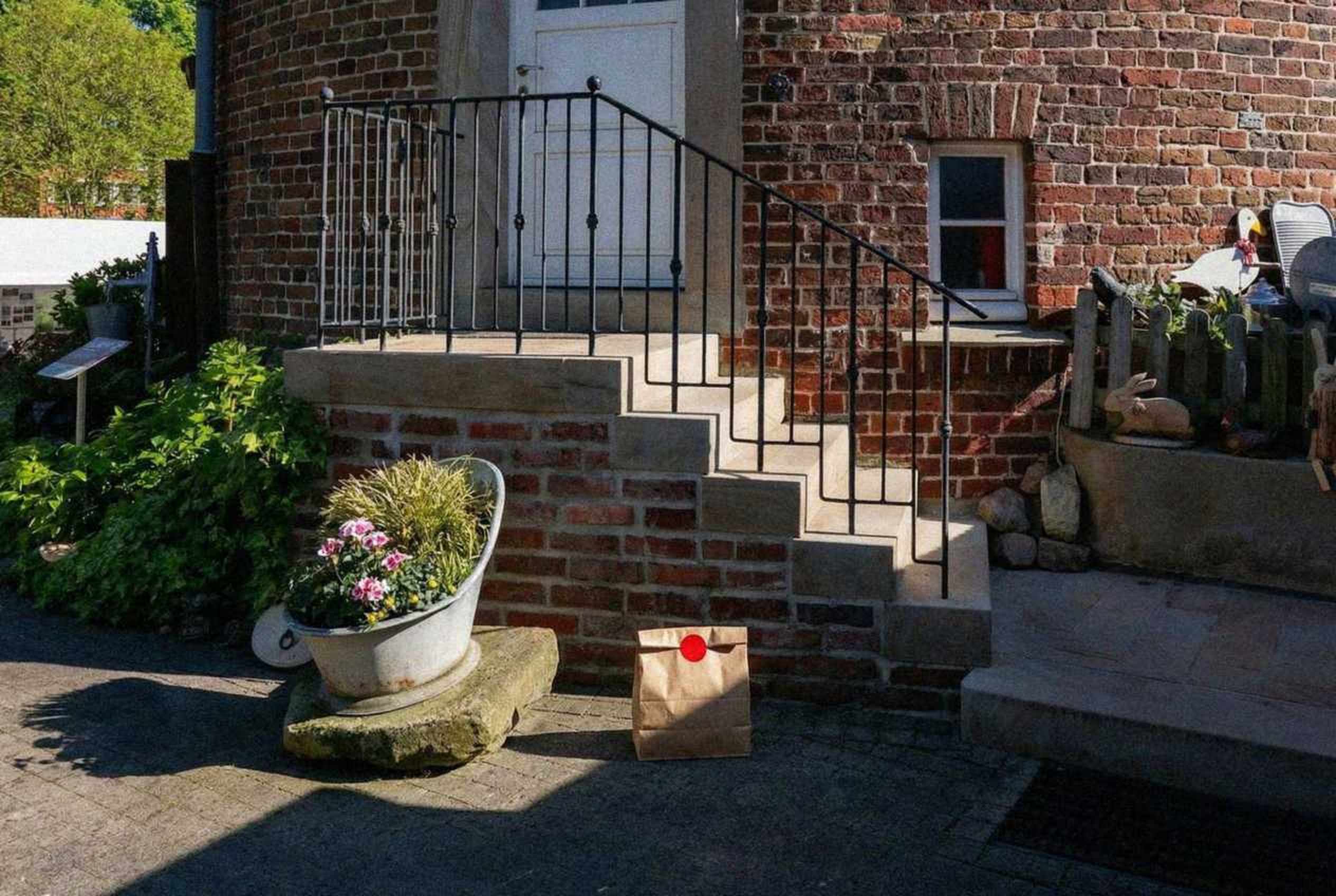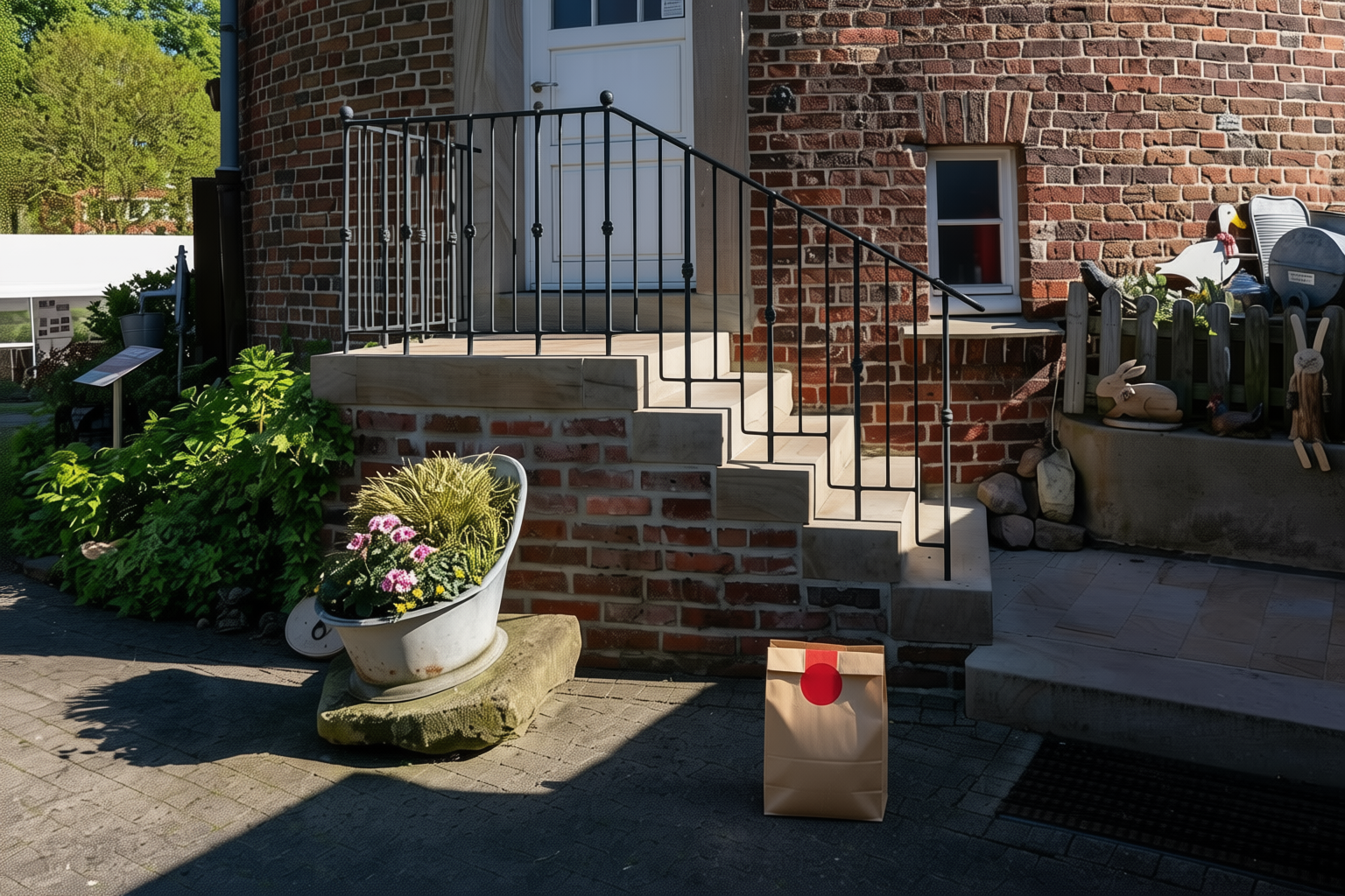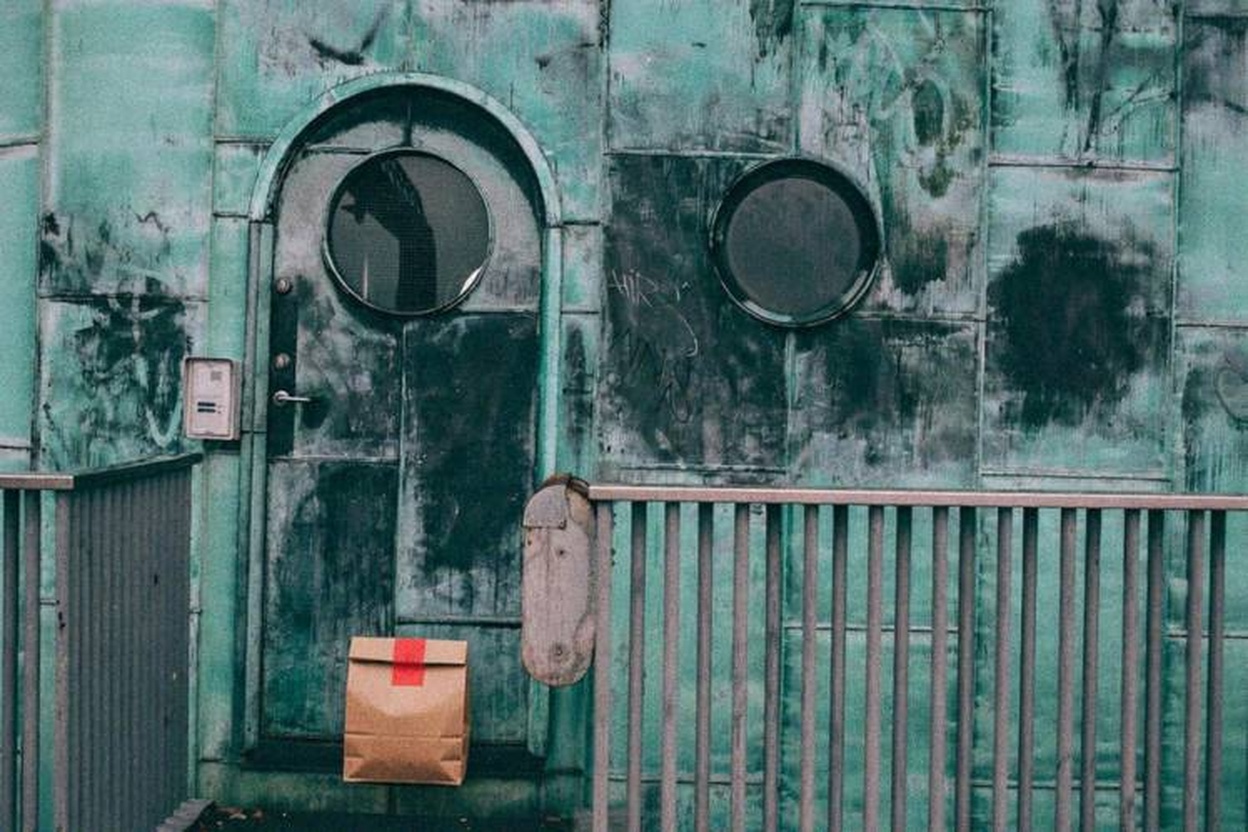 “In this existing photo, add a food delivery paper bag on the ground right in front of the door. The bag should be a small brown paper bag with a solid plain red sticker on the top keeping it closed. Preserve existing photo style and lighting as much as possible.”
