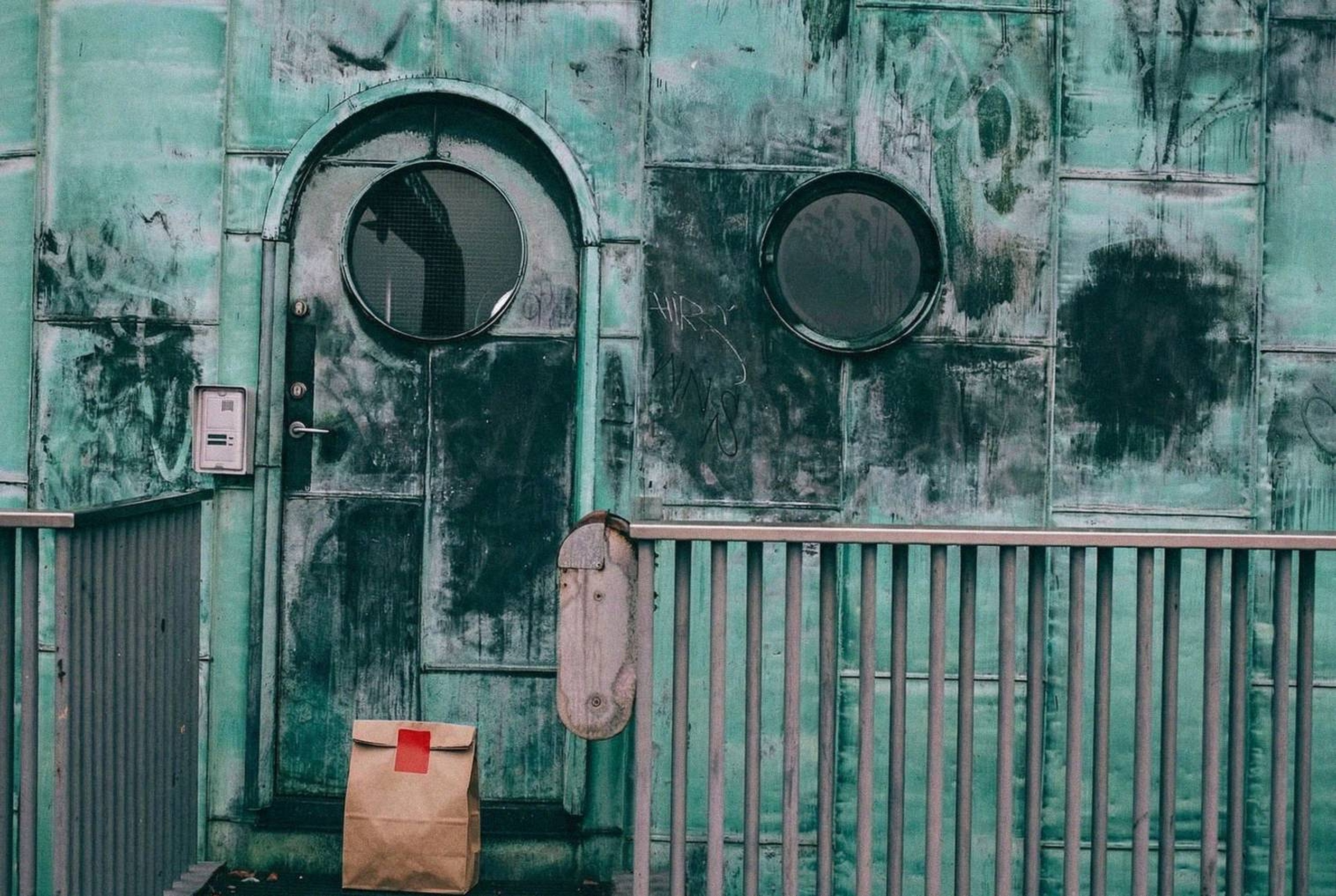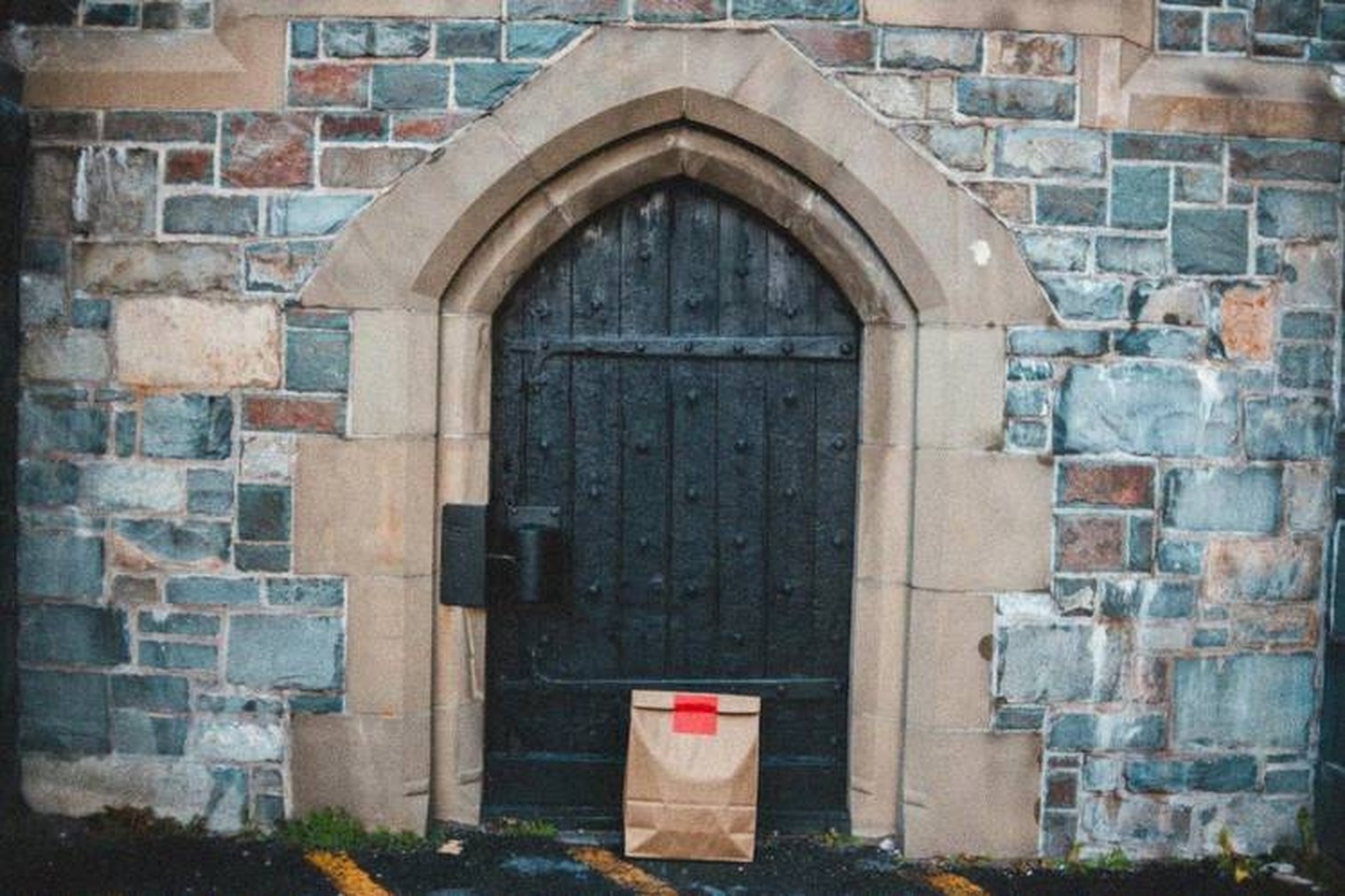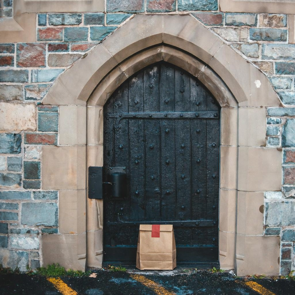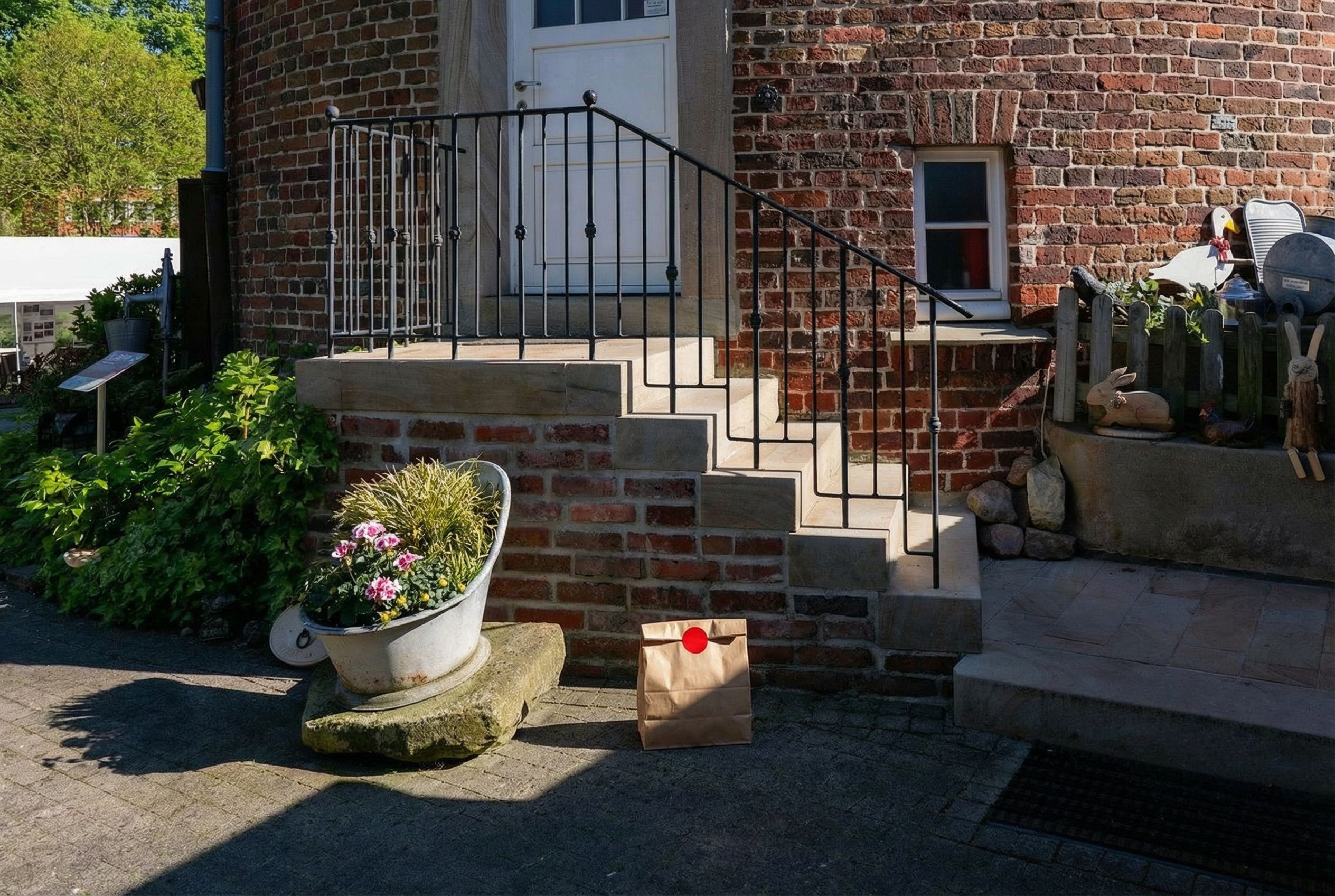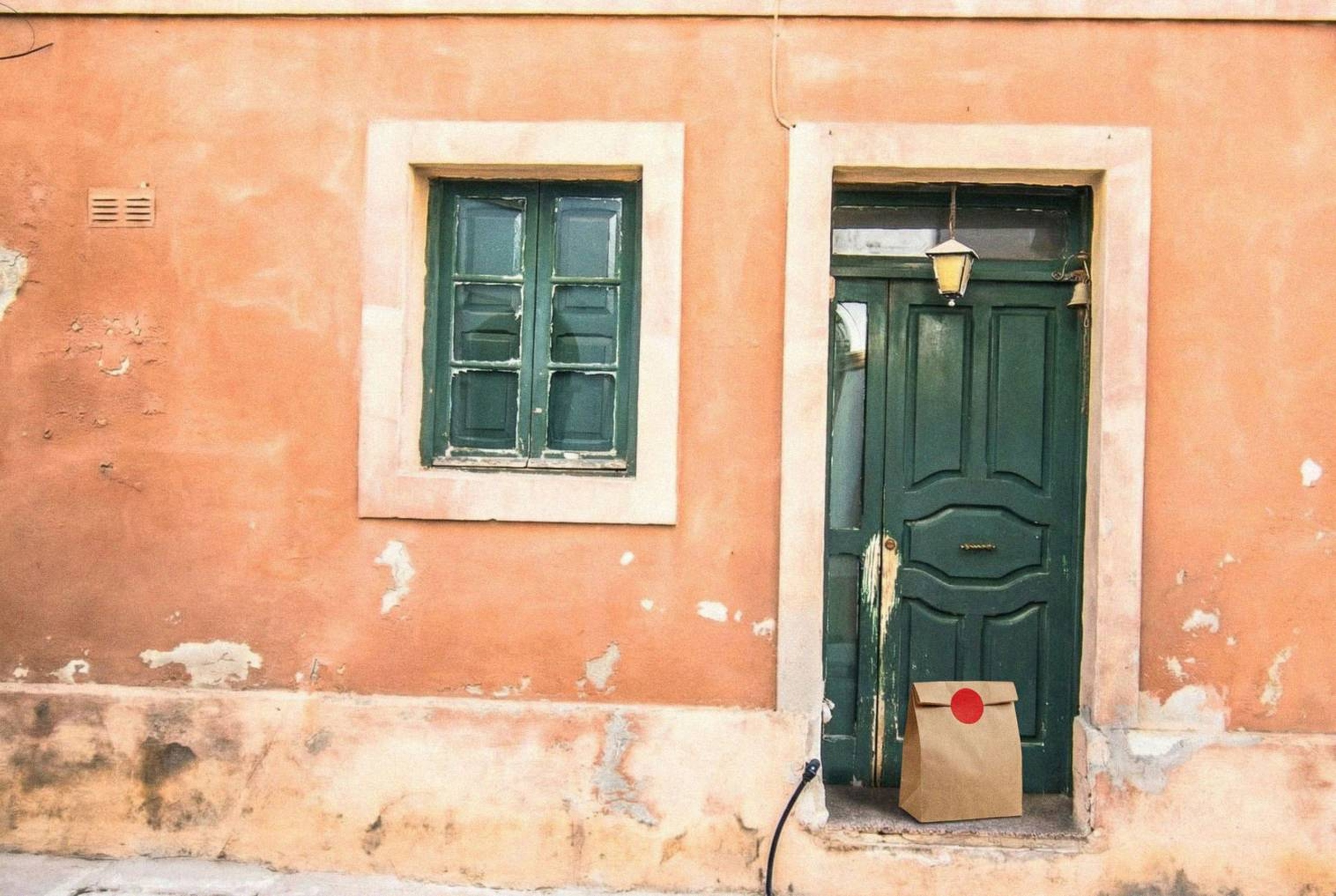 “In this existing photo, add a food delivery paper bag on the ground right in front of the door. The bag should be a small brown paper bag with a solid plain red sticker on the top keeping it closed. Preserve existing photo style and lighting as much as possible.”