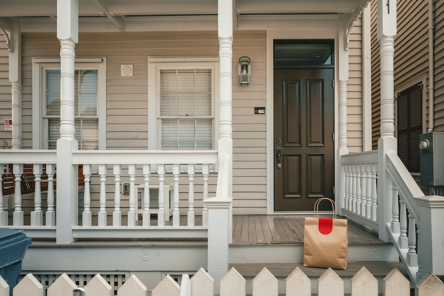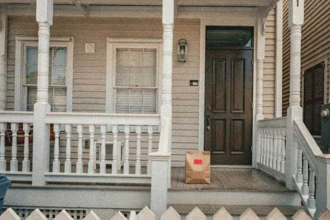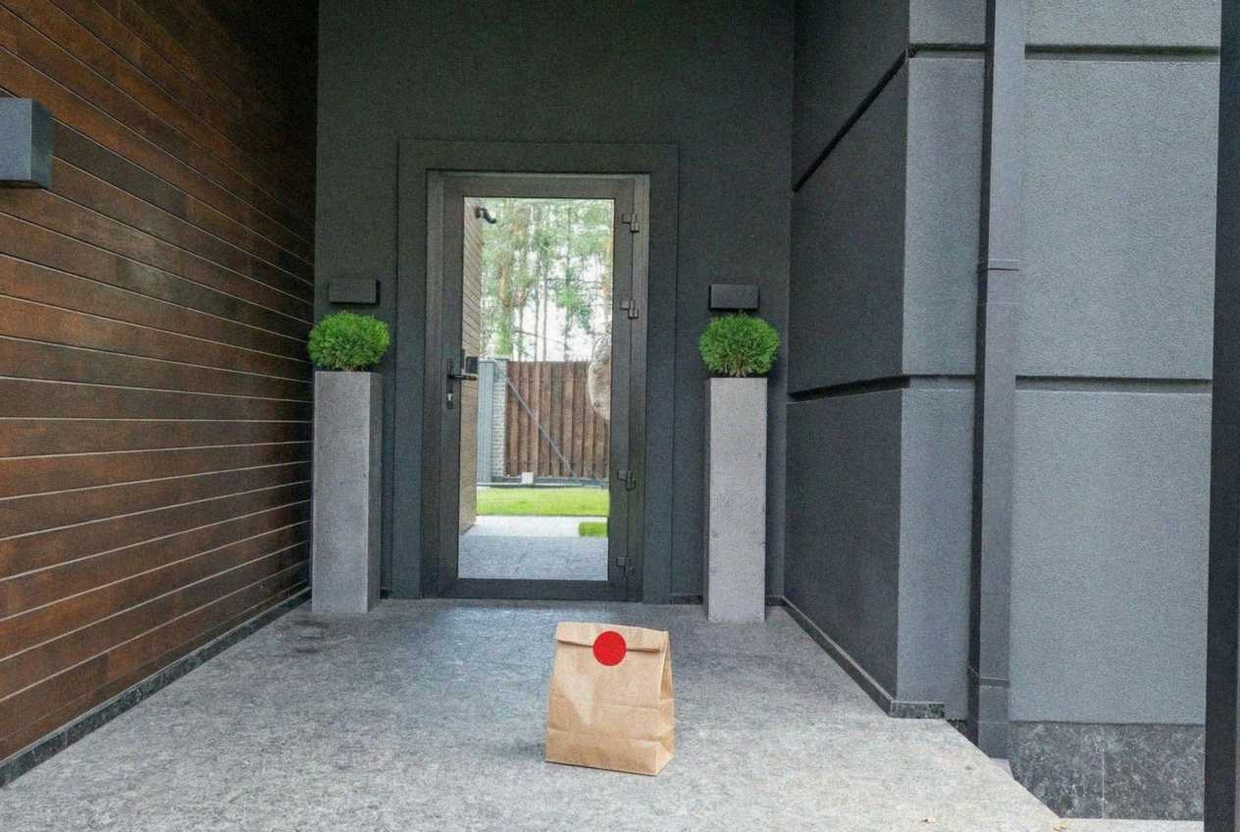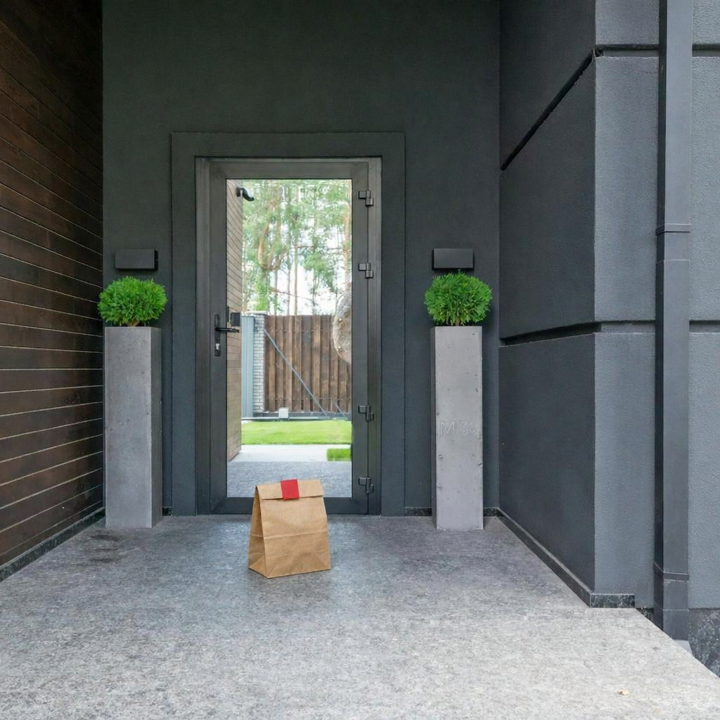 Delivery: We took real front door photos and used AI to add a fake delivery bag to the photo.