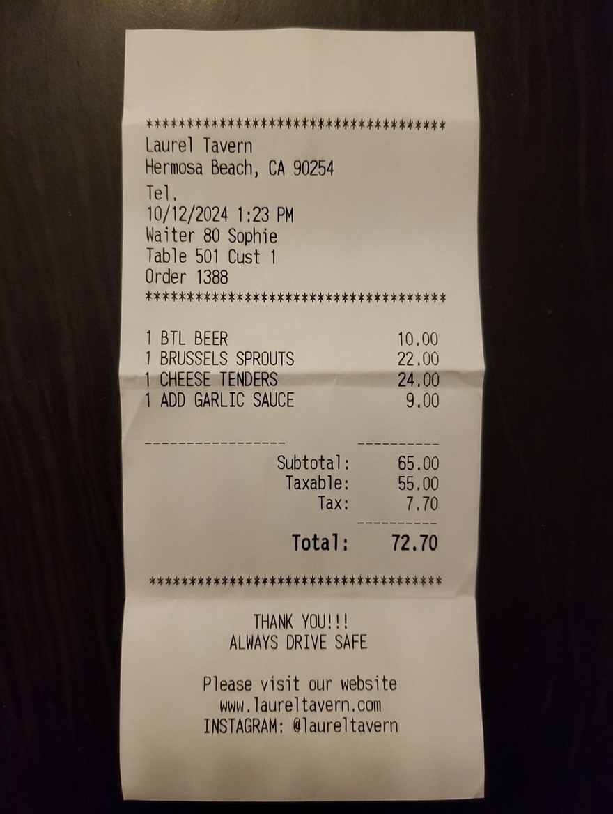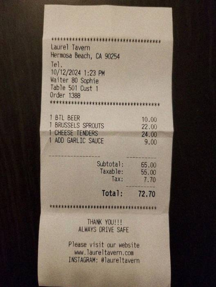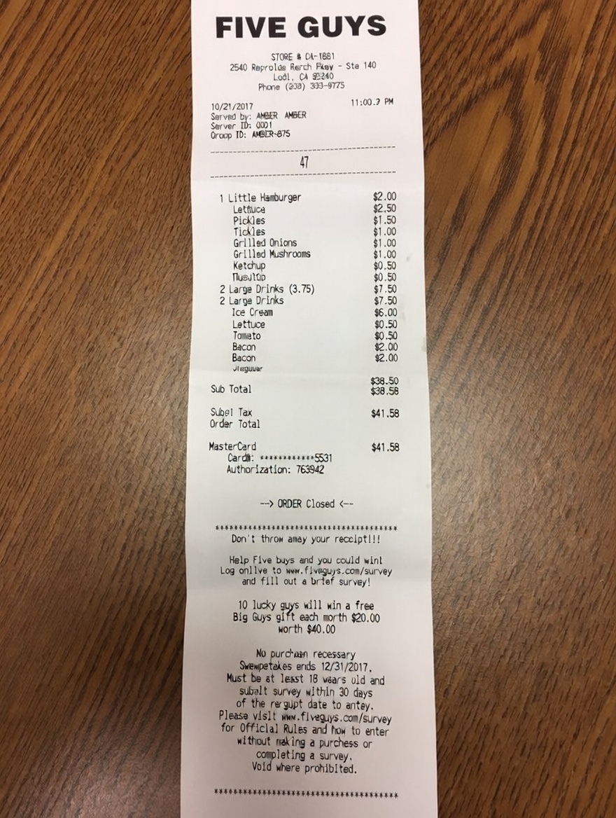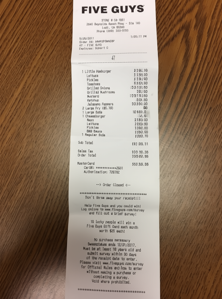 “Edit this receipt image to exactly double the total amount and all intermediate monetary values, including line item prices, subtotal, tax amount, total, and any other amount necessary. Keep everything else in the photo exactly the same.”