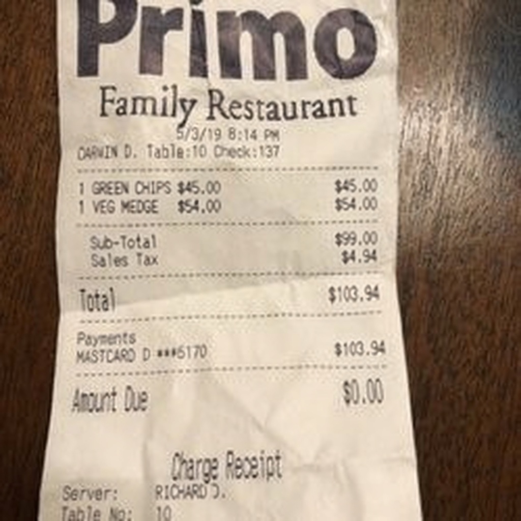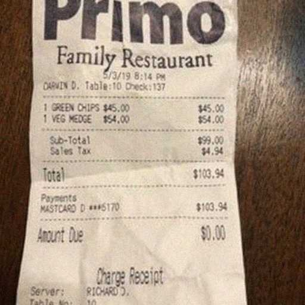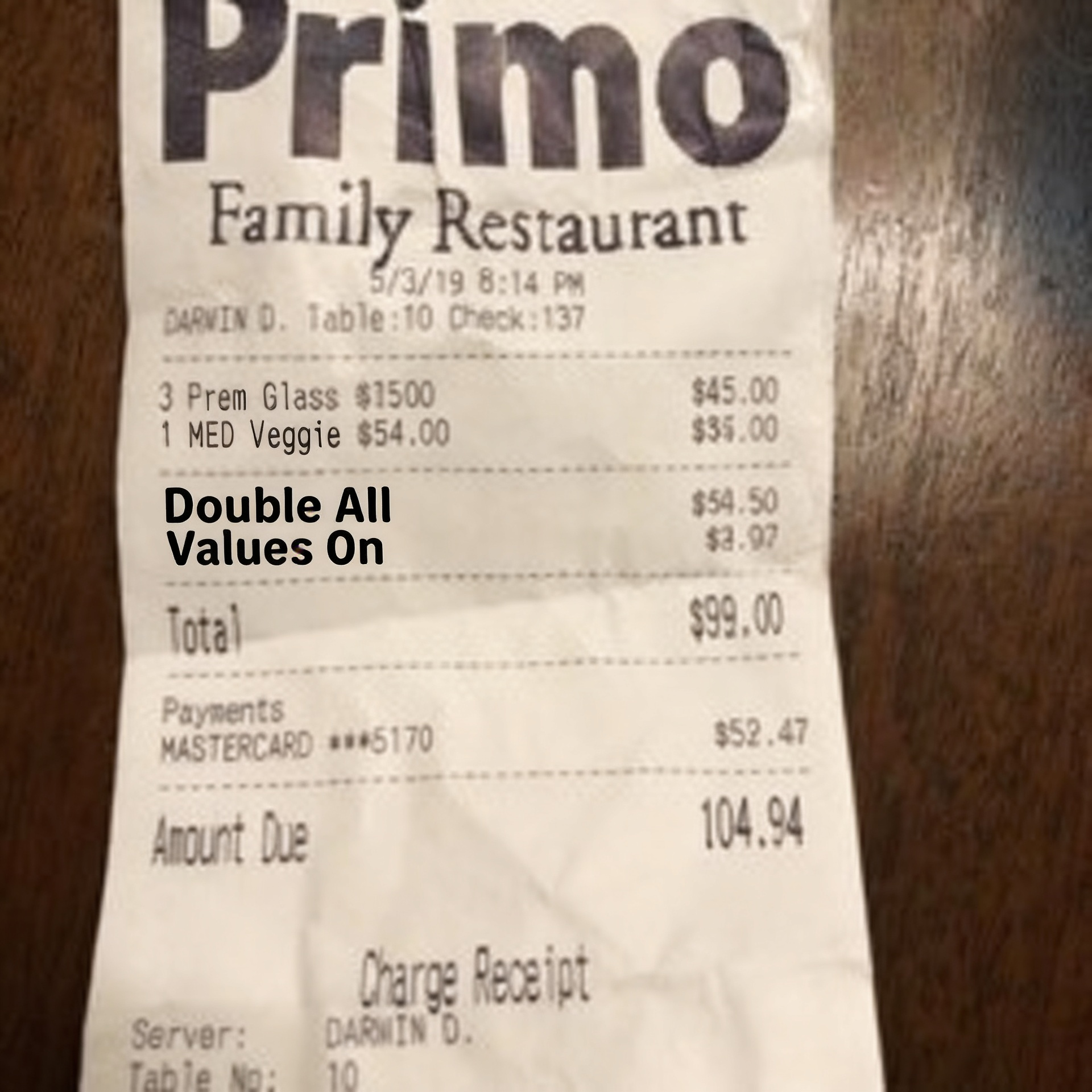 “Edit this receipt image to exactly double the total amount and all intermediate monetary values, including line item prices, subtotal, tax amount, total, and any other amount necessary. Keep everything else in the photo exactly the same.”