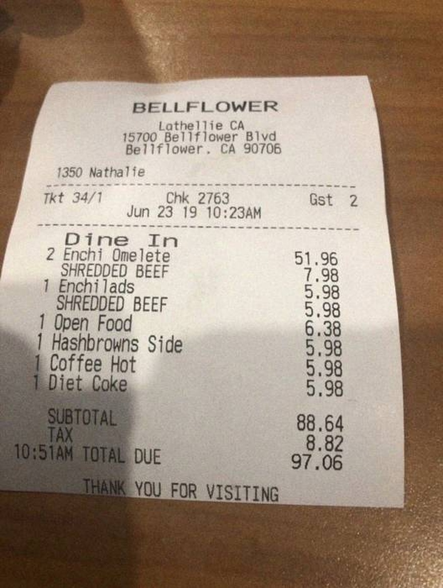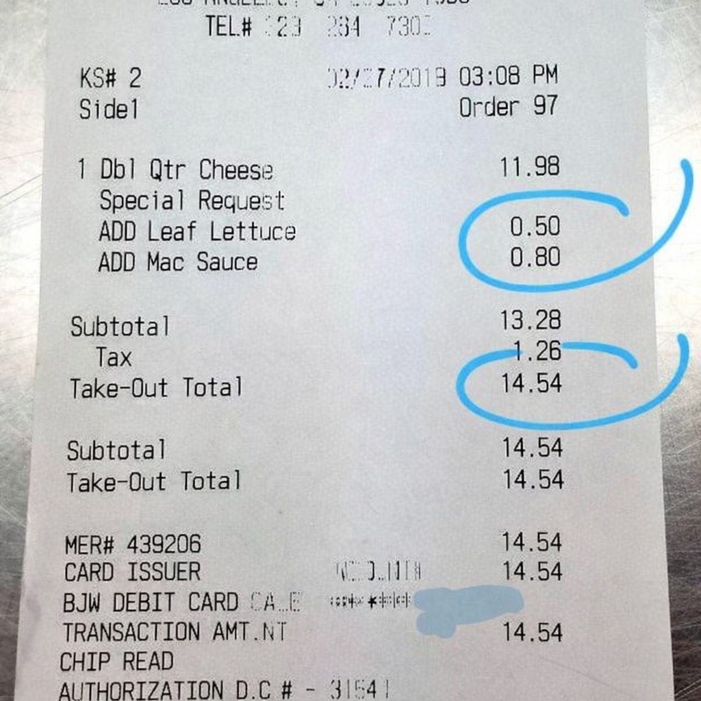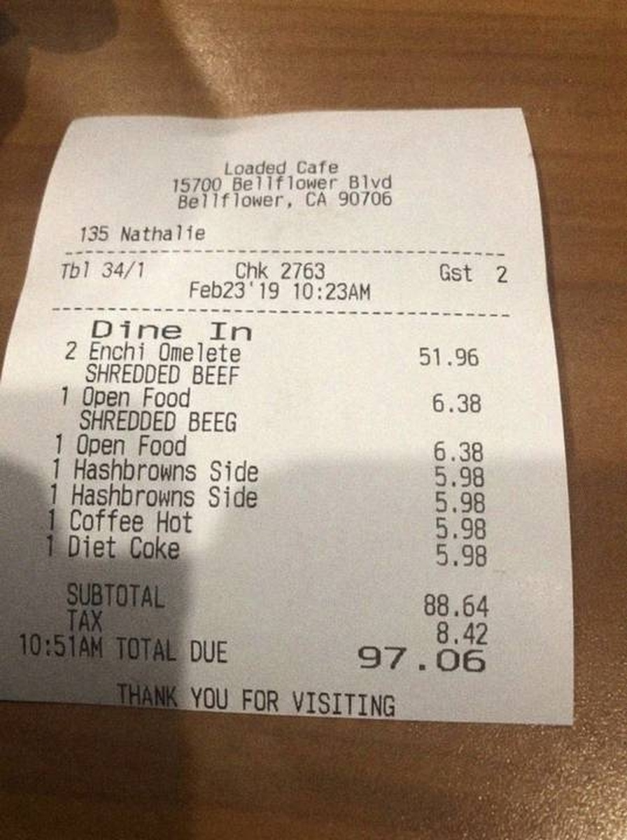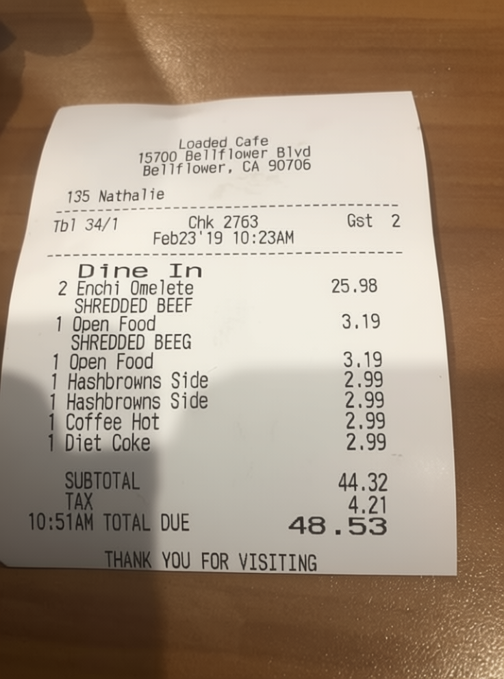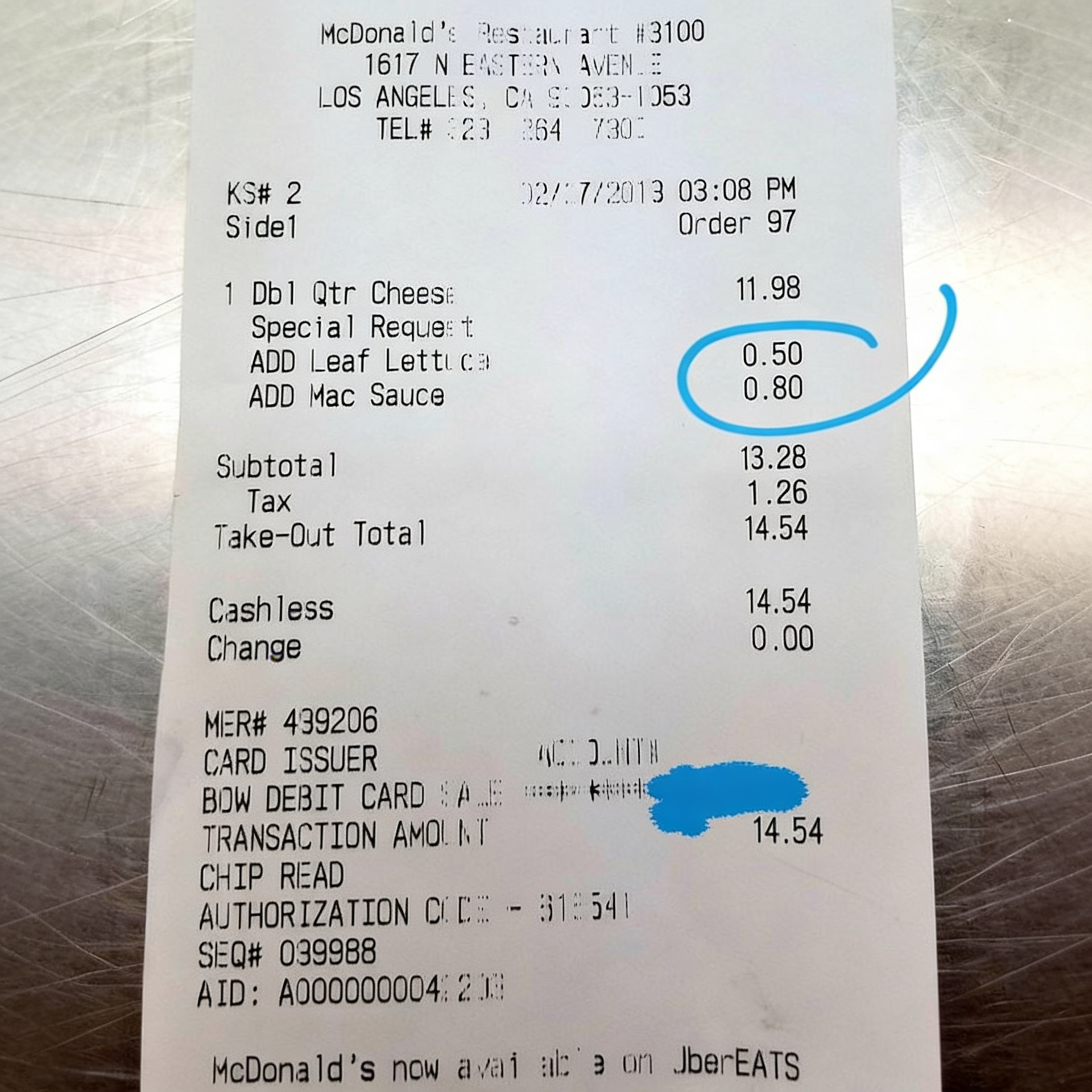 “Edit this receipt image to exactly double the total amount and all intermediate monetary values, including line item prices, subtotal, tax amount, total, and any other amount necessary. Keep everything else in the photo exactly the same.”